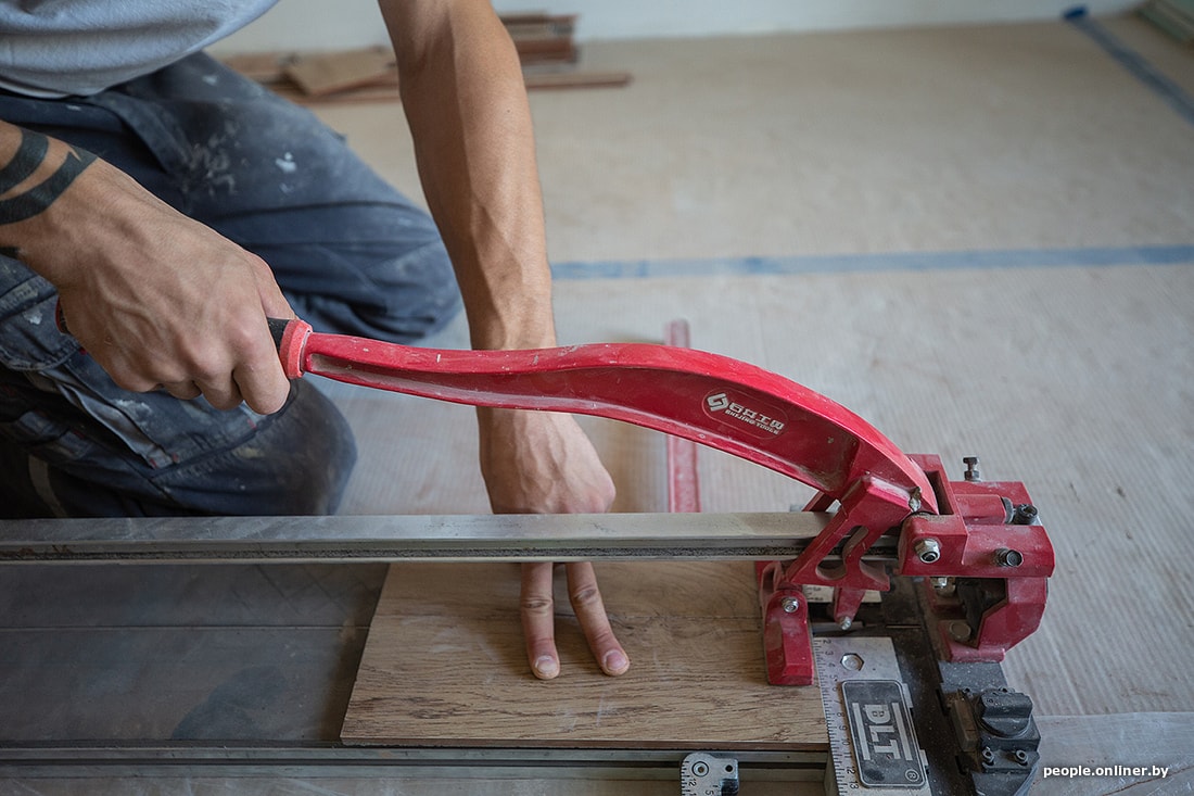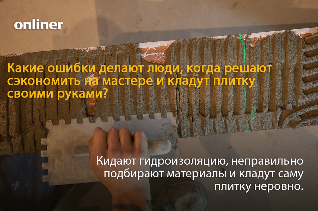 Минимальный набор инструментов для начинающего плиточника — это плиткорез (название говорит само за себя); миксер (перфоратор с венчиком), которым замешивают клей для плитки; угловая шлифмашинка либо болгарка, чтобы резать плитку в двух направлениях, например криволинейно; из мелочей —лазерный нивелир (или осепостроитель) и система выравнивания (СВП) для плитки широкого формата, которая «запекается» на производстве и идет с небольшими неровностями, выпуклостями. Сегодня это можно исправить: система выпрямляет плитку на стене, пока клей не засох. Высокие технологии (смеется. — Прим. Onliner)! Я думаю, новичку хватит рублей 800, чтобы взять минимум инструментов на первое время и начать работать на себя: дешевый плиткорез за 150 рублей, болгарку за 150—200 и миксер за 500. Этот инструмент отобьется очень быстро, уже за месяц, если хорошо работать. Я так и начинал. Своего инструмента у меня не было. Начинал с минимума и постепенно докупал необходимое.
