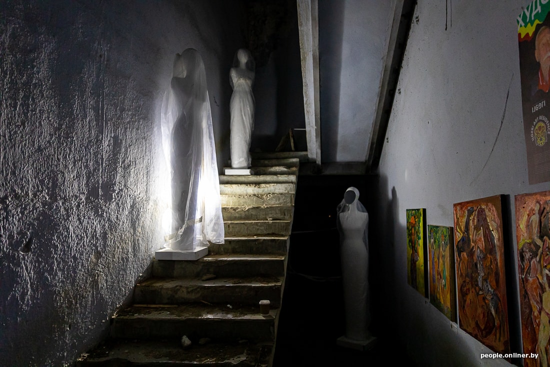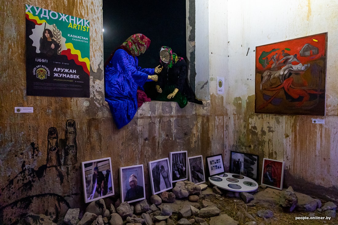 Тут же, в заброшенном кирпичном здании, где по ночам народ сходит с ума на рейвах, днем можно посмотреть на современное искусство Кыргызстана и соседних стран. Местами выглядит жутковато, но в целом много классных и смелых идей. Вот человек из газеты, который прилип к экрану телевизора под гнетом сладкой пропаганды. Вот стрит-арт от местной звезды под псевдонимом Chervi, а это странные фигуры с зеркалами вместо лиц.
