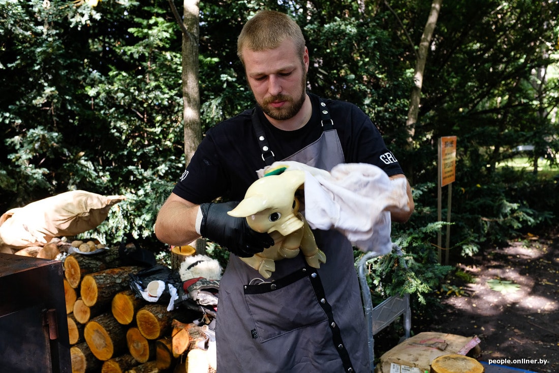 С такими медленными темпами приготовления не обойтись без толковых соратников, сегодня Илье помогает Никита: следит за температурой в фаербоксе и очерняет кукурузу. Вместе с напарником за сутки ребята могут закоптить пол-тонны мяса, в первый день фестиваля — 250 килограмм.