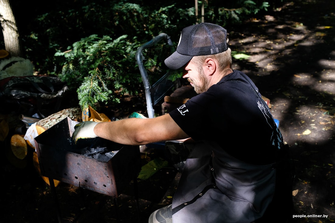 — Я вообще никак с кулинарным делом не связан, в грузоперевозках был. Мы с женой к Илье ездили шашлыка покушать, и вкуснее, чем у него, я нигде не пробовал. А потом узнал, что он ищет помощника — и вот я здесь. Не спать я привык еще раньше, когда за сутки проезжал 800—1200 километров. Человек же такая скотина, что привыкает ко всему, а опыт — он, как половое бессилие, приходит с годами, — рассказывает напарник Ильи Никита.