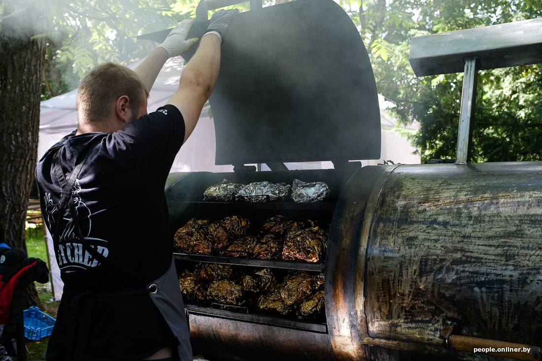 Илье Надееву 36 лет, он в шутку называет себя «кричевским колхозником», но на деле парень профессионально коптит все, что помещается в его 4-метровый смокер, начиная от икринки и улитки, заканчивая бобрами, а также несет знания и навыки в массы, обучая этой технологии желающих. Да и смокеры тоже разрабатывает и продает. На фестивале работают ребята совместно с St. Catering. Схема следующая: Илья с помощником Никитой отвечают за еду, а кейтеринг — за организацию и оформление продуктов.