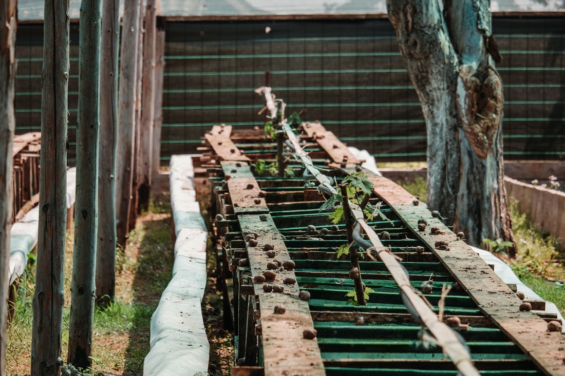 Ферма, в которой размножаются и растут улитки, — это длинные бетонные «загончики», заросшие зеленью. Сверху — система полива (улитки любят влагу) и защитная сетка: нежные создания не должны перегреваться на солнце.