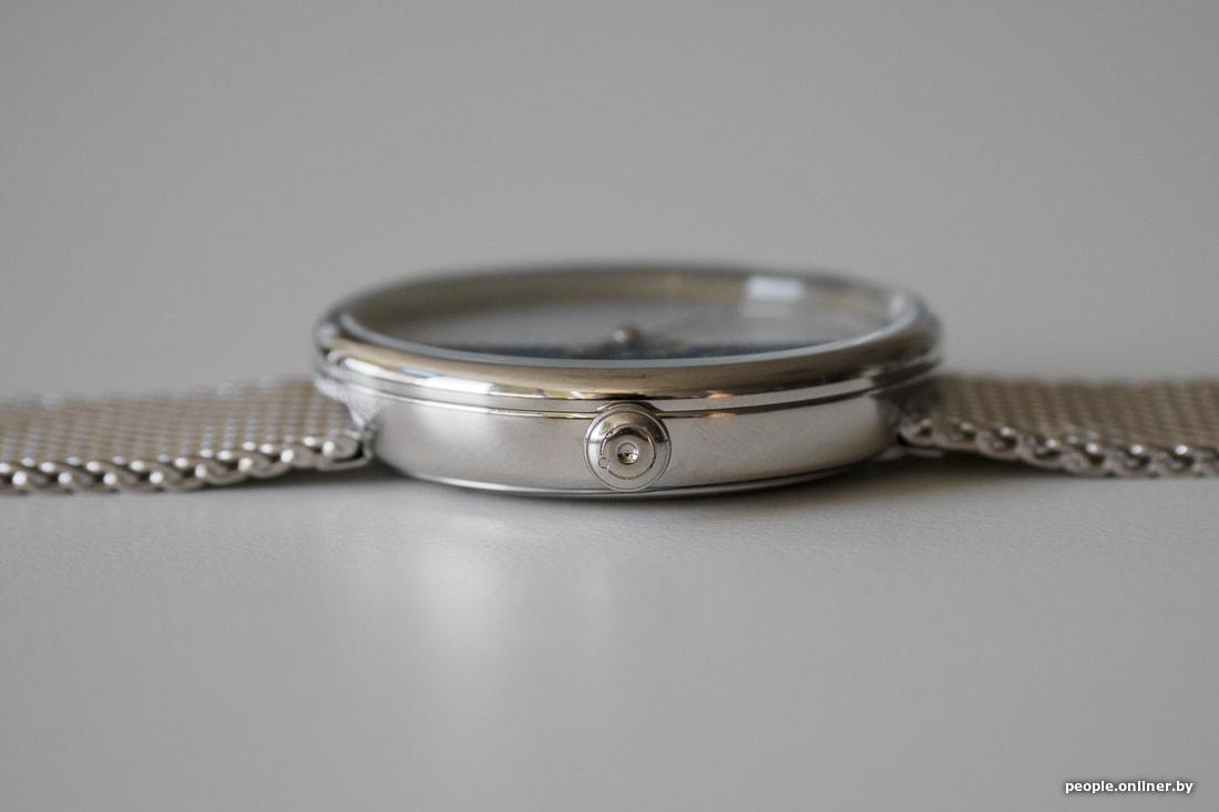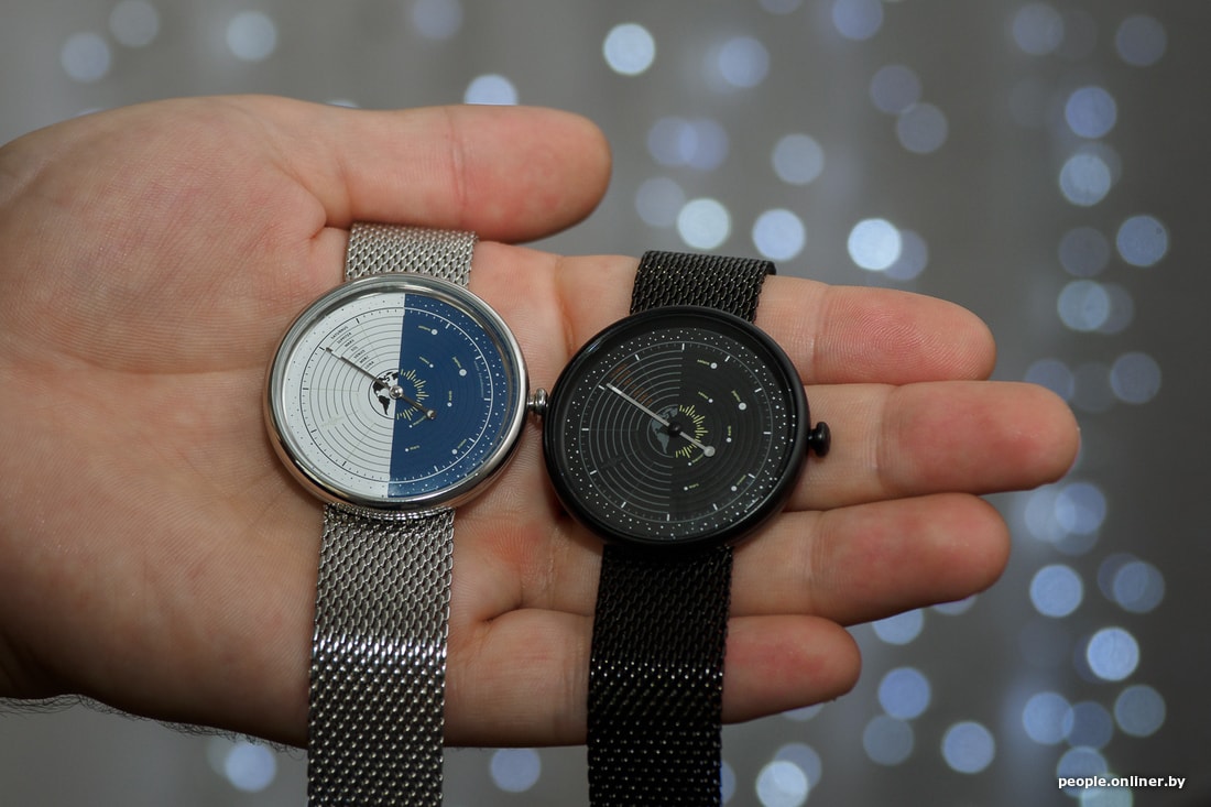 Механизм кварцевый, Ronda 762, с одной стрелкой. Это усложняет использование часов по назначению — по крайней мере, первое время, но зато делает дизайн очень необычным. Точки планет и стрелки красиво светятся в темноте. Размер корпуса — чуть больше 40 миллиметров, а назначение снова универсальное: подойдет и мужчинам, и женщинам. Браслет миланский, с раскладным замком. Стекло минеральное. Выпускаются в серебристом цвете с бело-синим циферблатом, а также в более сдержанном полностью черном исполнении.