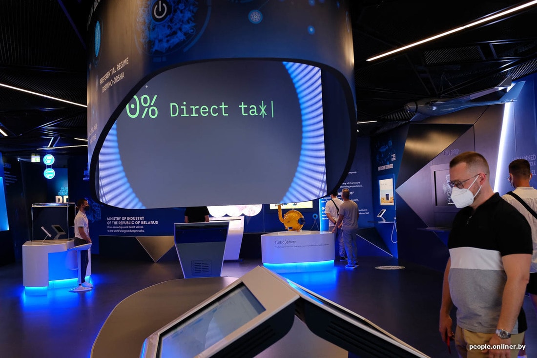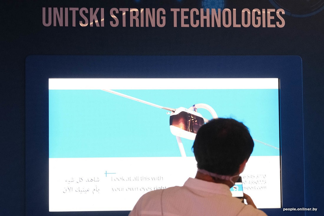 Внутри несколько зон. Пару стендов о технологической гордости страны: Synesis, VironIT, OneSoil, Bamboo Group, Linev Group и… «Струнные технологии Юницкого». Желтый турбогенератор стоит на видном месте.