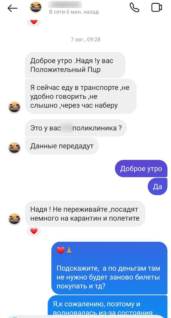 — В лаборатории сказали, что если в этот же день нам не позвонят, значит, все хорошо, мы можем лететь. Мы со спокойной душой вышли и собирались пойти за ваучерами, но не забрали, Татьяна из турфирмы сказала, что они будут позже, и предупредила, что, скорее всего, тесты сегодня сделать не успеют, потому что много людей их сдают, и результаты будут только 7 августа. Мы немножко напряглись, но подумали, что, возможно, это правда, так как людей на сдачу теста было в самом деле очень много.