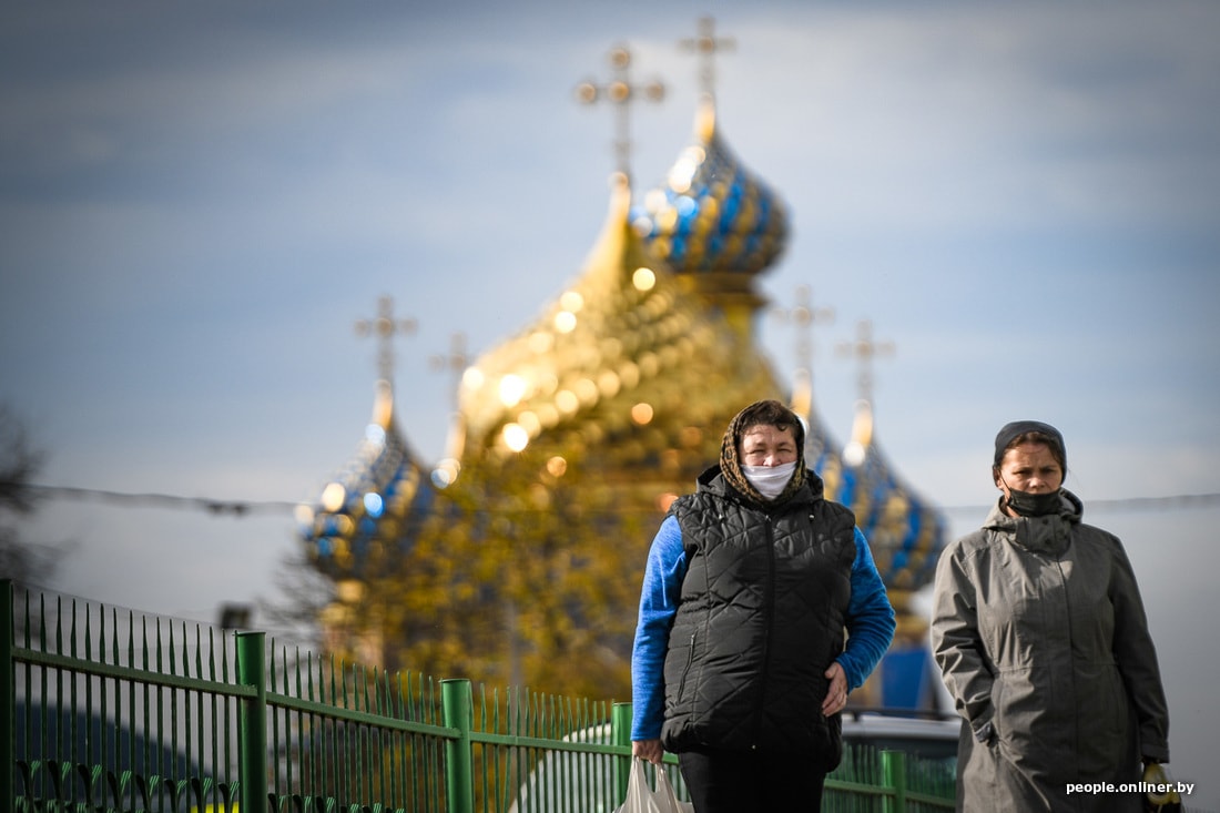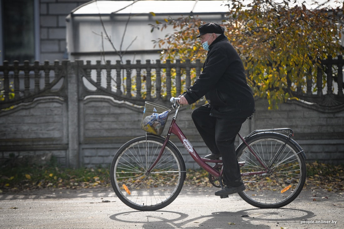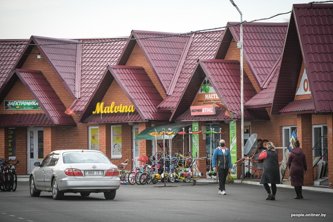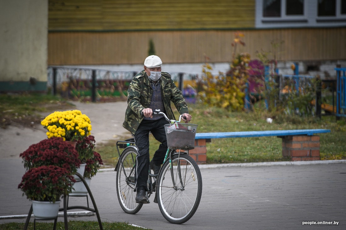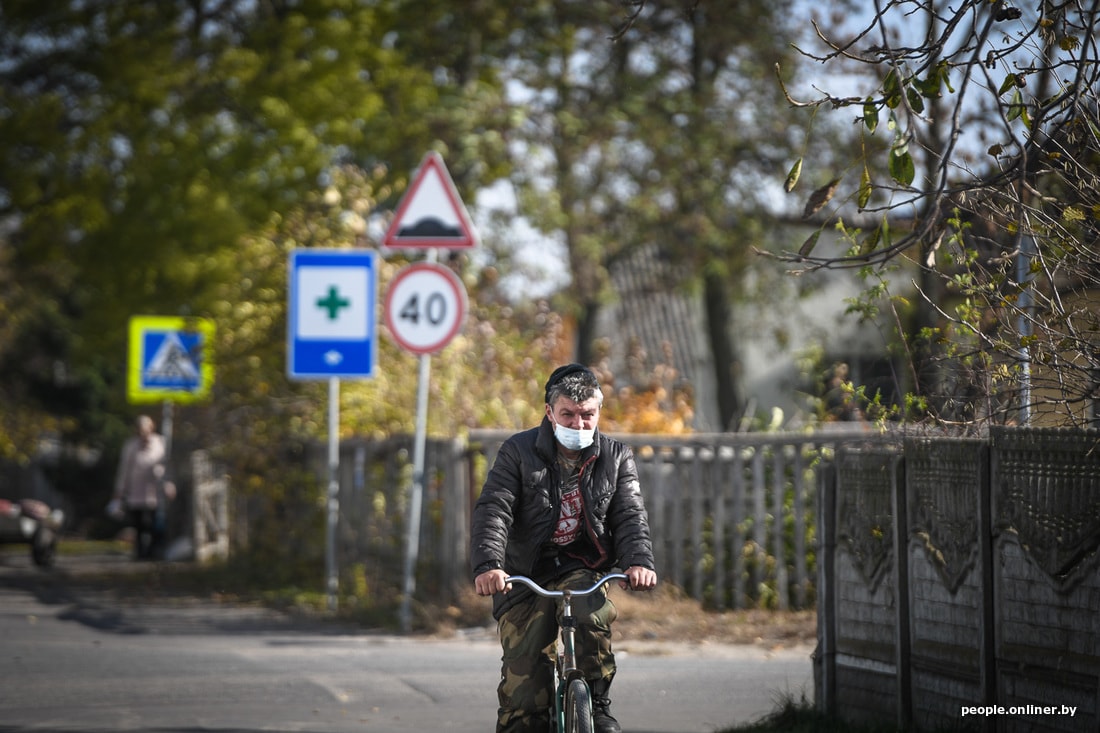 От поликлиники вдоль дороги отправляемся на тот самый закрытый рынок и разглядываем прохожих. Пока в Минске за отсутствие маски в метро можно было ненадолго встрять, здесь масочный режим соблюдали почти все, не важно, едешь ты на велосипеде по улице или в машине, просто гуляешь, ждешь автобуса или идешь в магазин — маски были почти у каждого жителя Ольшан.