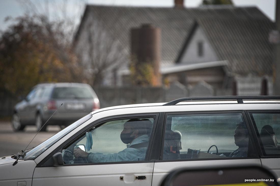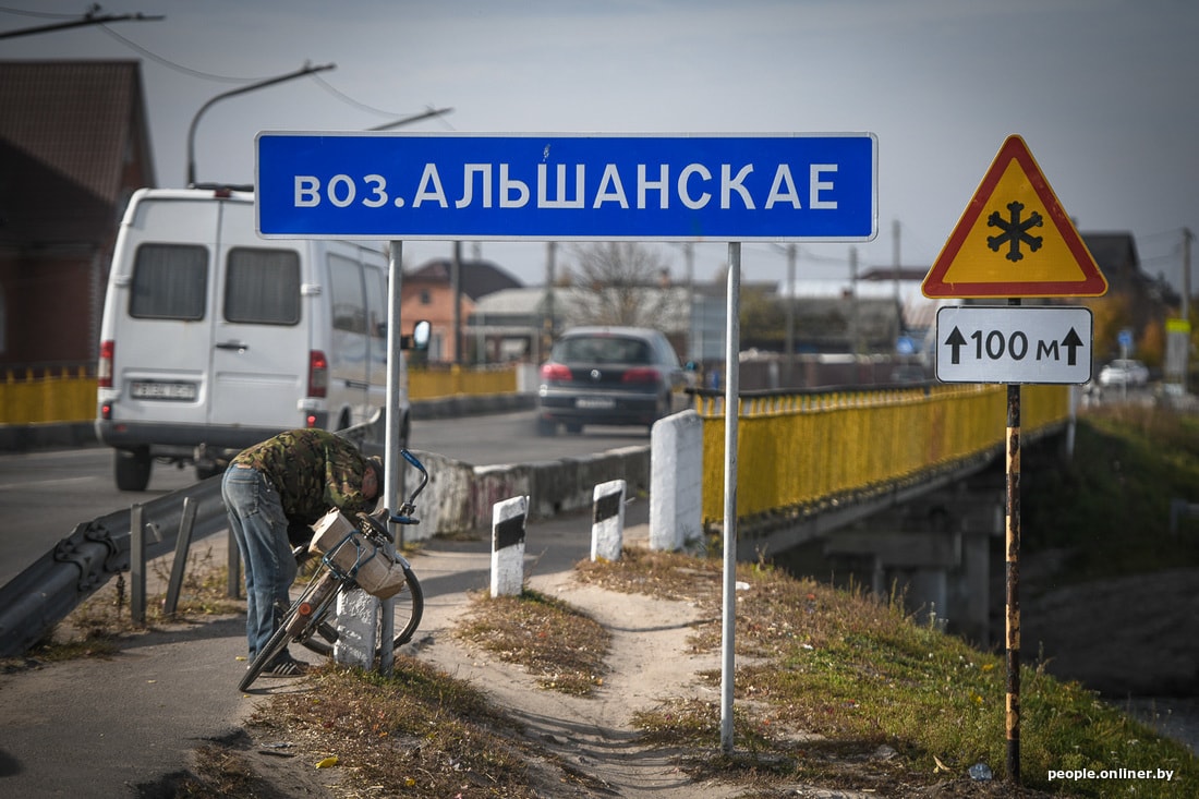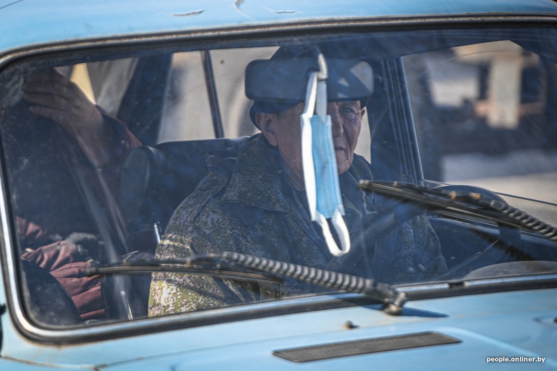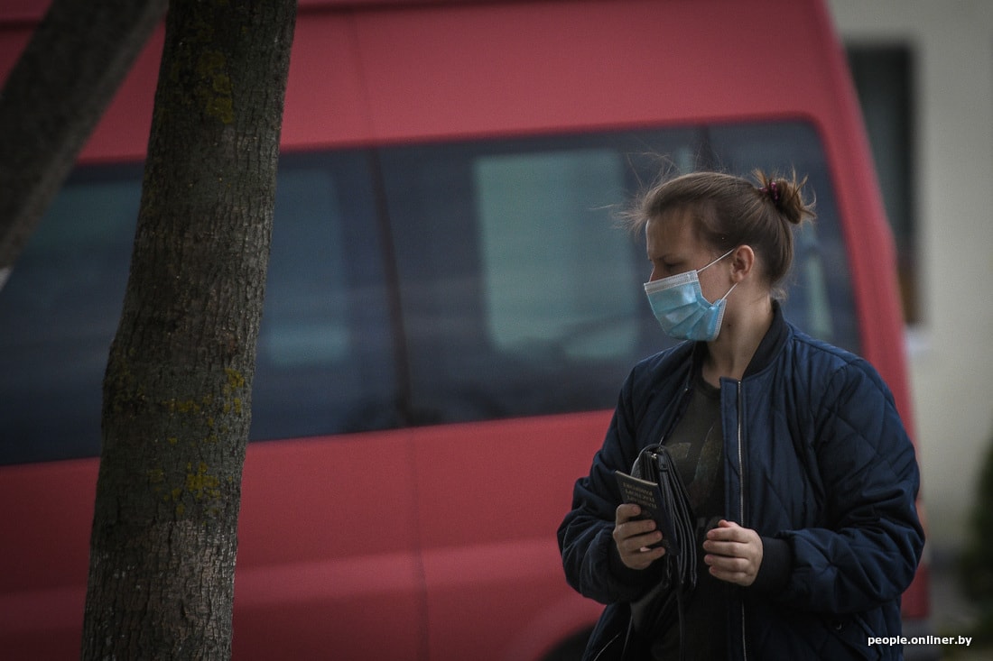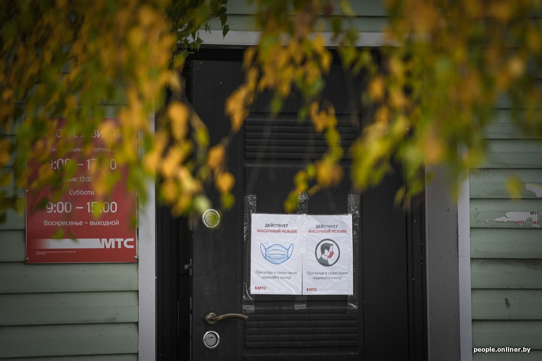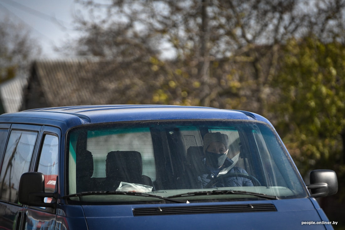 От поликлиники вдоль дороги отправляемся на тот самый закрытый рынок и разглядываем прохожих. Пока в Минске за отсутствие маски в метро можно было ненадолго встрять, здесь масочный режим соблюдали почти все, не важно, едешь ты на велосипеде по улице или в машине, просто гуляешь, ждешь автобуса или идешь в магазин — маски были почти у каждого жителя Ольшан.
