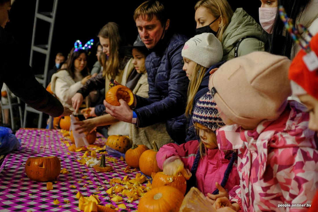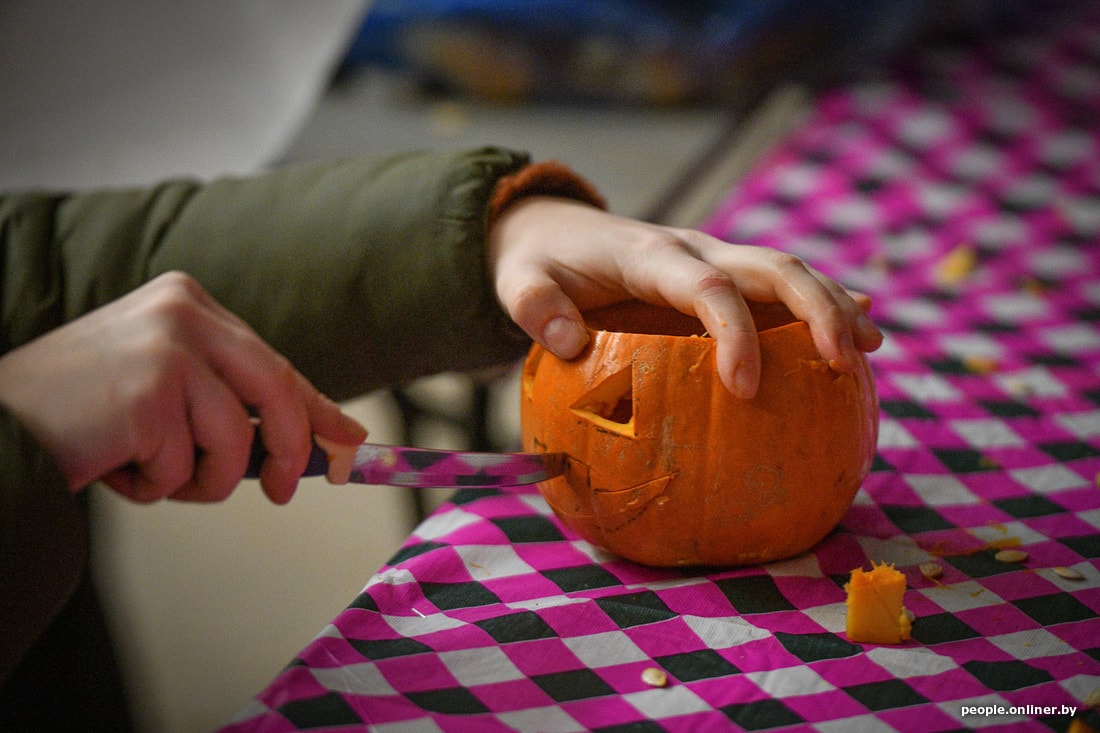 Само собой, не обошлось без терзания тыкв: коллективно и поодиночке ярко-оранжевые плоды приводили в подобающий для Хэллоуина вид.