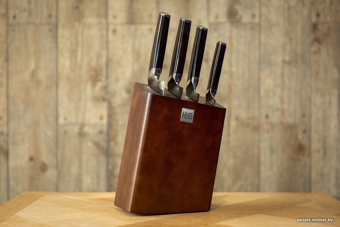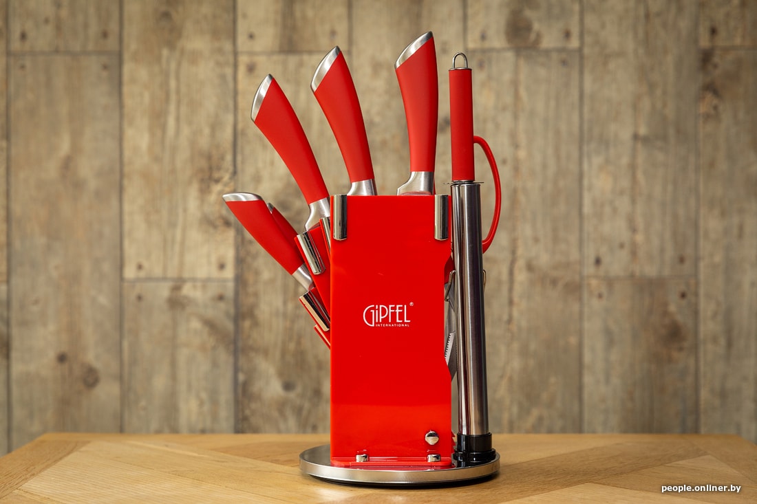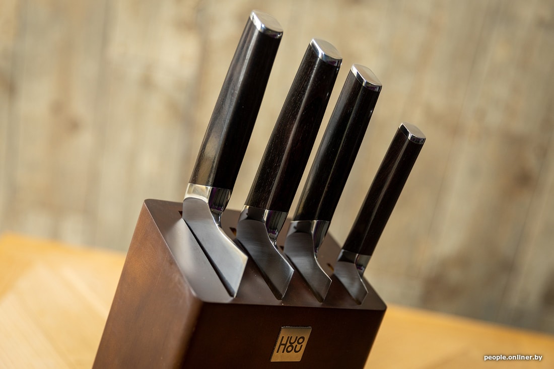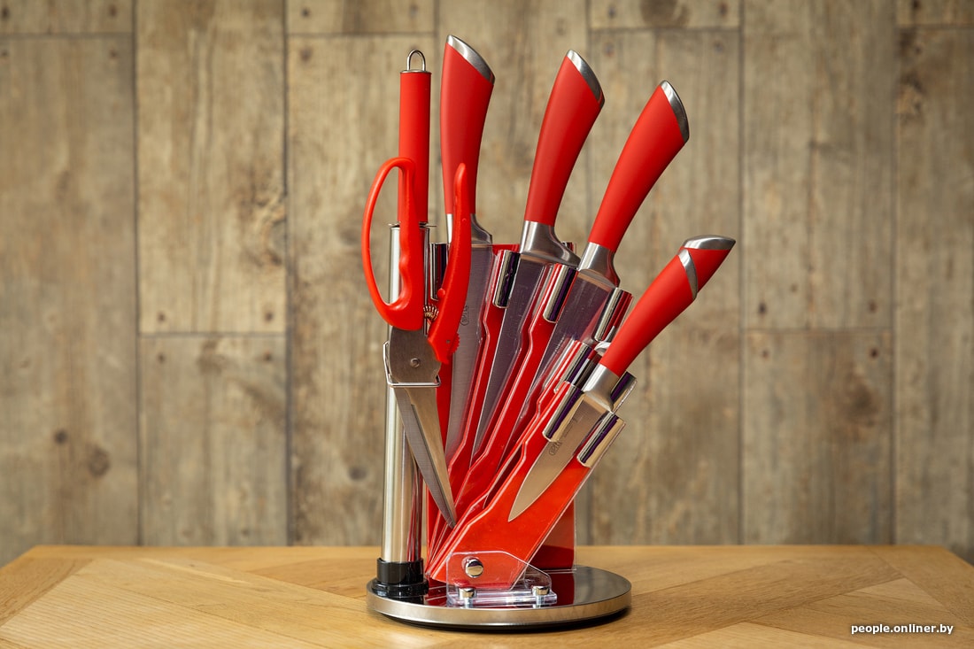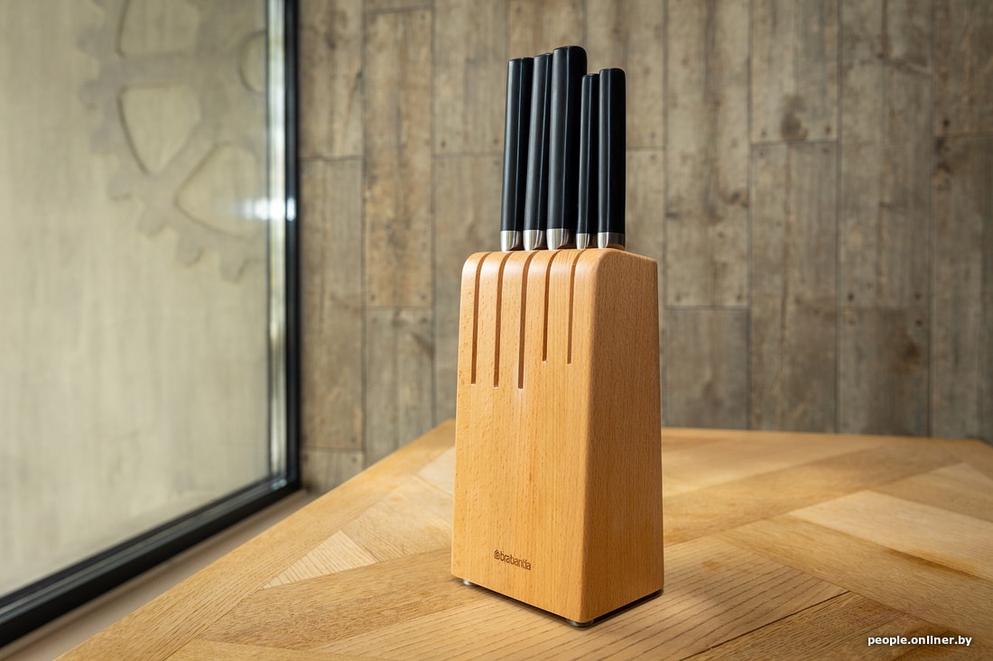 Мне очень нравятся ручки ножей. Суперудобно для людей с большими руками, как у меня. И в месте, где касается рука, — толстая сталь, мозоли не будет. Сталь плотная. Подставка не упадет. Интересный набор.
