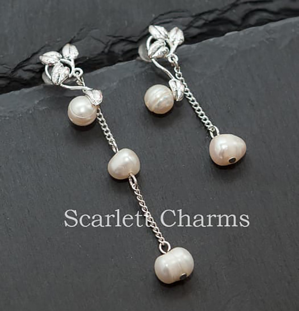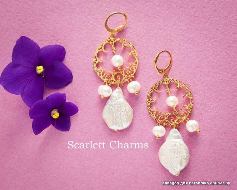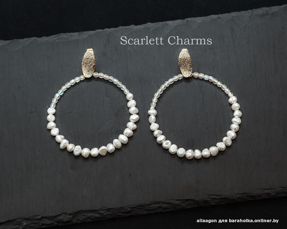 А здесь — много жемчуга. Описывают их так: «Серьги, кольца с пресноводным жемчугом и чешскими кристаллами, гипоаллергенные швензы с родиевым покрытием — 38 рублей, нежные асимметричные серьги с листочками — 20 рублей, золотистые серьги с барочным жемчугом — 25 рублей».