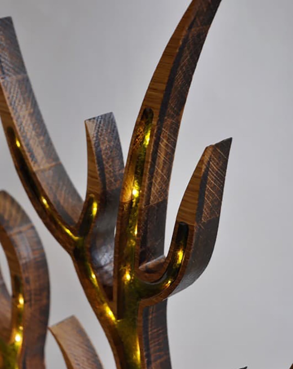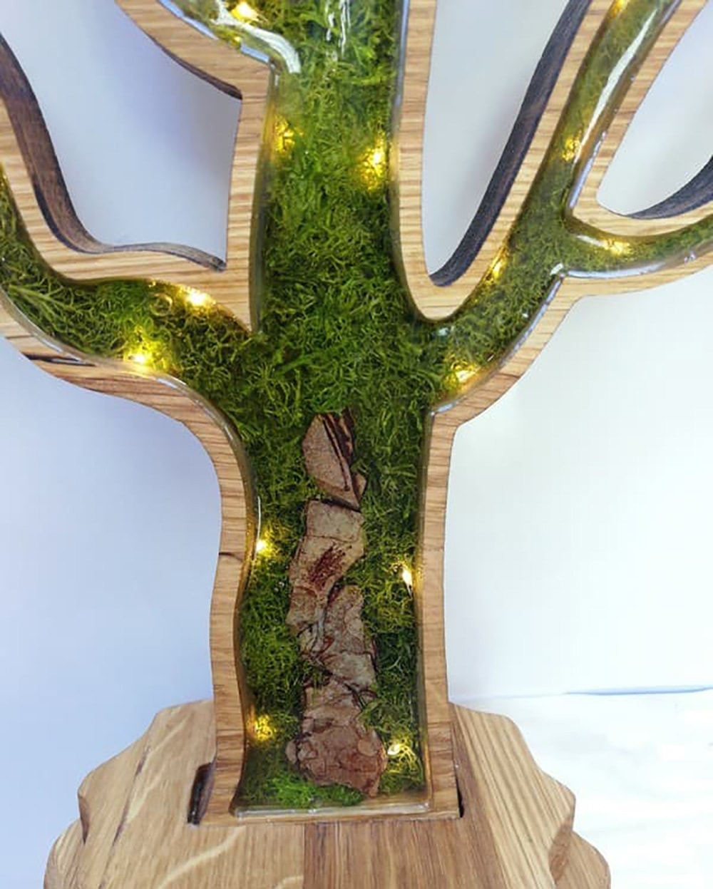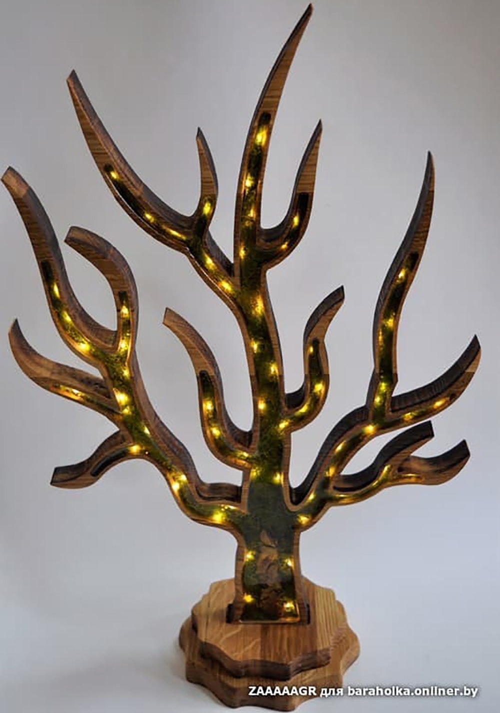 Отличная вещица, которая может украсить любую спальню. Между прочим — настоящий дуб. Никаких шнуров, беспроводной блок питания подсветки расположен в подставке. Стоимость — 100 рублей.