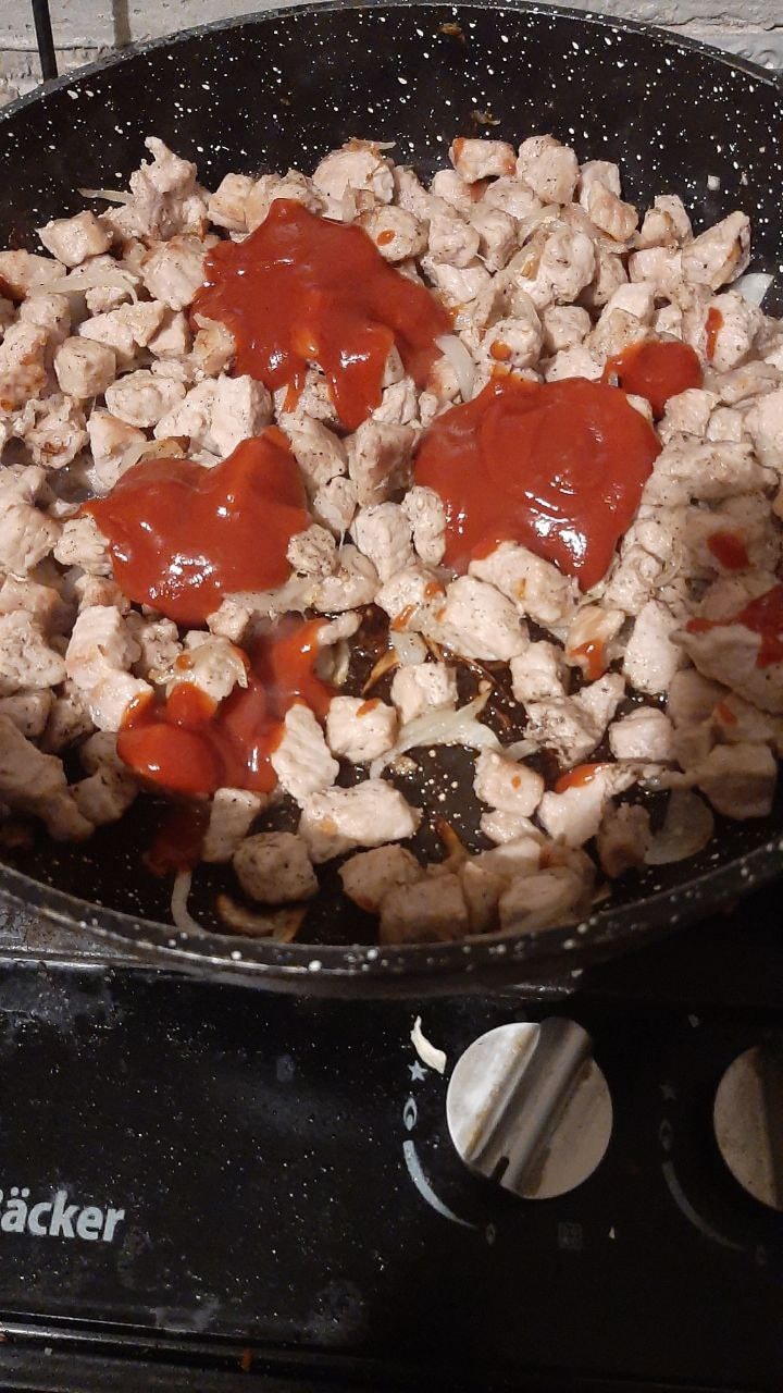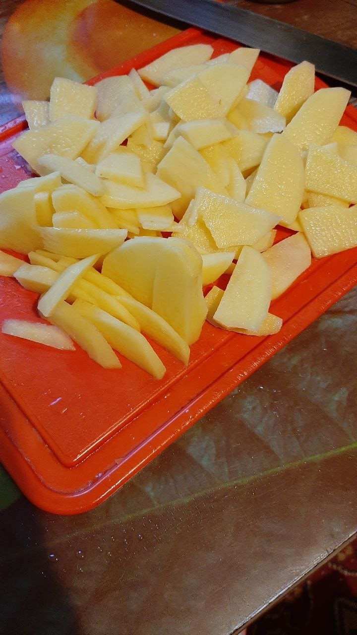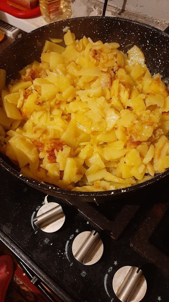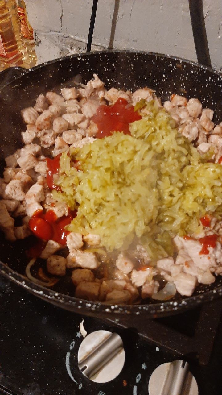Берем 10 картофелин, режем их соломкой и обжариваем почти до готовности. На другую сковородку отправляем мясо, предварительно нарезав его кубиками. К нему же добавляем лук, солим и перчим по вкусу. К мясу и луку добавляем 2 столовые ложки кетчупа и два измельченных на терке соленых огурца. Доливаем воды и тушим, затем добавляем картошку, приправы, чеснок, лавровый лист и доводим до готовности.