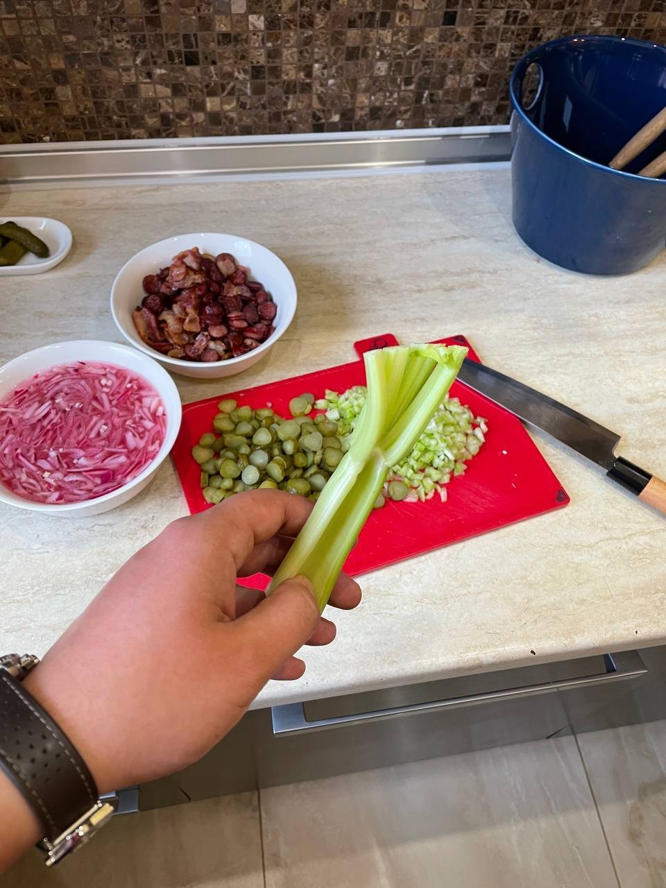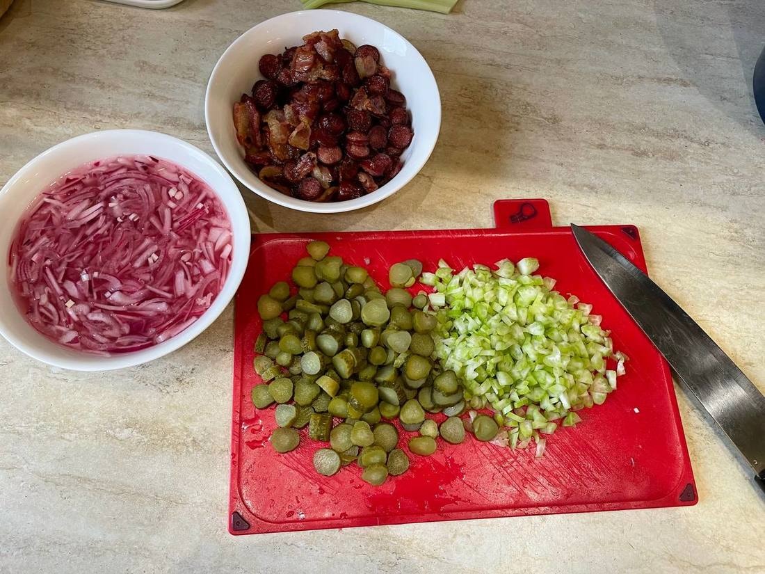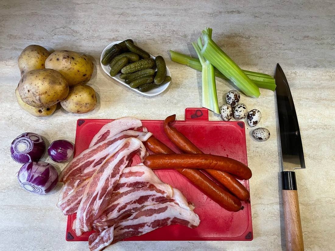 «Грудинку с колбасками хорошенько обжариваем на сковородке, картофель отвариваем, красный лук маринуем в уксусе с добавлением кипятка и сахара. Пока шкворчит, варится и маринуется, нарезаем корнишоны и сельдерей. Затем остужаем грудинку с колбасками и картофель. После того как остыло, картошку нарезаем на средние кусочки и все смешиваем в салатнице. Закидываем заправку, хорошенько перемешиваем. Готово!» — делится Дмитрий.