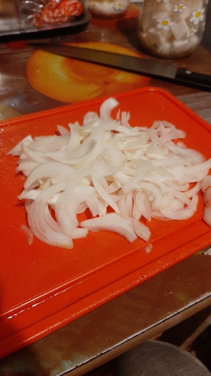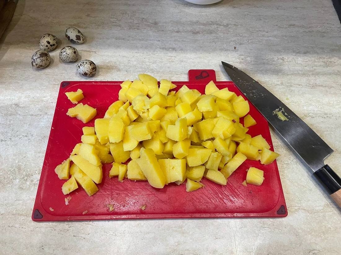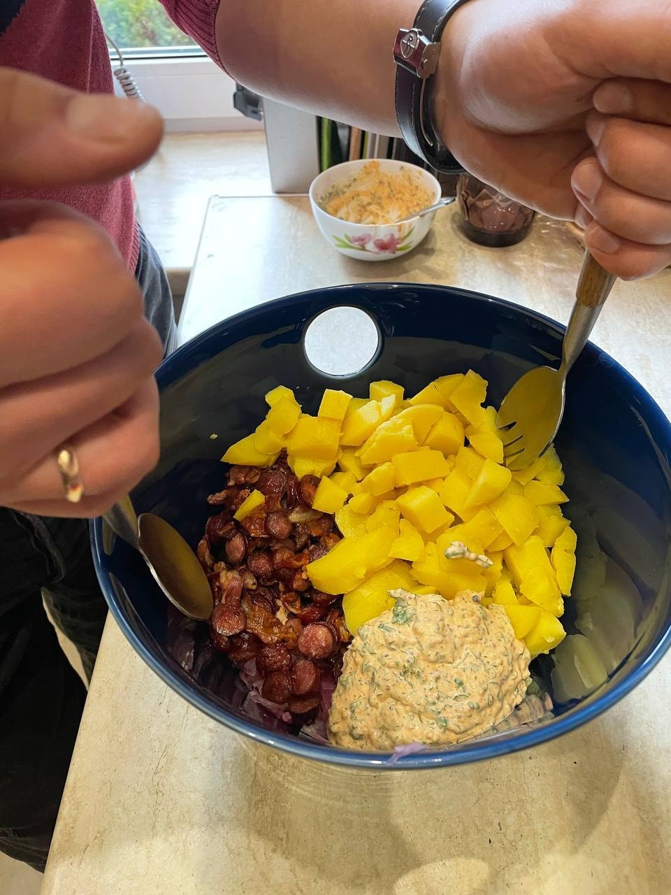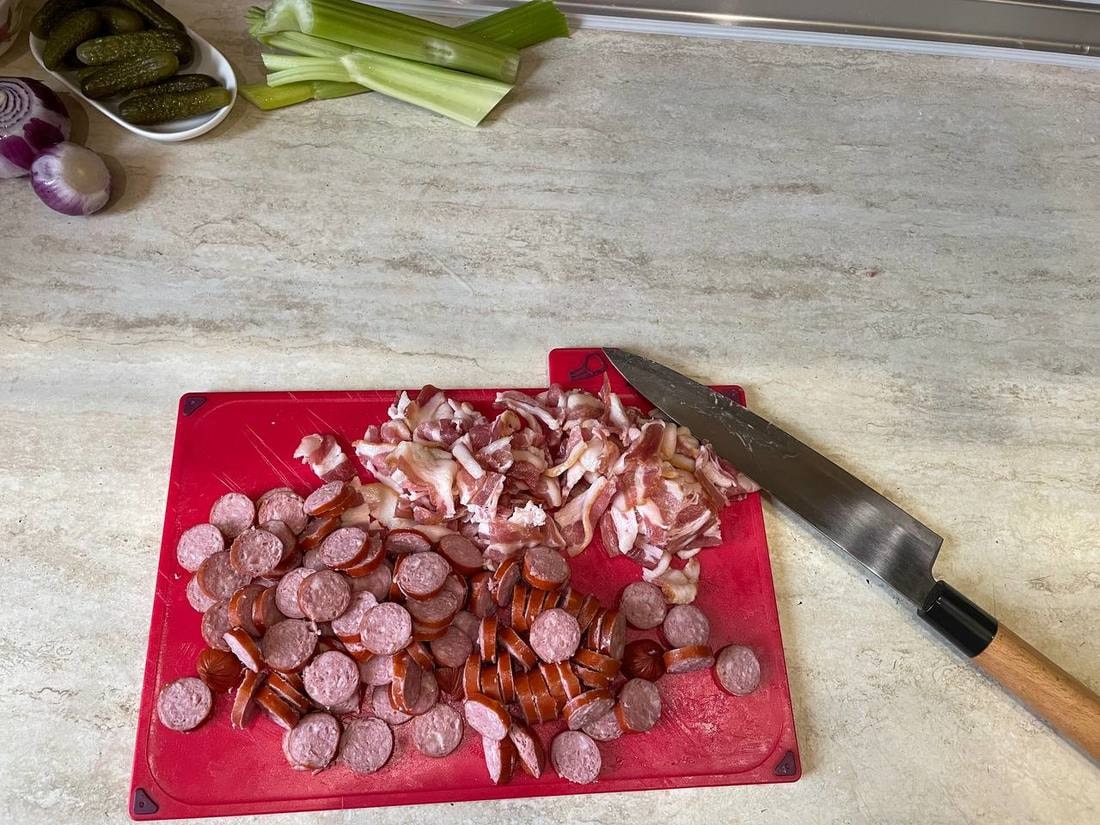 «Грудинку с колбасками хорошенько обжариваем на сковородке, картофель отвариваем, красный лук маринуем в уксусе с добавлением кипятка и сахара. Пока шкворчит, варится и маринуется, нарезаем корнишоны и сельдерей. Затем остужаем грудинку с колбасками и картофель. После того как остыло, картошку нарезаем на средние кусочки и все смешиваем в салатнице. Закидываем заправку, хорошенько перемешиваем. Готово!» — делится Дмитрий.