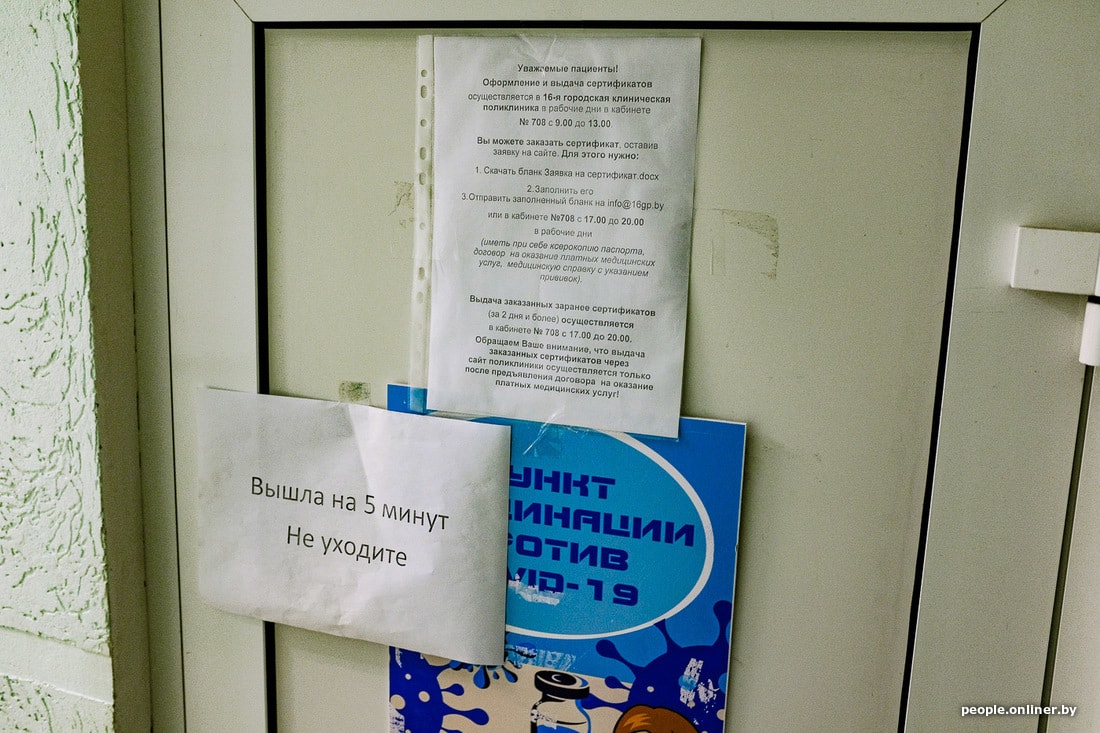 Это единственный торговый центр, где собралась действительно внушительная очередь: в момент приезда нашего фотографа у кабинета стояло человек двадцать. Обычно этот пункт работает с 10 до 19 в будние дни и с 10 до 14 в субботу (воскресенье — выходной). Однако на этих выходных прививают по другому графику: с 11 до 17 и в субботу, и в воскресенье. Об этом свидетельствует табличка, написанная от руки.