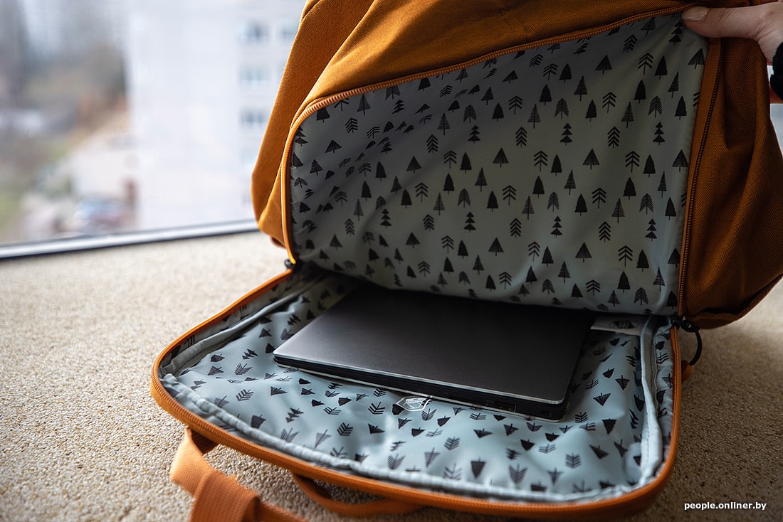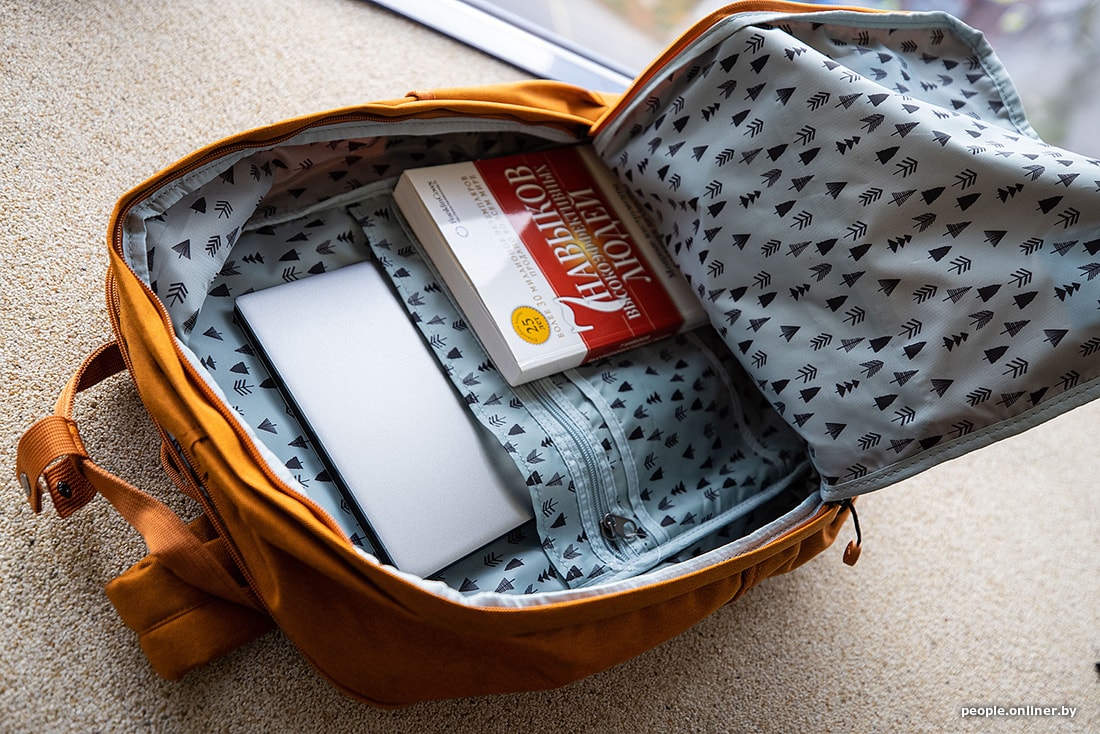 Внутри — подкладка с позитивным принтом в виде елочек. Каждый раз при открывании рюкзака у вас автоматически будет подниматься настроение. Бренд, кстати, известен своими яркими подкладками — это его фишка. Длинная молния максимально обнажает «внутрянку» рюкзака, что действительно очень удобно. Карманов достаточно, есть даже потайной сзади. Шлейки мягкие и комфортные.