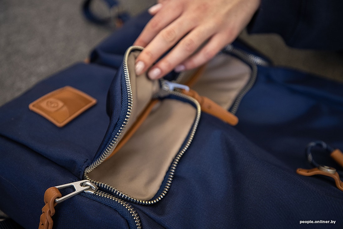 Есть только одно большое отделение, но оно разделено на множество зон и кармашков, куда аккуратно прячется все необходимое. То, что всегда необходимо держать под рукой (смартфон, блокнот, кошелек), можно сложить в карманы на лицевой стороне. Если предстоит командировка, рюкзак спокойно можно взять с собой: предусмотрено крепление для чемодана. Также сзади имеется комфортная мягкая спинка. Ткань водонепроницаемая. Специальные молнии тоже не пропускают воду.