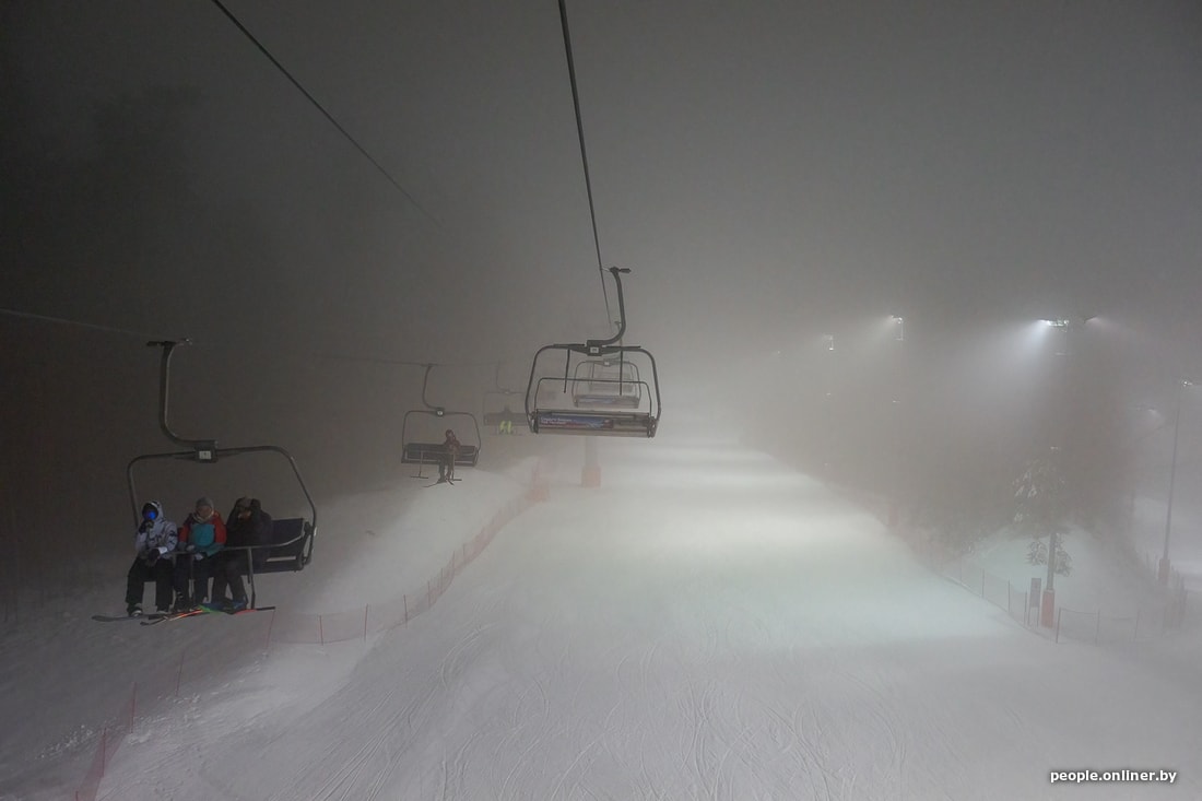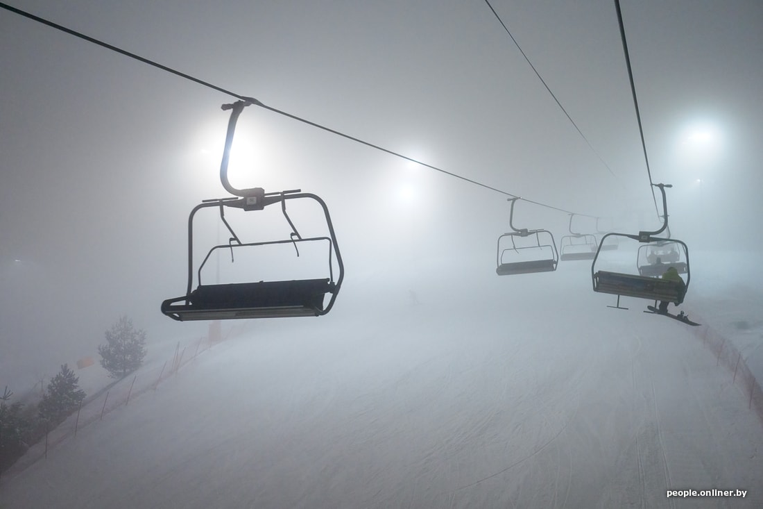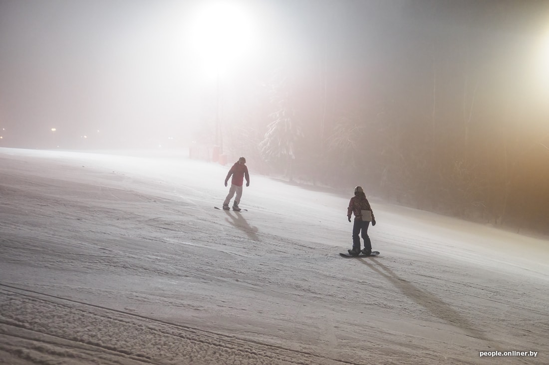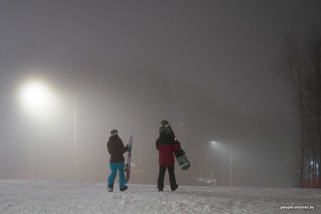 Мы едем в комплекс вечером в пятницу, когда уже ощущается нехватка фотонов, да еще и туман стелется. Поток машин, выезжающих из Минска, однороден на протяжении всего пути, хотя дачный сезон уже позади. Просто сноубордисты и лыжники едут кататься, спускаться, подниматься и финтить.