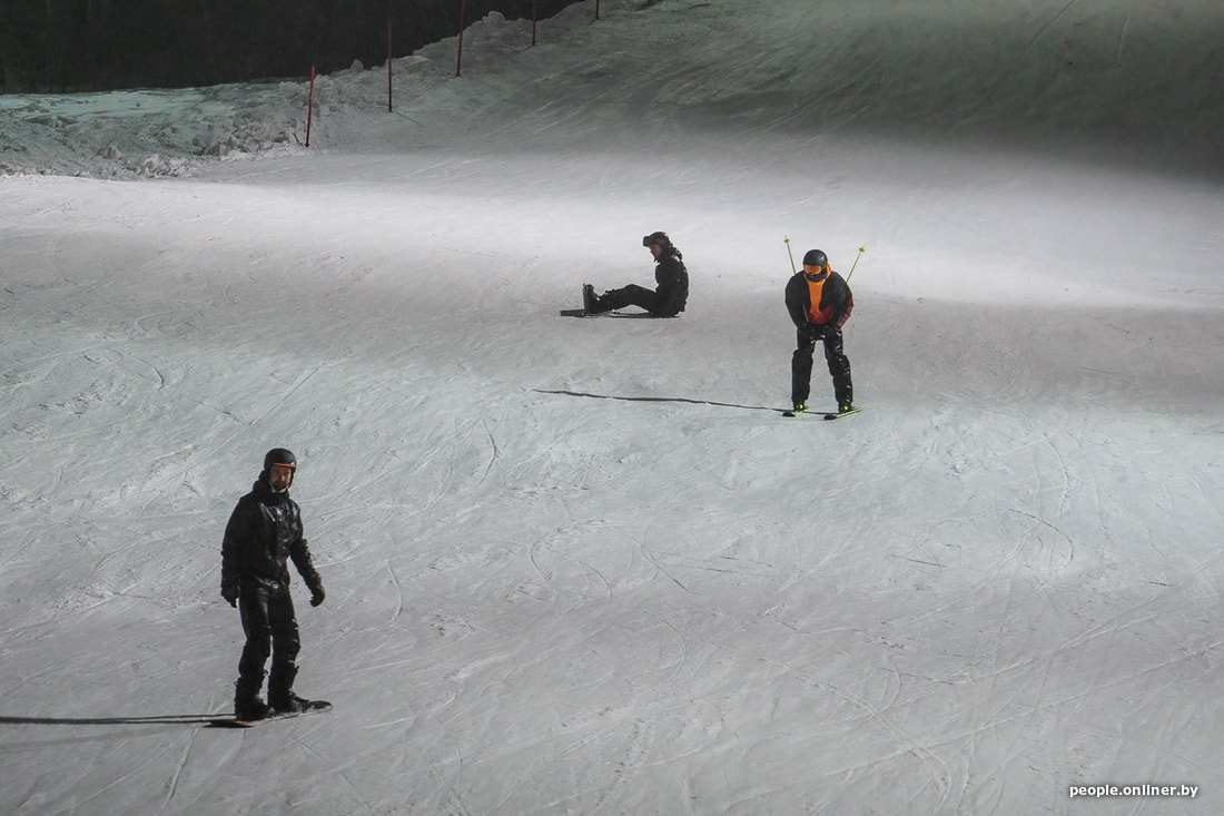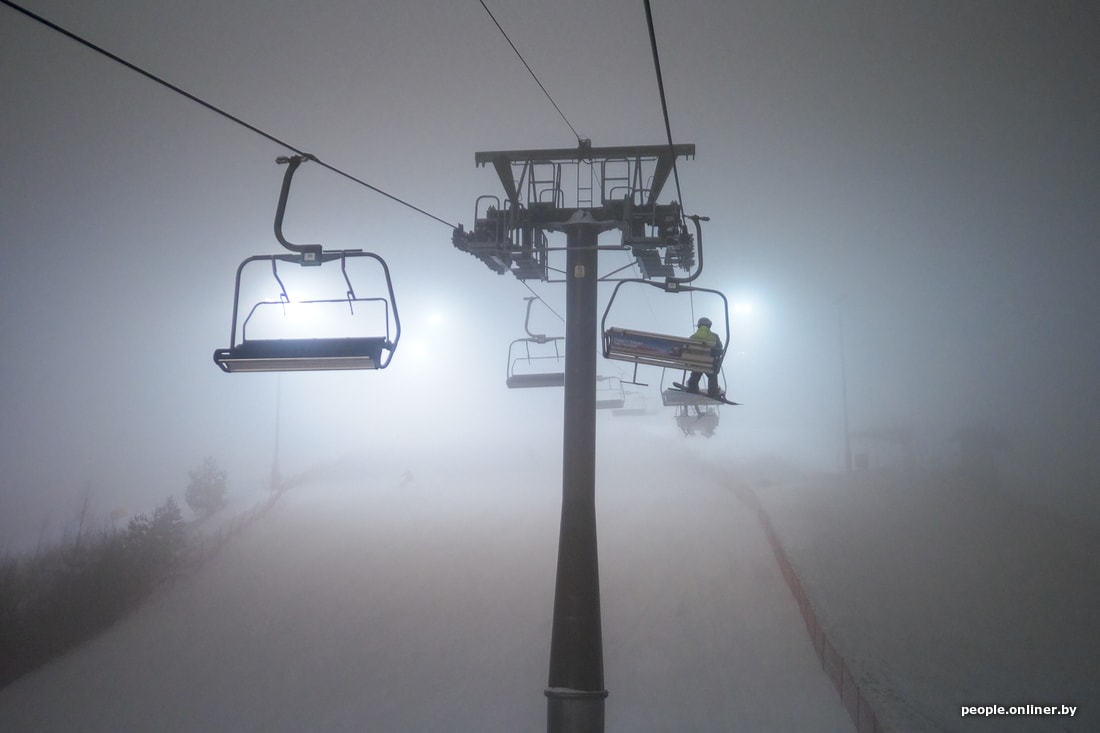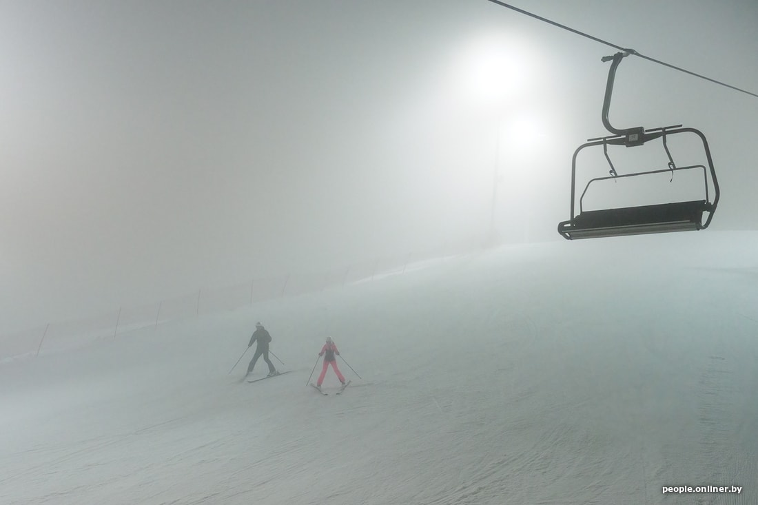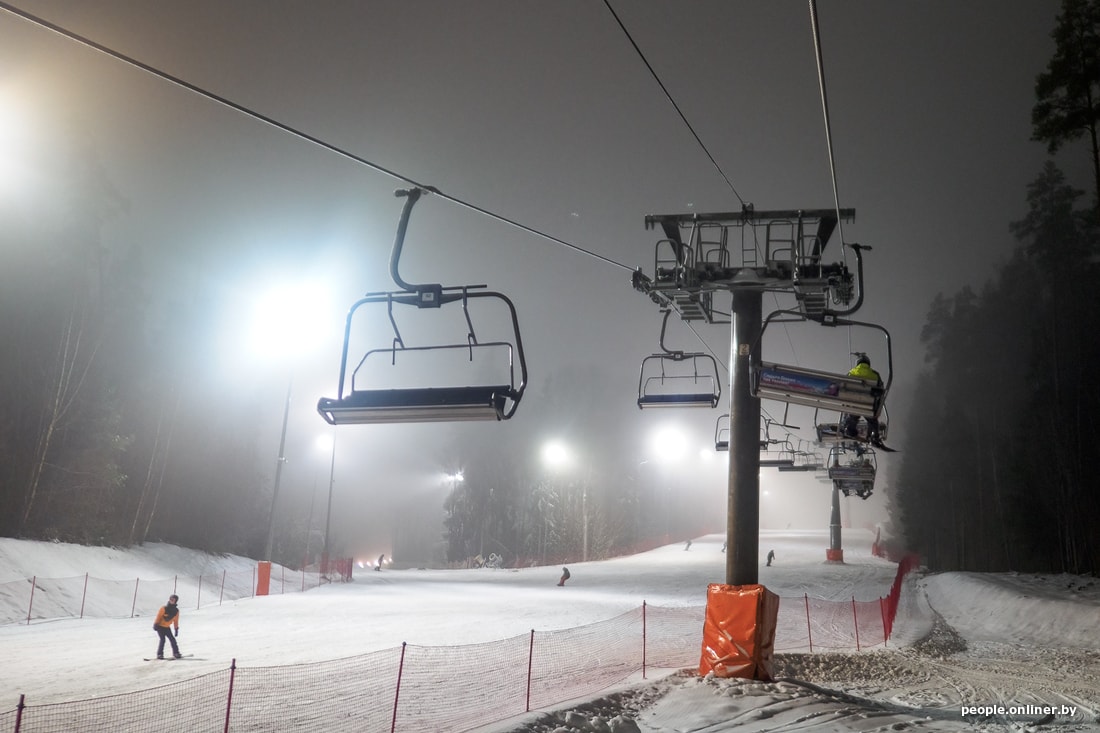 Мы едем в комплекс вечером в пятницу, когда уже ощущается нехватка фотонов, да еще и туман стелется. Поток машин, выезжающих из Минска, однороден на протяжении всего пути, хотя дачный сезон уже позади. Просто сноубордисты и лыжники едут кататься, спускаться, подниматься и финтить.