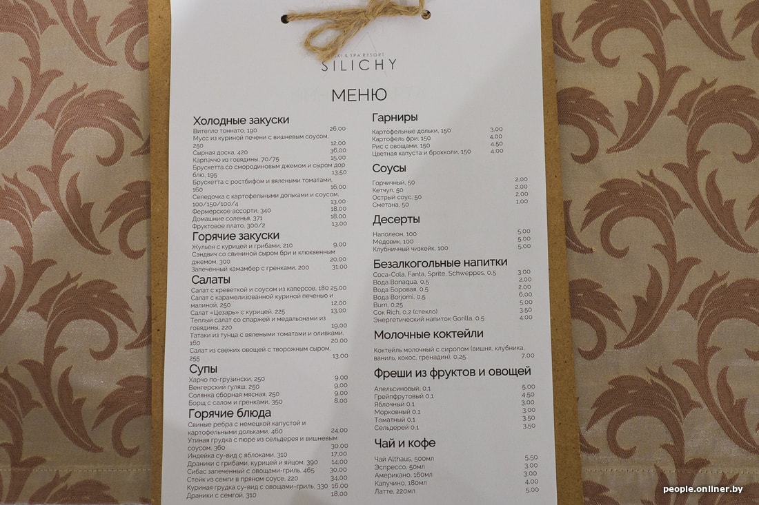 Изменения обещают и в меню ресторана «Силичи», где в среднем можно пообедать за 25 рублей. Цены сопоставимы с Минском. Работает заведение в будни до 20:00, с пятницы по воскресенье — до 23:30. Порцию драников и тарелку борща приготовили за семь минут — возможно, этому способствовала немноголюдность: во всем зале было только четыре человека.
