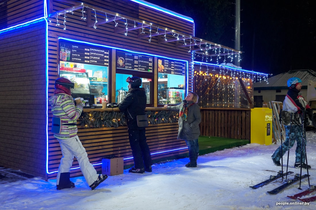 — Люди подъедут ближе к десяти вечера. Даже в такую погоду поедут, потому что 25 рублей платишь — и катаешься четыре часа, то есть на час больше выходит, экономят. Здесь душевно, аниматоры детей развлекают по выходным. В среднем покататься три часа будет стоить рублей 70 плюс дорога, — рассказывает Дмитрий. — Ты, если катаешься, в любом случае замерзаешь и идешь греться в кафе. Я еще термос с собой беру. Туалет достойный, там в прошлом году сделали ремонт. В середине декабря русские приедут, большие очереди на подъемник будут! Домики уже все забронированы на месяц.