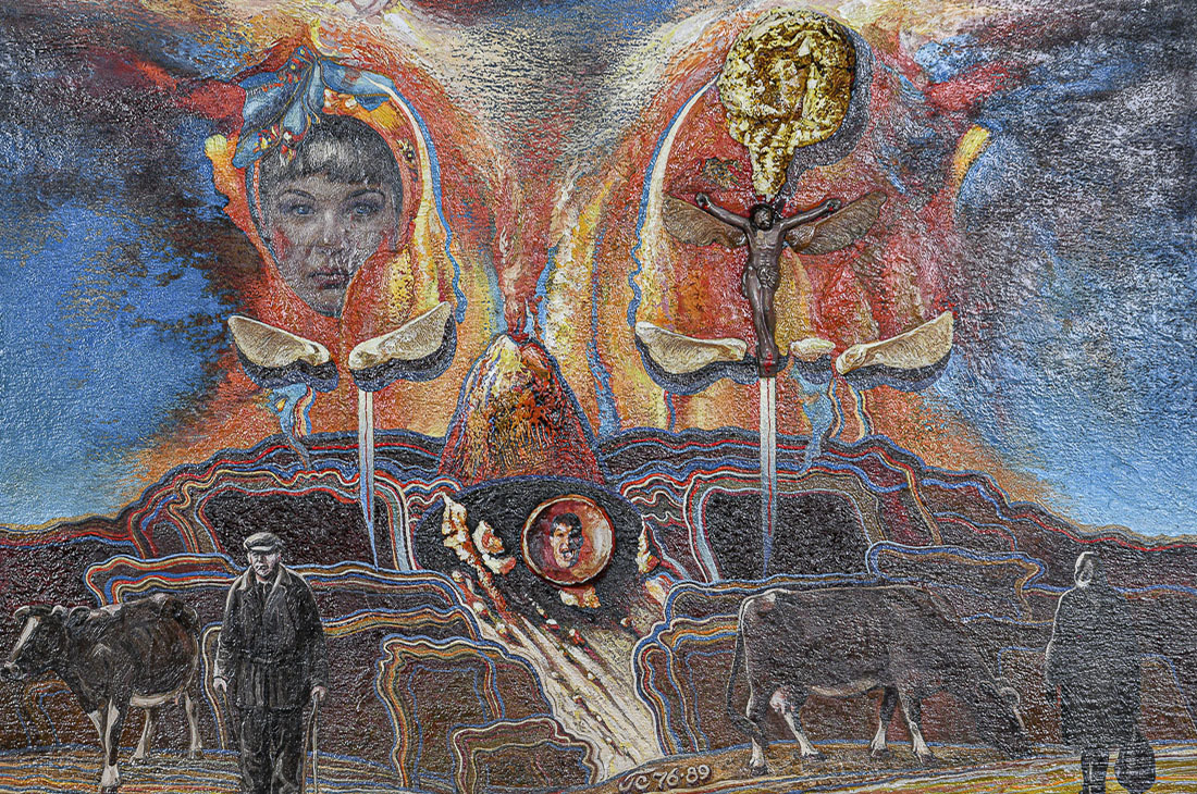 Она датирована 1985 годом и, скорее всего, была написана к выставке, посвященной 40-летию победы в Великой Отечественной войне. В работе лишь мелькают черты сюрреализма, который в дальнейшем поглотит мастера. Однако, как считает Надежда Усова, основные приемы построения сюрреалистической картины — игра с пространствами, многочисленные детали, становящиеся символами, здесь уже присутствуют. На полотне мы видим мастерскую художника. Перед нами стоит мольберт с только что законченным творением. На нем — разрушенный город, бабушка в проеме сарая, чертополох, лежащий теленок... Мальчик, изображенный со спины, несет женщине цветы.