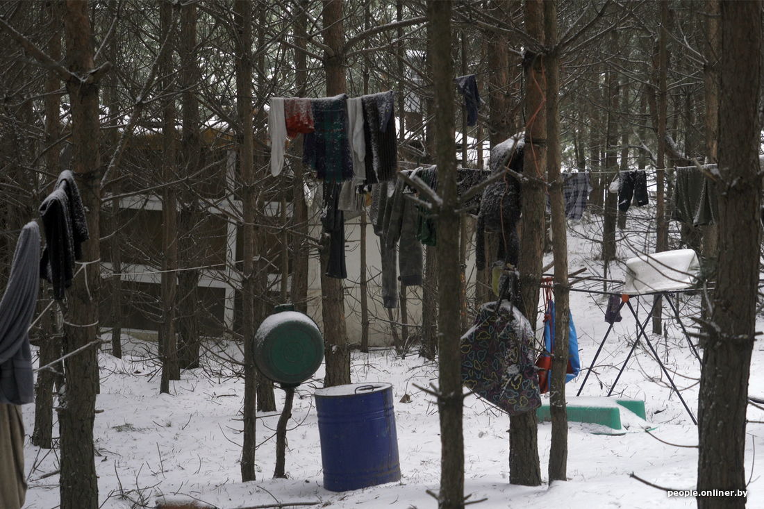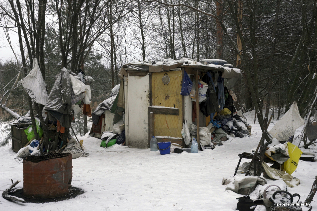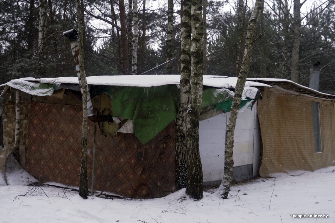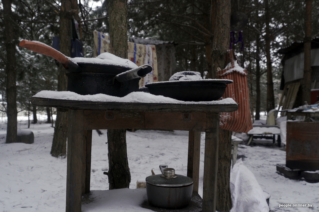 В хижине он не один, а со своей спутницей, Натальей. Она немногословна, у нее трясутся руки, лицо грязное от копоти и практически отсутствуют зубы. О пристрастиях влюбленных говорят крепкий запах перегара и разбросанные повсюду бутылки из-под спиртного. На закуску сегодня конфеты. Остатки сладкого, как и другие продукты, скармливают собакам. Еду здесь предпочитают не закупать — все тянут с помойки.