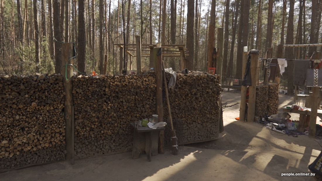 Лагерь Александра со стороны выглядит необычно. Поленце к поленцу, как у хорошего хозяина на селе, сложены дрова. Сушится белье, на полках кухонная утварь. Под навесом стул с лавкой, дымится чайник на костре. Неспешно течет его рассказ.