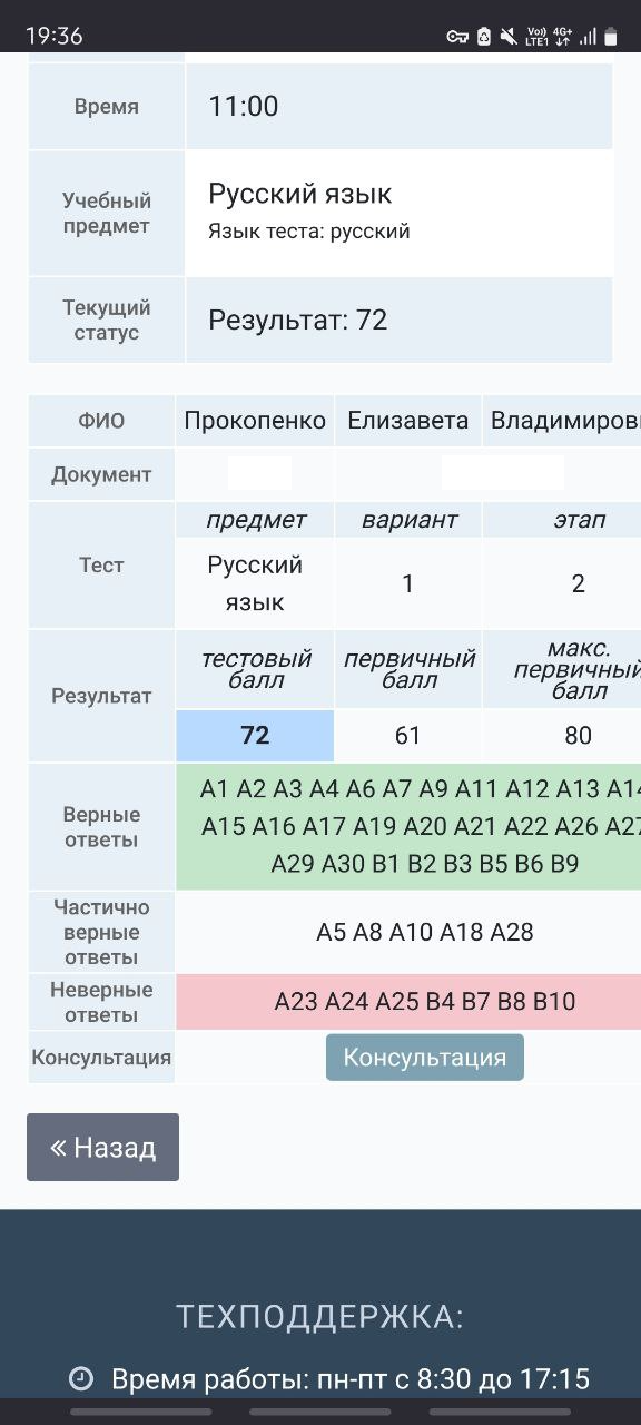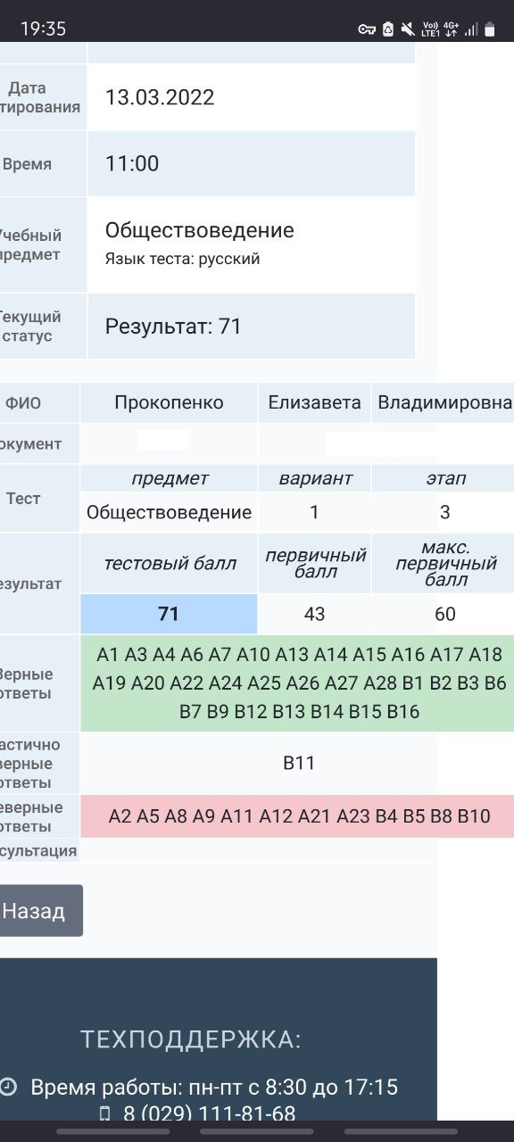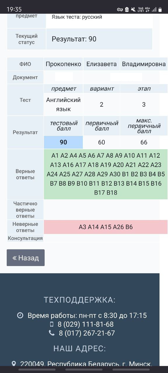 Могилевчанка собирается сдавать ЦТ по обществоведению, русскому и английскому языкам. Эти же предметы она сдавала все на втором этапе РТ. Результаты получила следующие: обществоведение — 71, русский язык — 72, английский — 90.