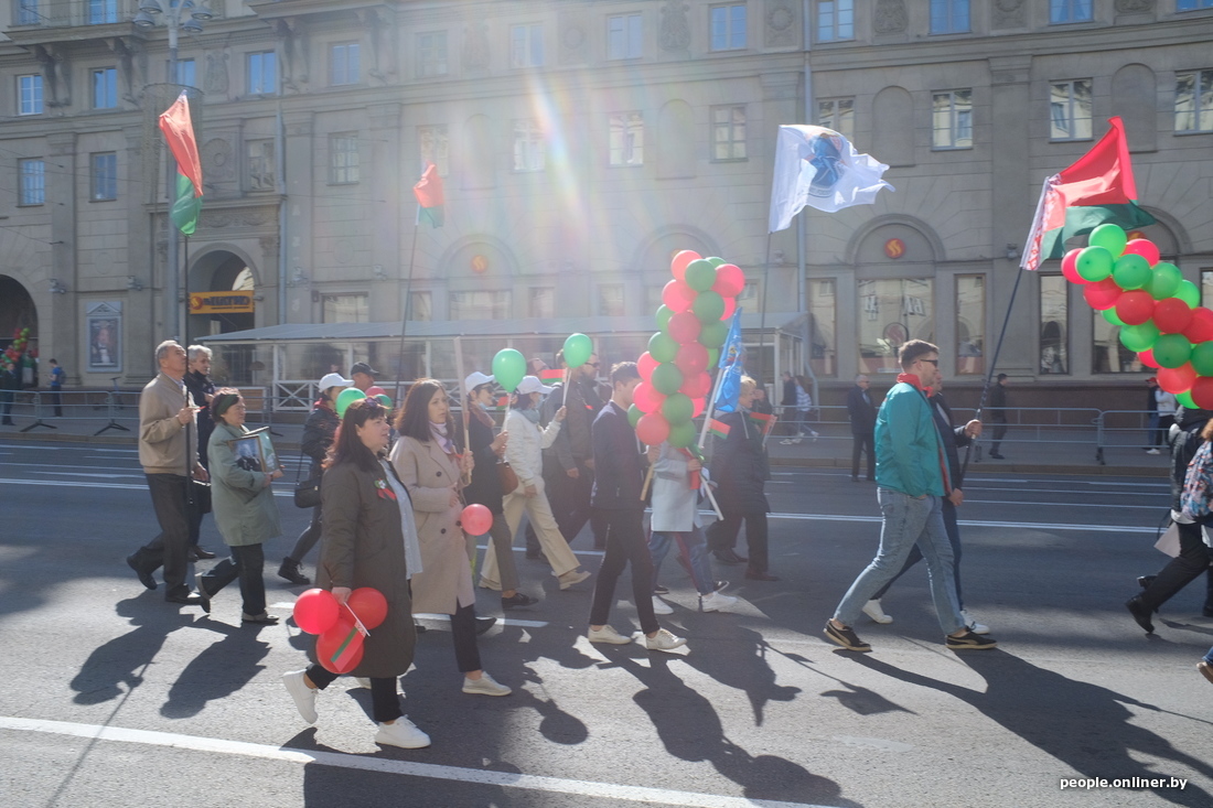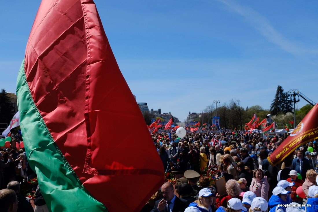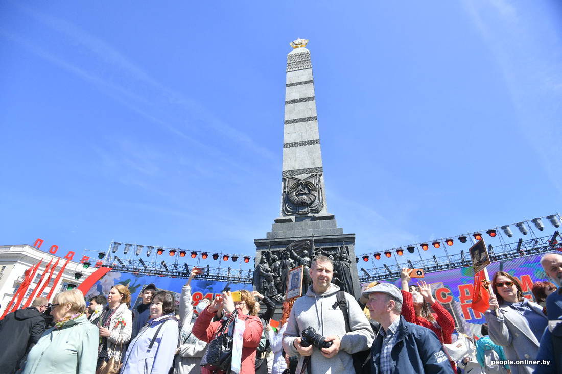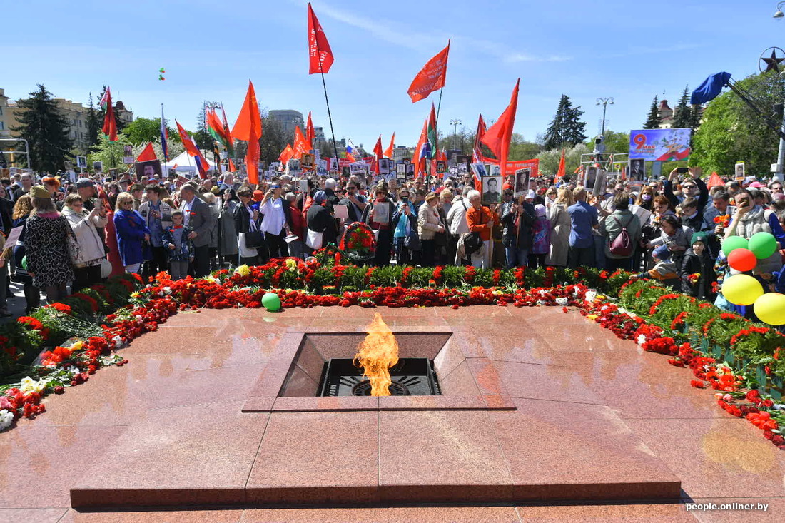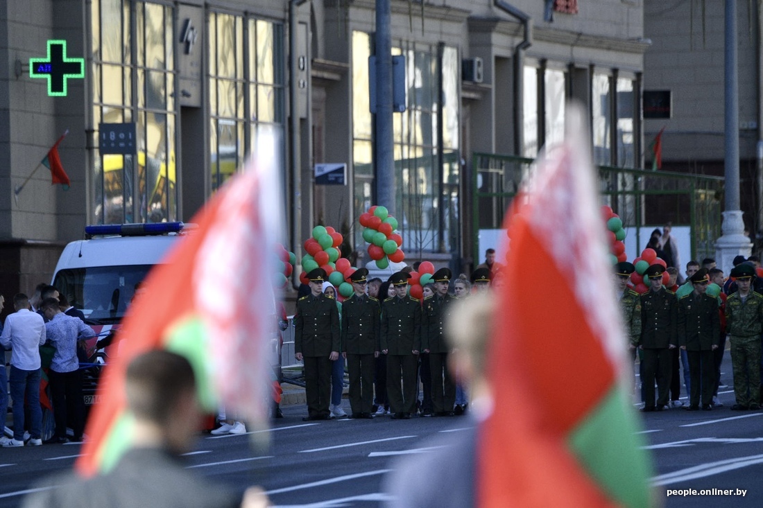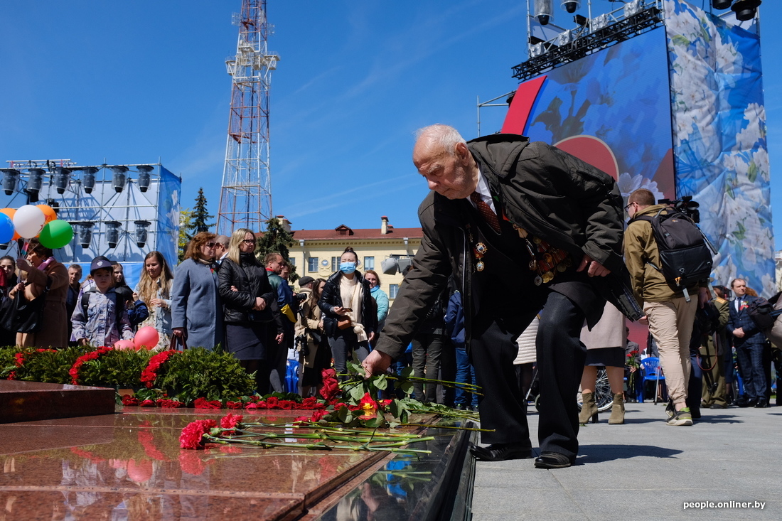 От Октябрьской площади колонны людей пришли к площади Победы. Здесь Александр Лукашенко приветствовал ветеранов и всех участников шествия, возложил венок к монументу Победы и выступил с речью.