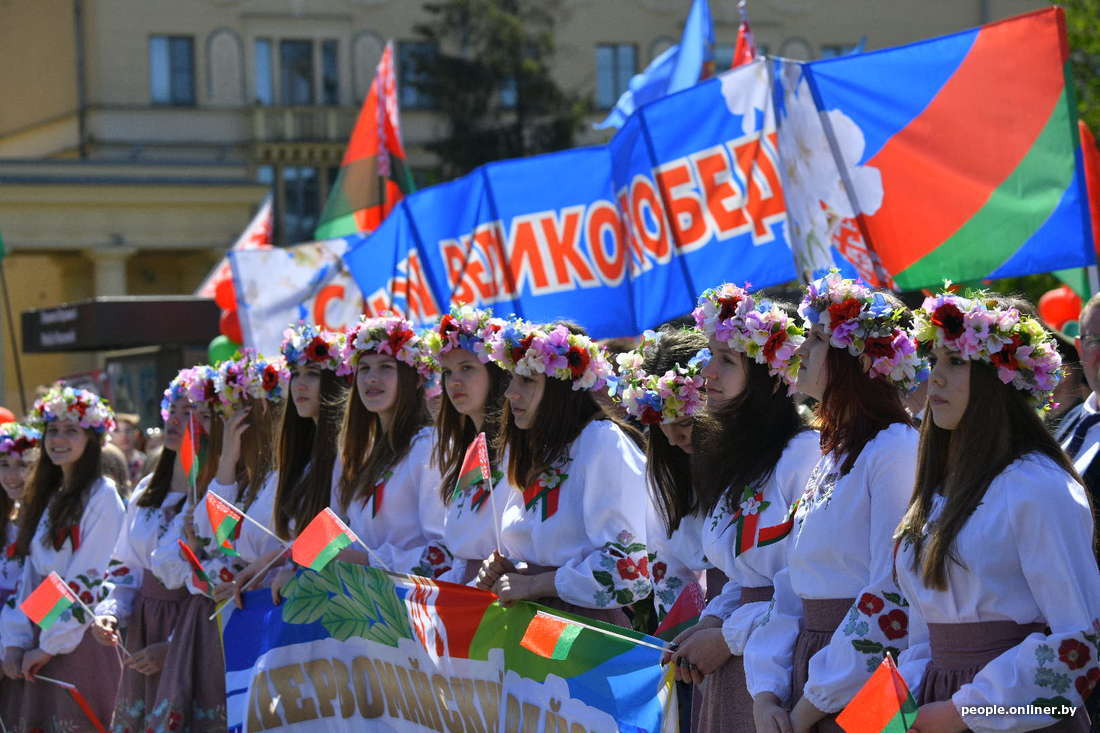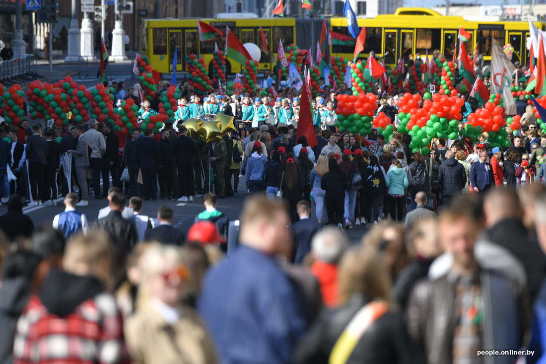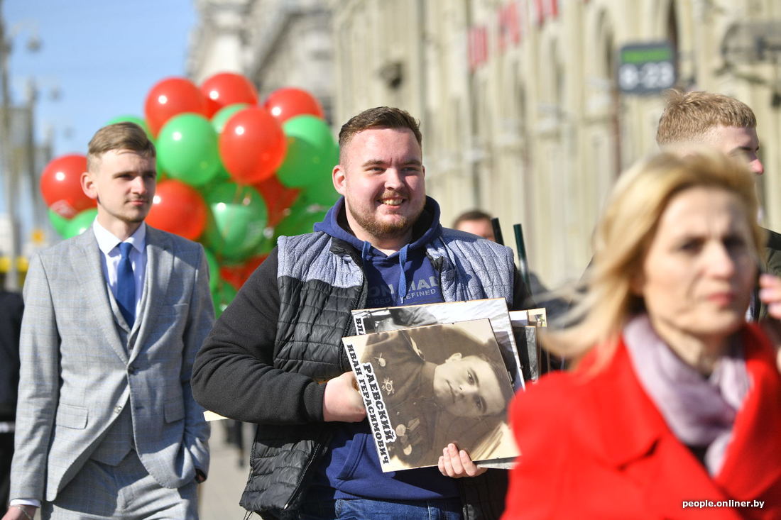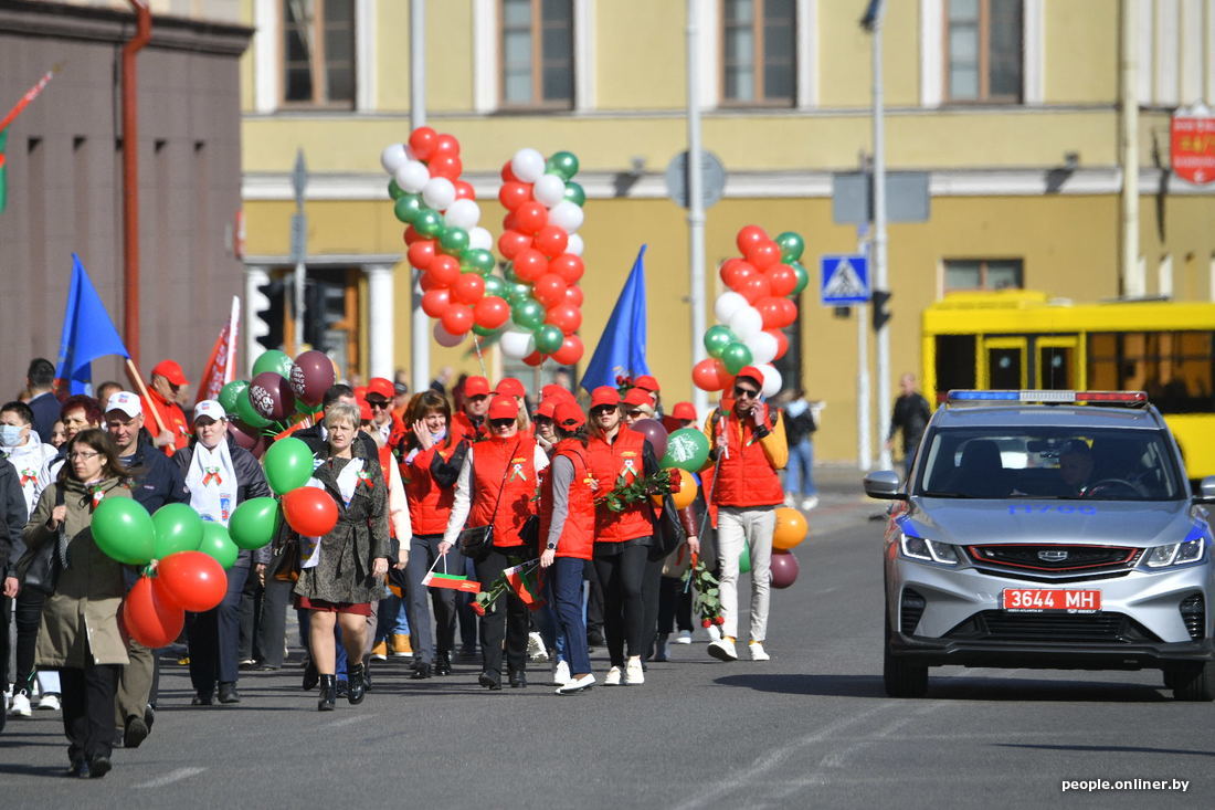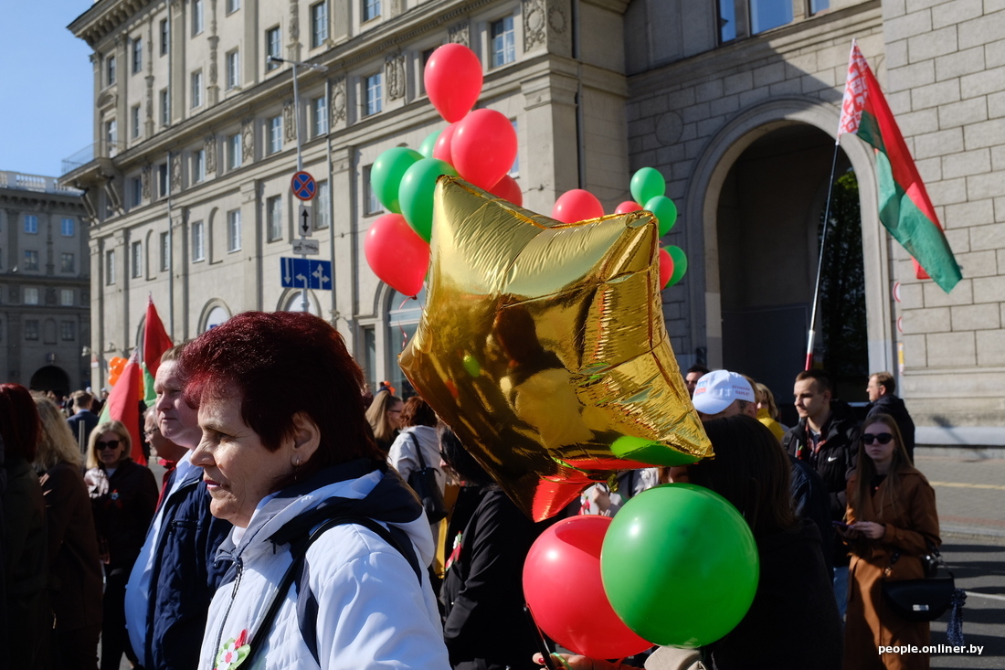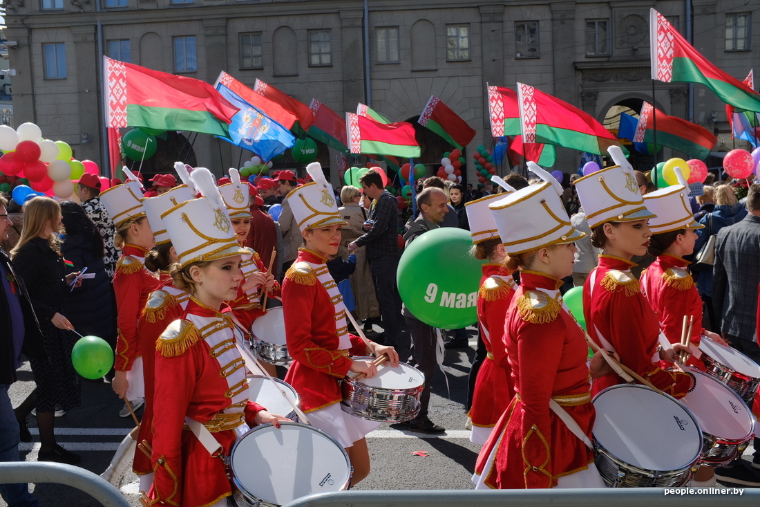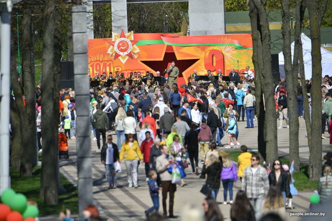 От Октябрьской площади колонны людей пришли к площади Победы. Здесь Александр Лукашенко приветствовал ветеранов и всех участников шествия, возложил венок к монументу Победы и выступил с речью.