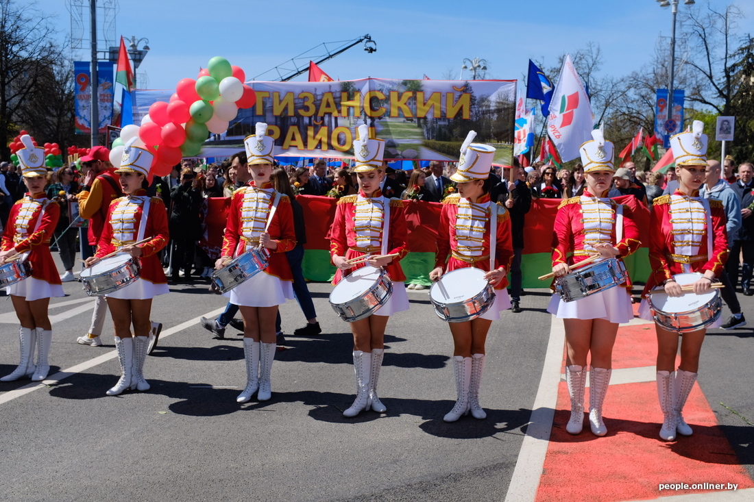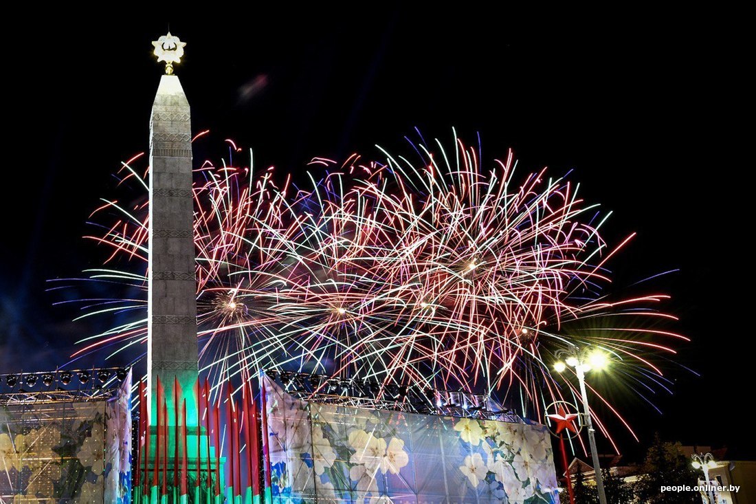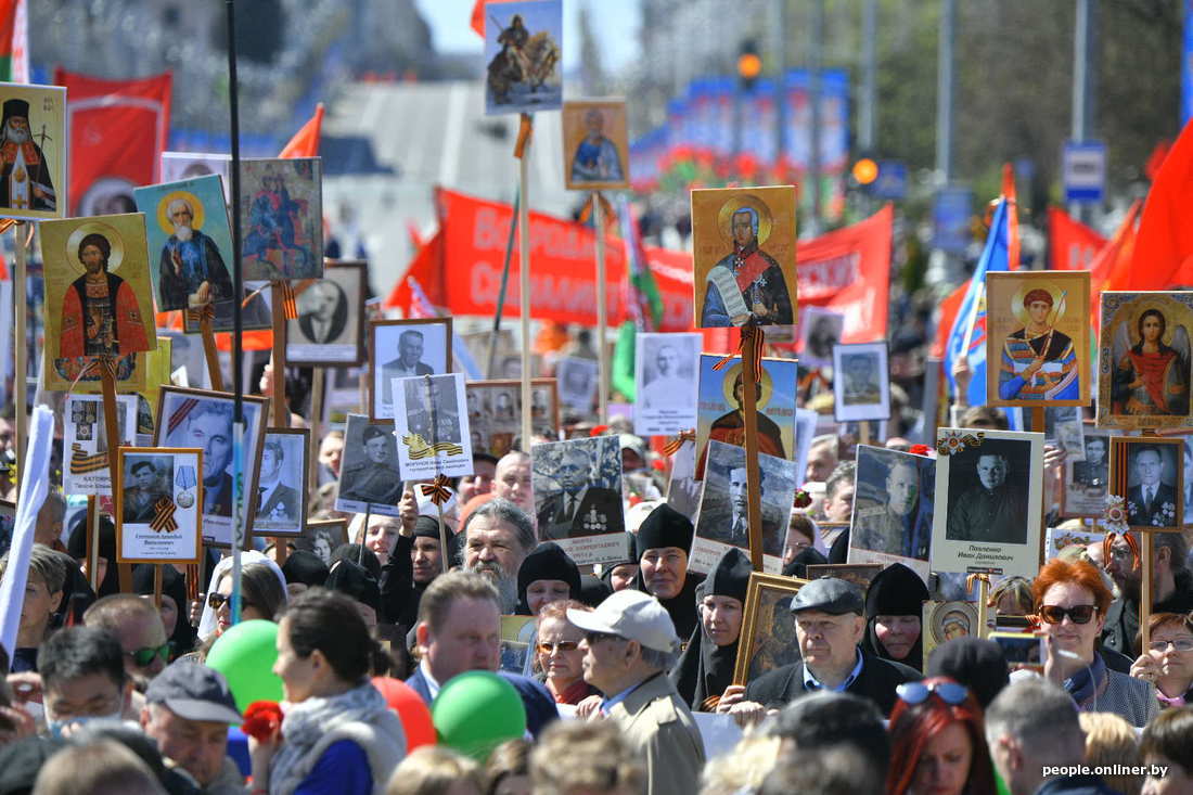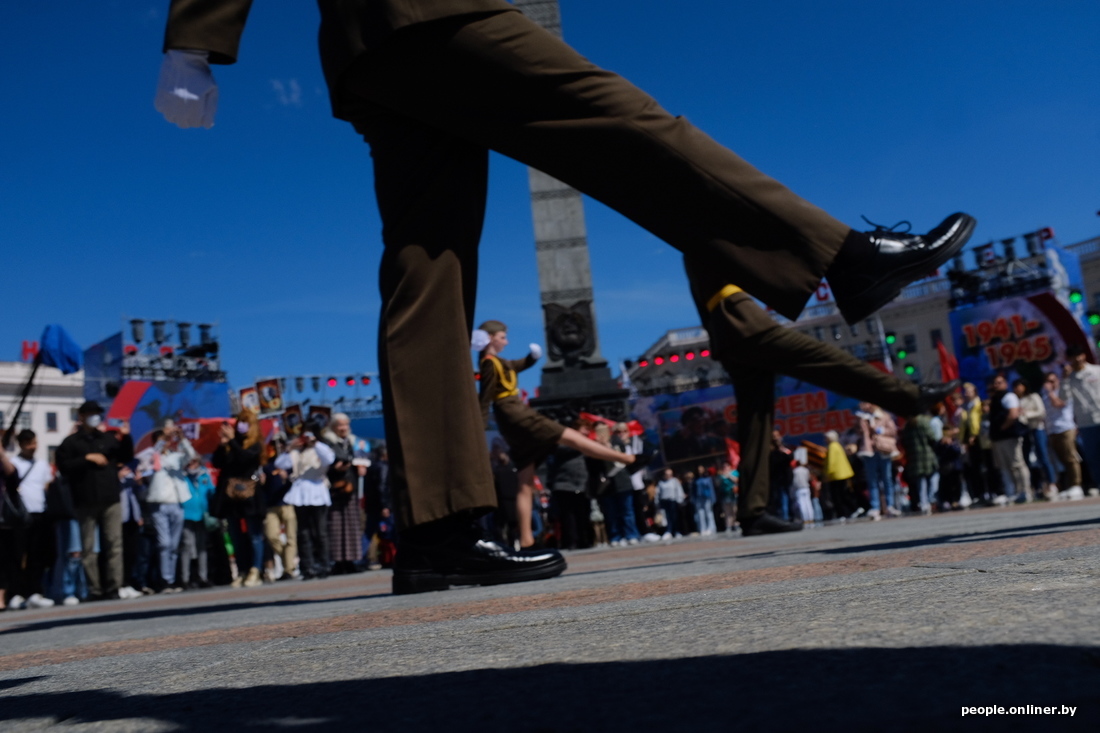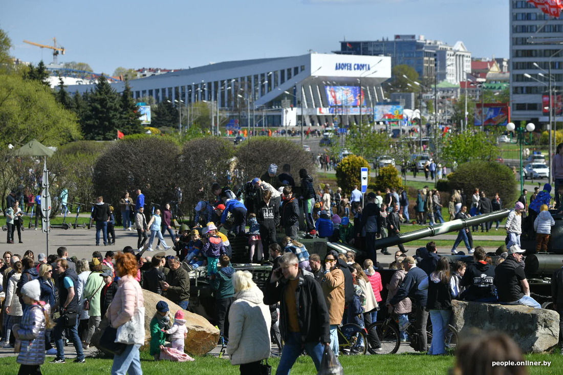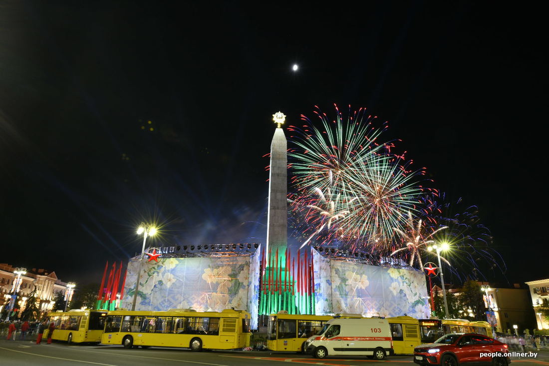 От Октябрьской площади колонны людей пришли к площади Победы. Здесь Александр Лукашенко приветствовал ветеранов и всех участников шествия, возложил венок к монументу Победы и выступил с речью.