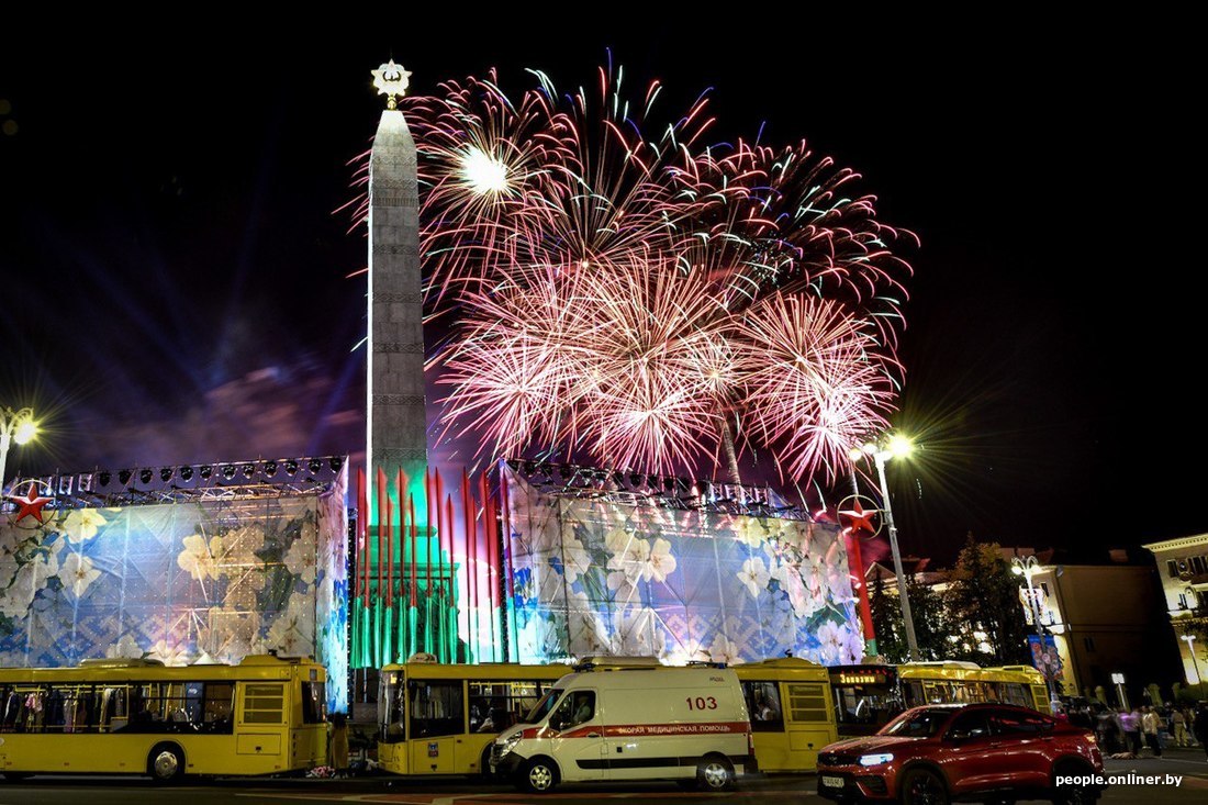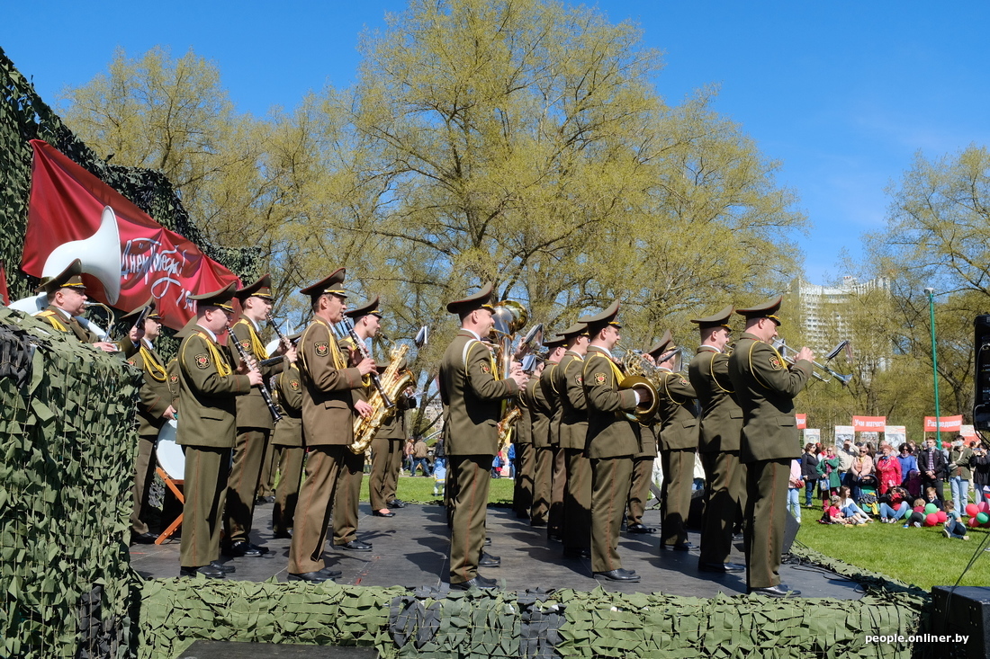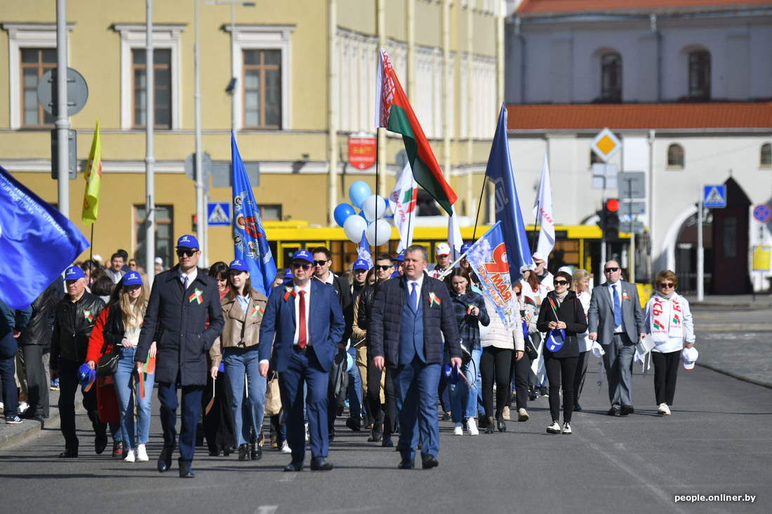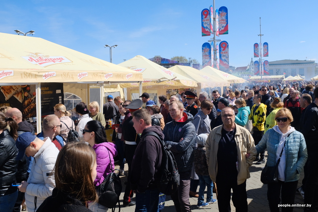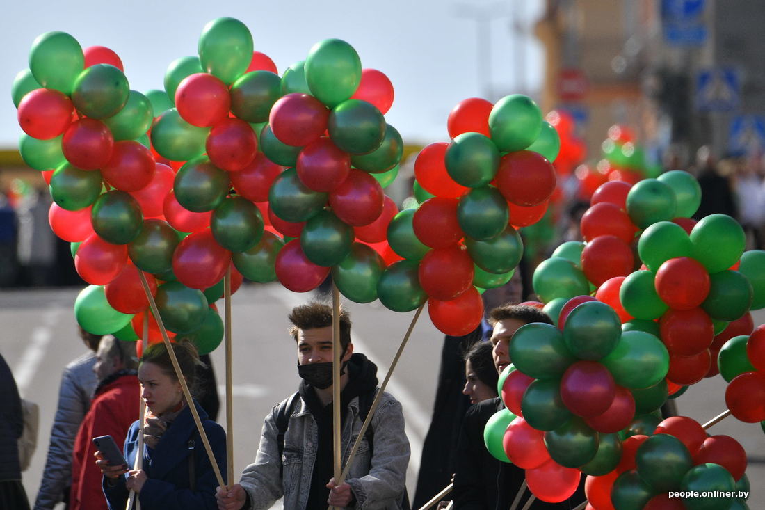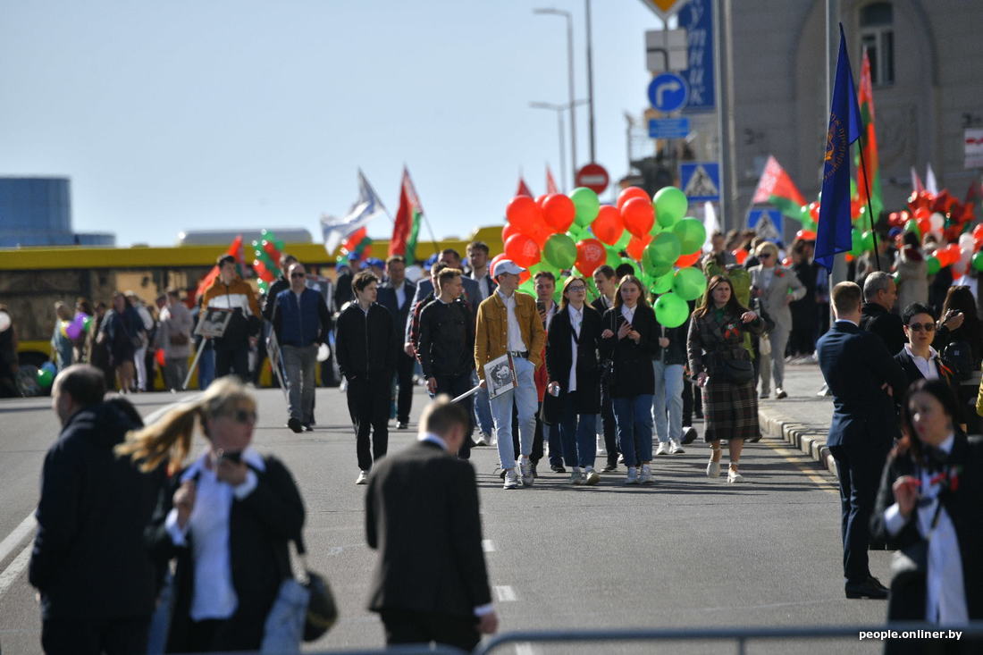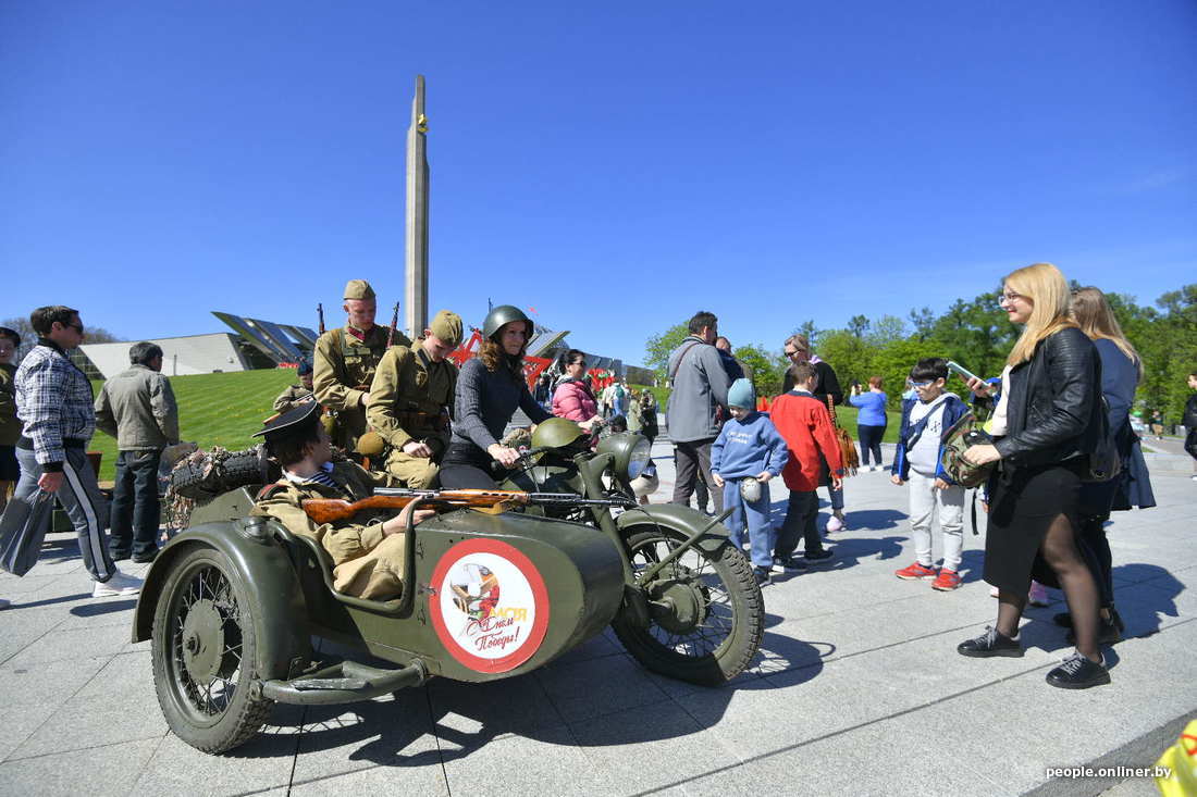 От Октябрьской площади колонны людей пришли к площади Победы. Здесь Александр Лукашенко приветствовал ветеранов и всех участников шествия, возложил венок к монументу Победы и выступил с речью.