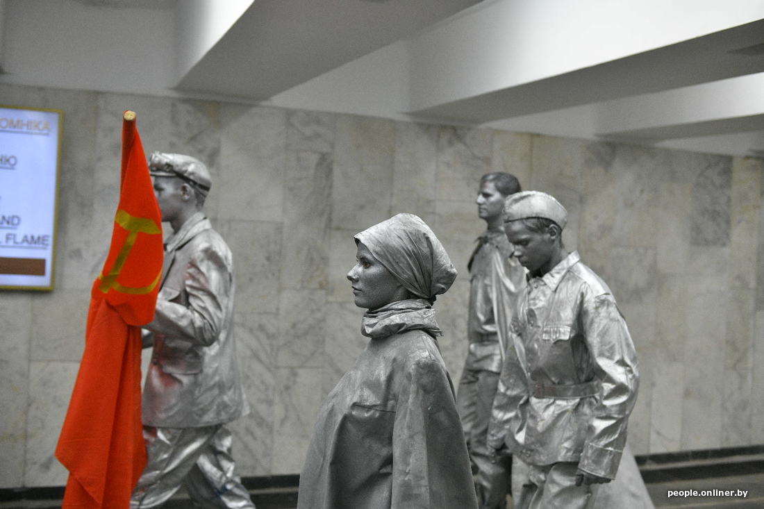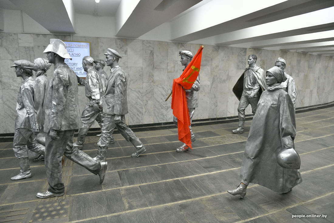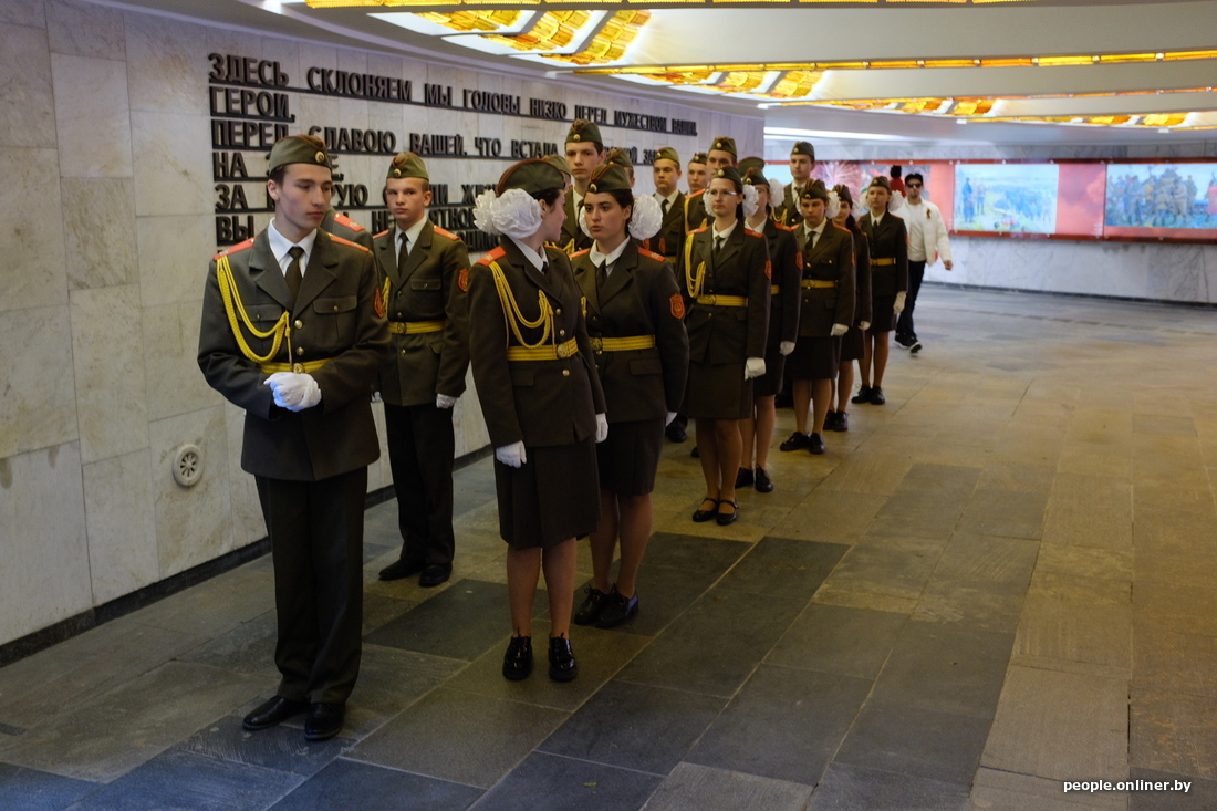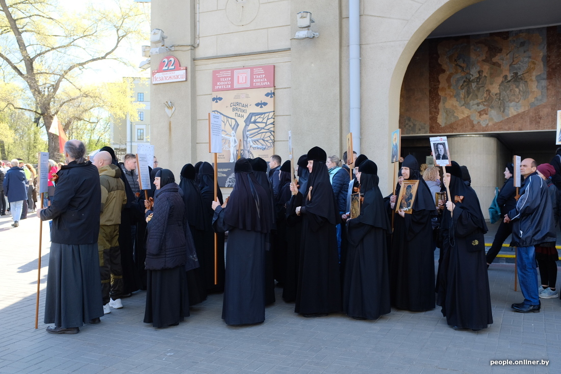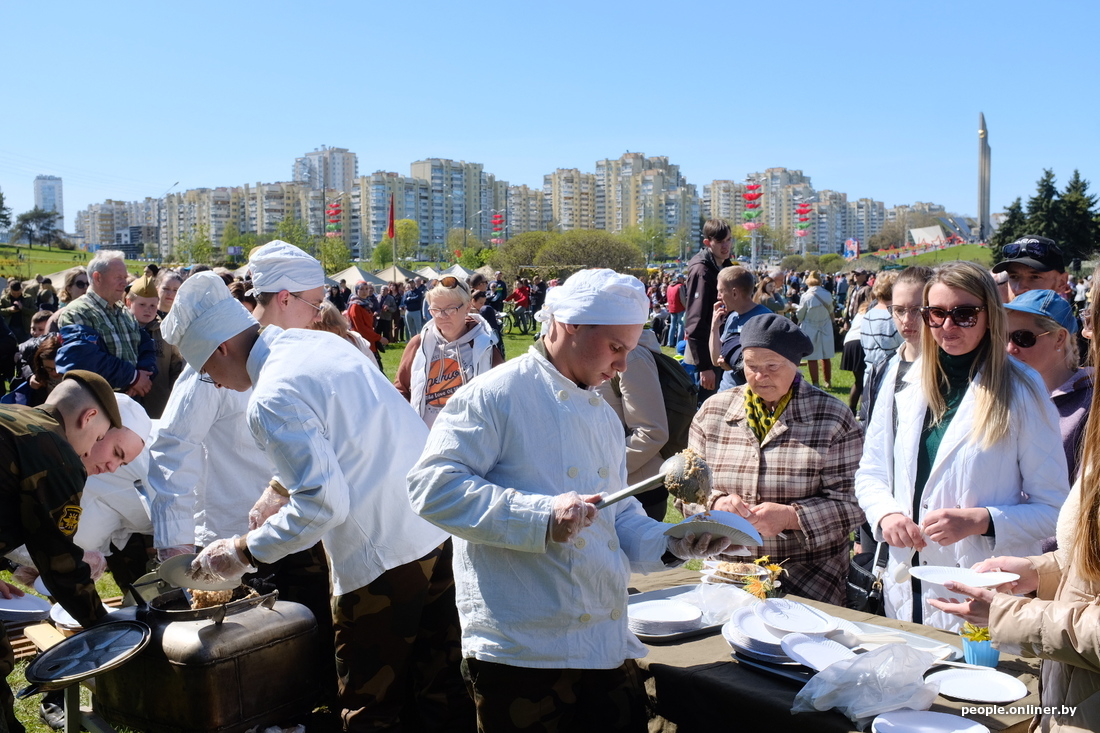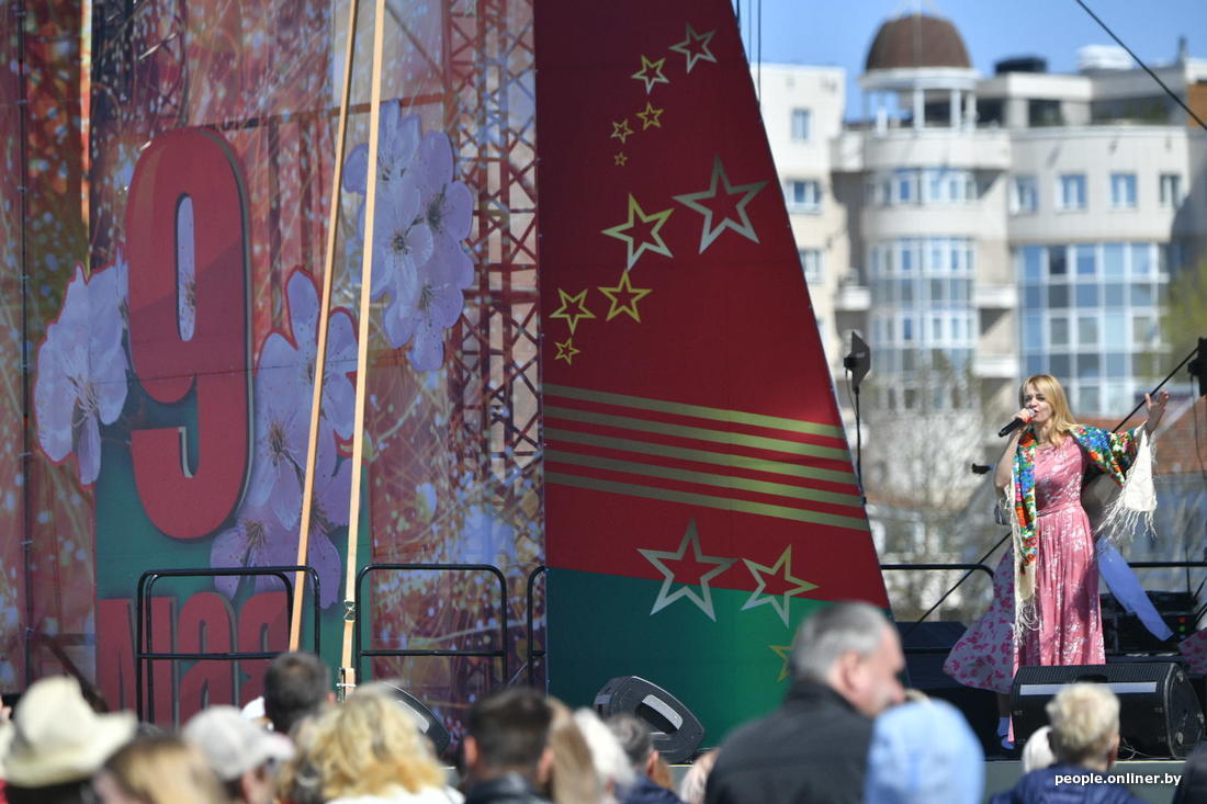От Октябрьской площади колонны людей пришли к площади Победы. Здесь Александр Лукашенко приветствовал ветеранов и всех участников шествия, возложил венок к монументу Победы и выступил с речью.