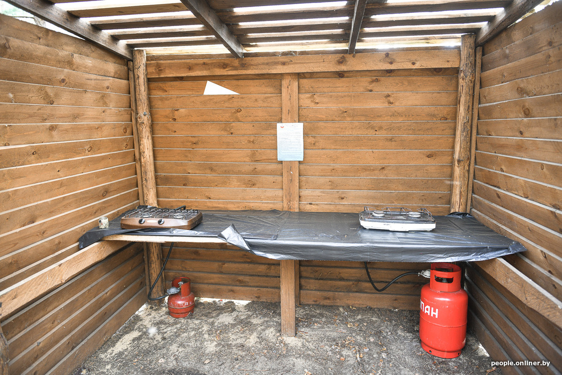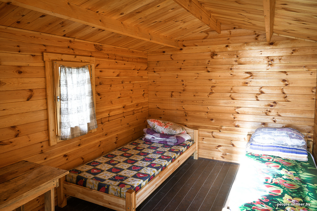 За то, чтобы поставить палатку, берут 7 рублей с человека. Дрова бесплатные, но их нужно колоть топором самостоятельно. Топор платный — 5 рублей. Но нарубить дров можно на рублей 100, если переводить количество расколотых в такие же объемы купленных в магазине. Еще тут есть домики на несколько персон, за троих мы отдали 55 рублей (плата за кемпинг входит в стоимость). Дом с подогревом, даже душновато внутри. За аренду беседки с мангалом придется отдать 5 рублей.