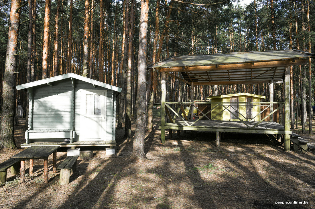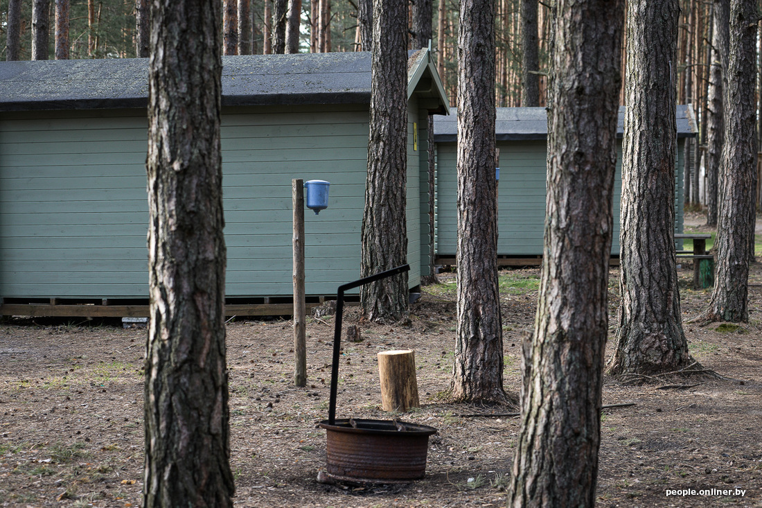 Пляж песчаный и чистый. Место под палатку можно выбрать где угодно: среди беседок и мангалов или в глубине леса (там мягче — там мох). Разместиться в своей собственной тканевой пещере можно за 10 рублей с человека. Спальные мешки, коврики, котелок, дрова да и саму палатку здесь выделят за дополнительную плату. Так что тащить с собой ничего, кроме денег и еды, не нужно.