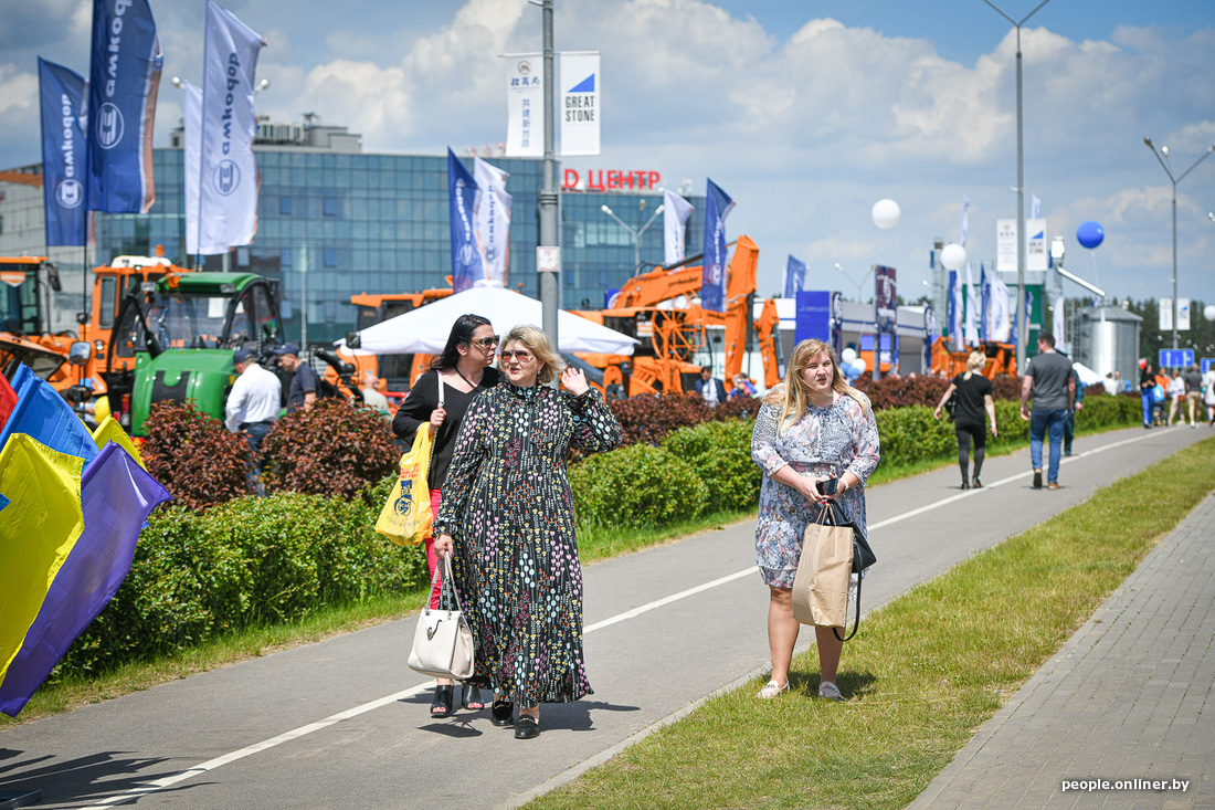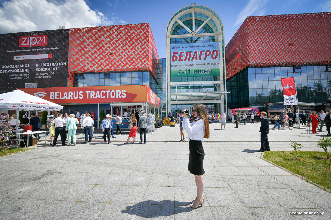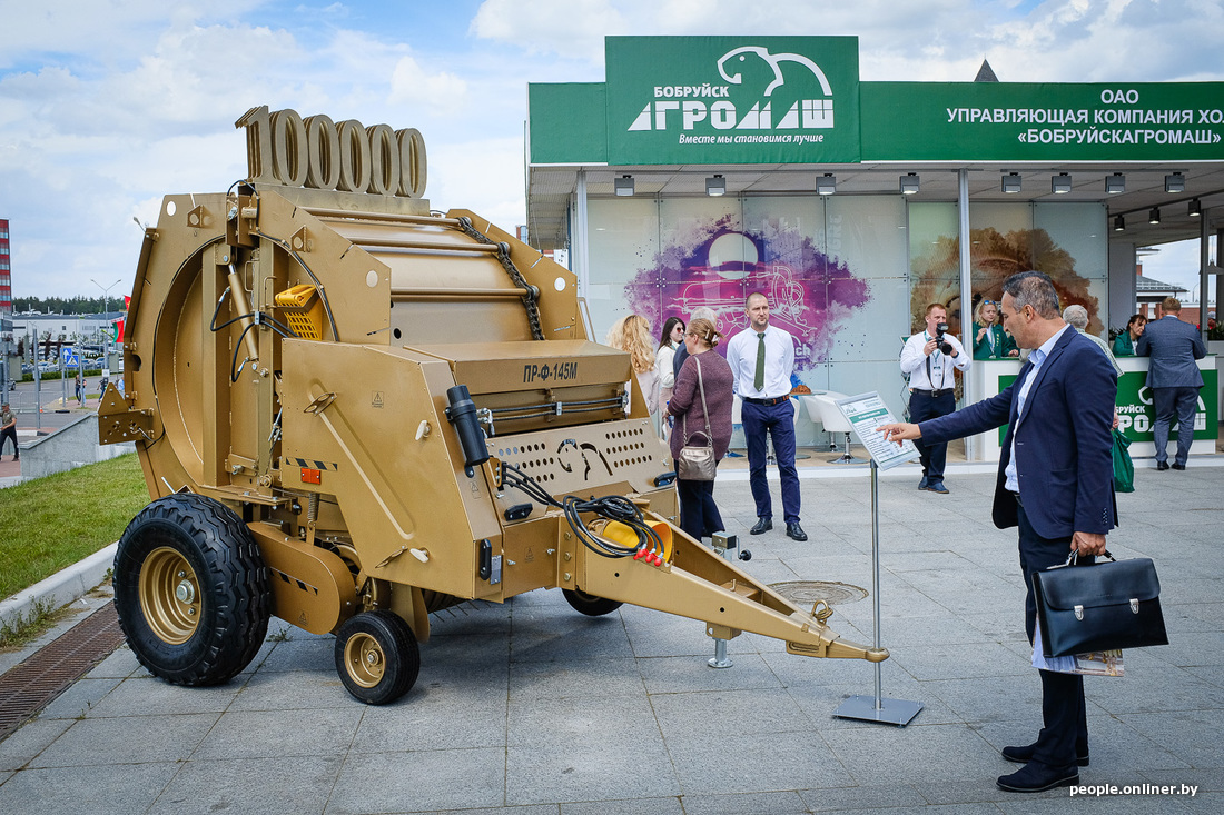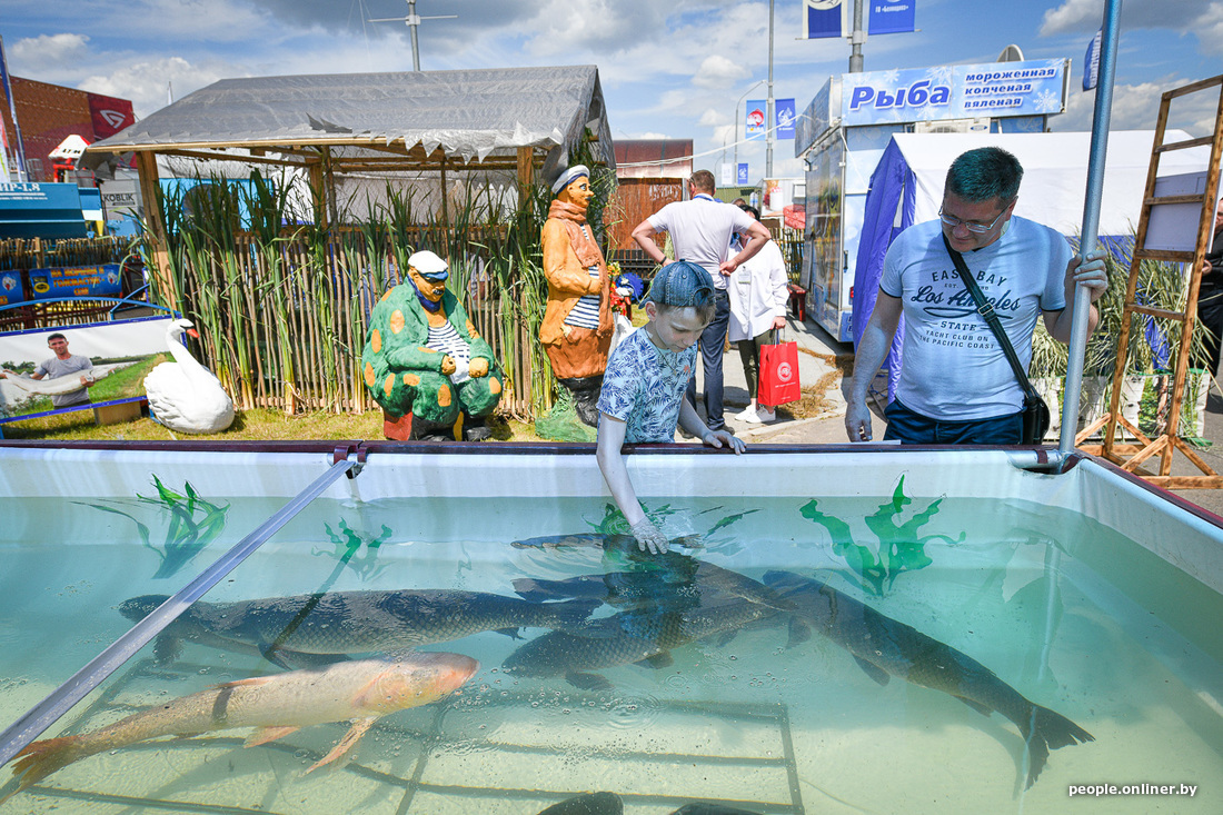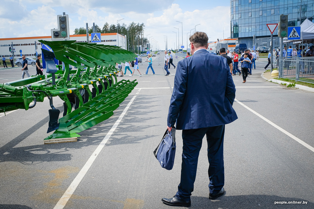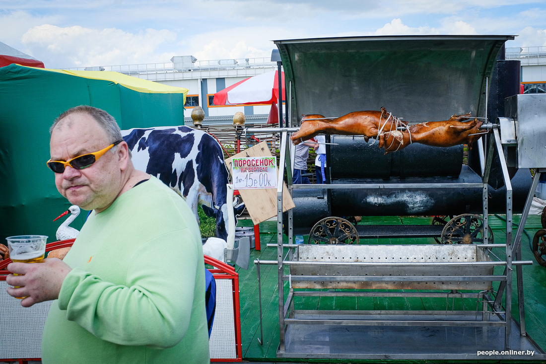 Место у парадного входа традиционно отдали титанам белорусской промышленности, импортную технику оставили за углом. На заднем дворе зверинец: бычки, свиньи, петухи, рыбы — все как на подбор.