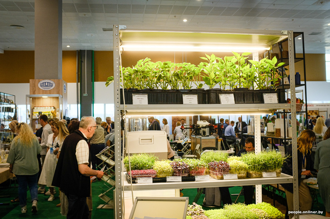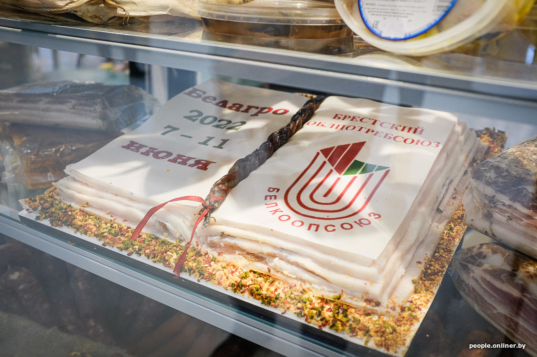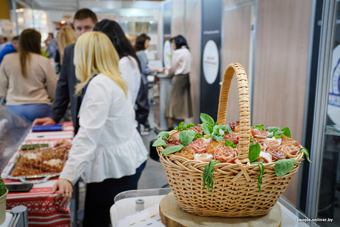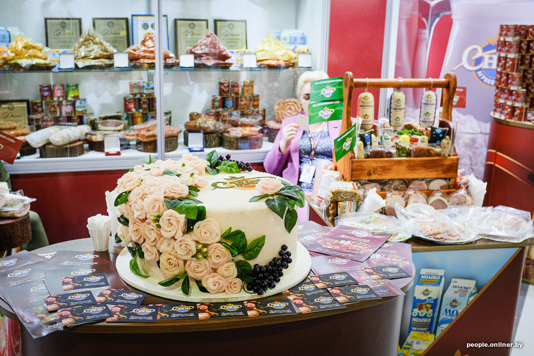 Внутри манежа собраны феерические торты из колбасы, сахара, шоколада, мяса и сала. Гости выставки могут попробовать сыр, конфеты, колбасу, мороженое, микрозелень и даже алкоголь (совсем чуть-чуть). Тут можно пополнить запасы отечественных продуктов — начиная от тушенки и заканчивая шоколадками.