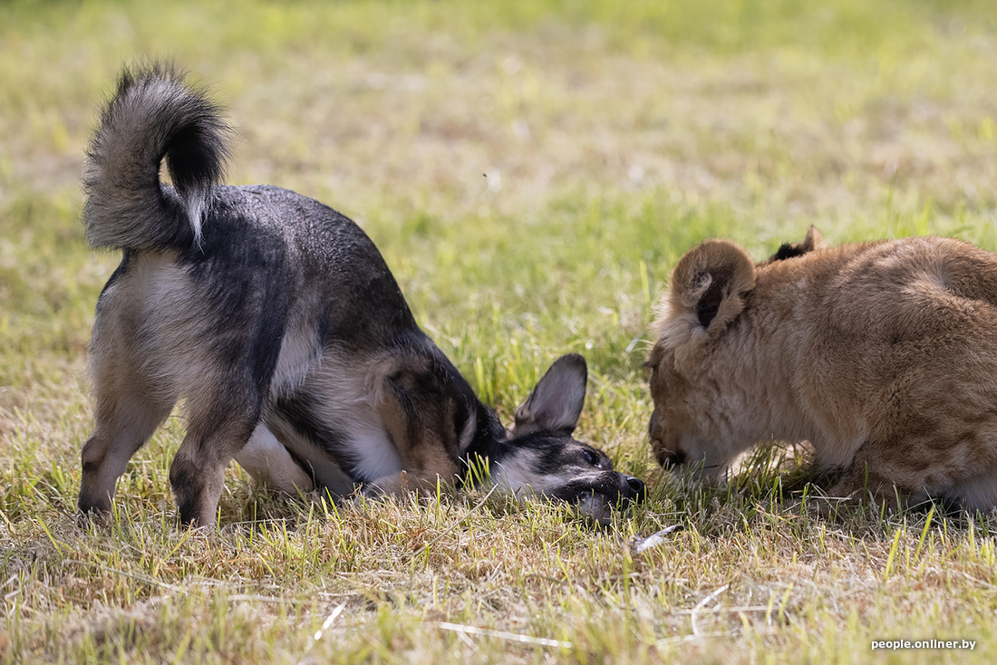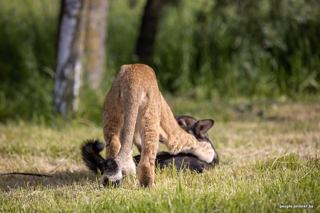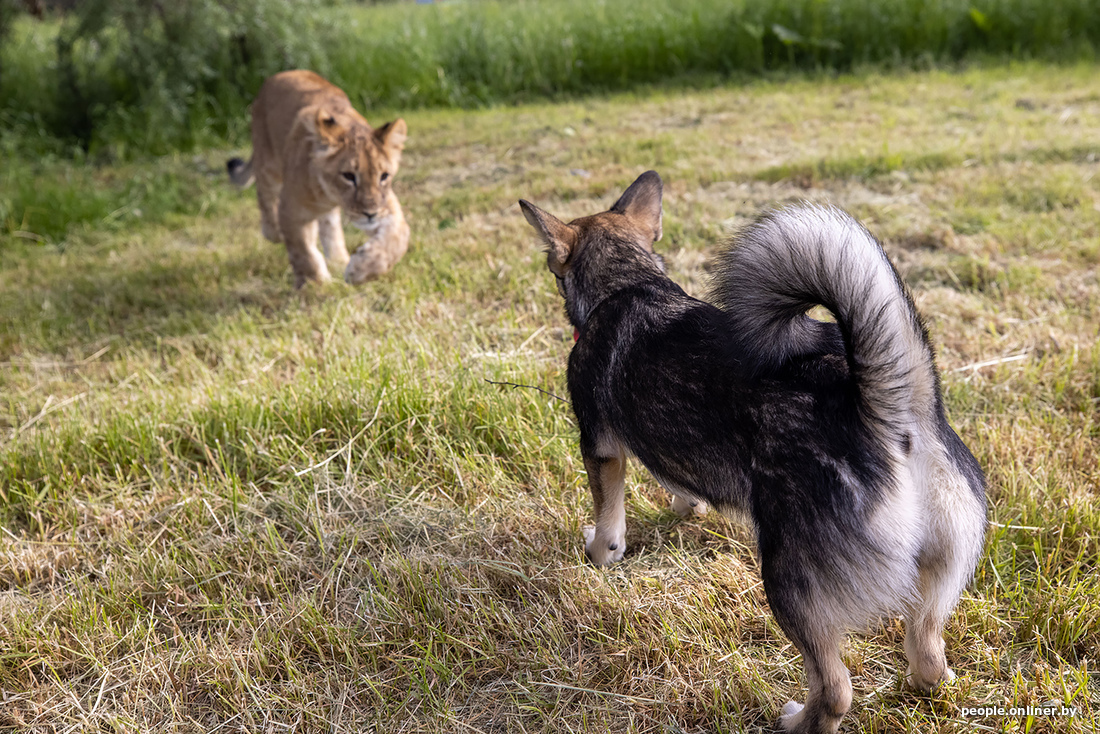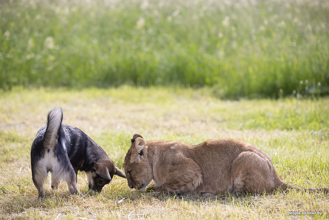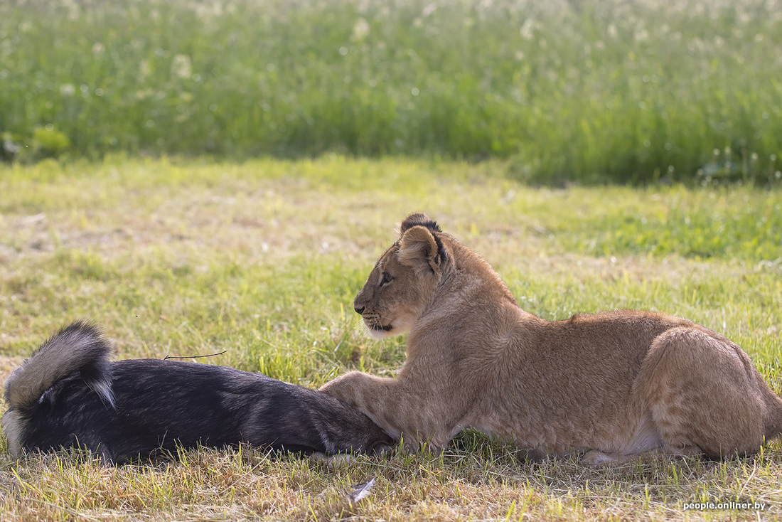 В минском зоопарке образовалась семья. К сожалению, не благодаря счастливому случаю. Маленькая львица потеряла маму, и практически сразу к ней подселили «сестренку» — щенка. Теперь они живут вместе. И похоже, счастливы.