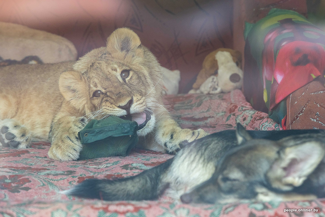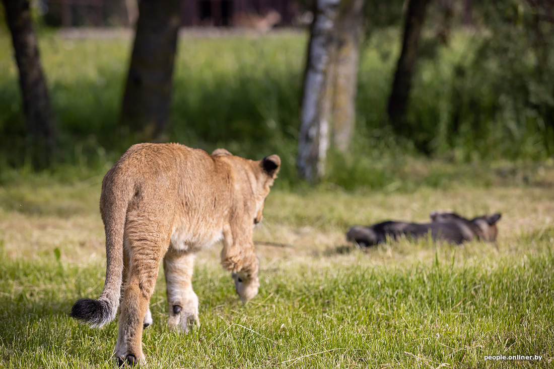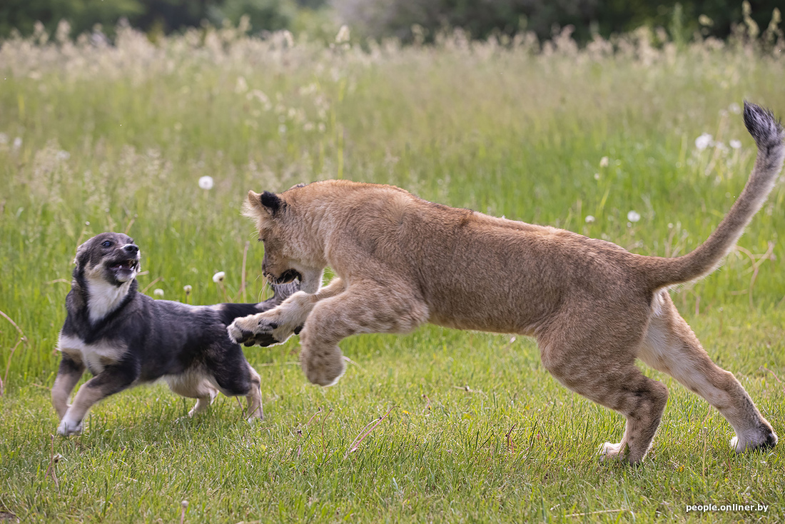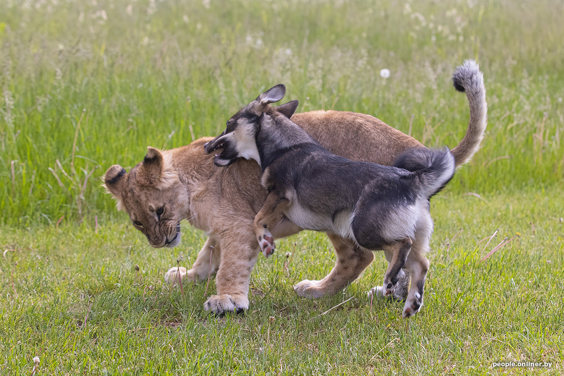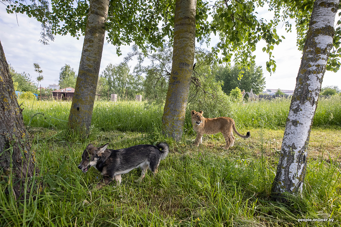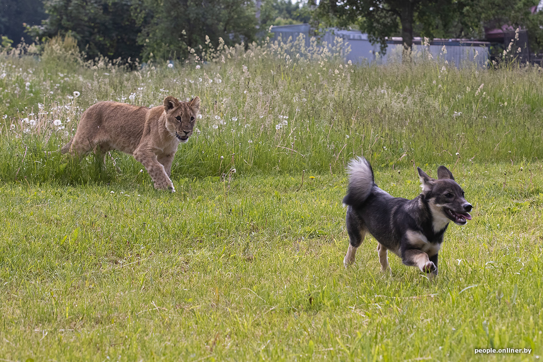 В минском зоопарке образовалась семья. К сожалению, не благодаря счастливому случаю. Маленькая львица потеряла маму, и практически сразу к ней подселили «сестренку» — щенка. Теперь они живут вместе. И похоже, счастливы.