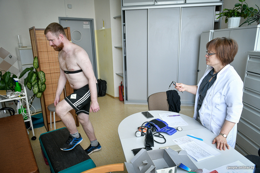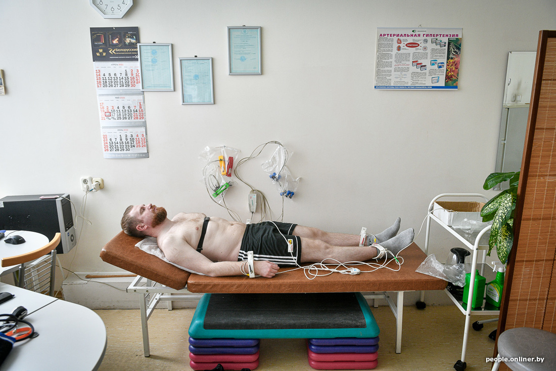 Вообще, думал, что просто полежу на кушетке, ко мне присоединят датчики — и на этом мой поход к врачу будет окончен. Но не тут-то было. Для того чтобы понять, какие физнагрузки мне необходимы, пришлось выполнить ряд упражнений вроде глубоких приседаний, жима динамометра, подъемов под метроном на стэп-платформу, после чего оперативно замеряли давление. Вердикт оказался не самый обнадеживающий. С давлением все нормально, но для человека, который когда-то занимался спортом, я не совсем гибкий, из-за пролапса есть небольшие проблемы с сердцем, и объемы тренировок мне нужно дозировать.