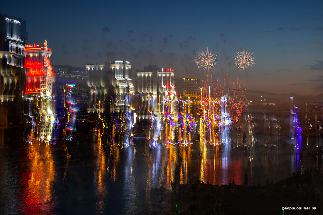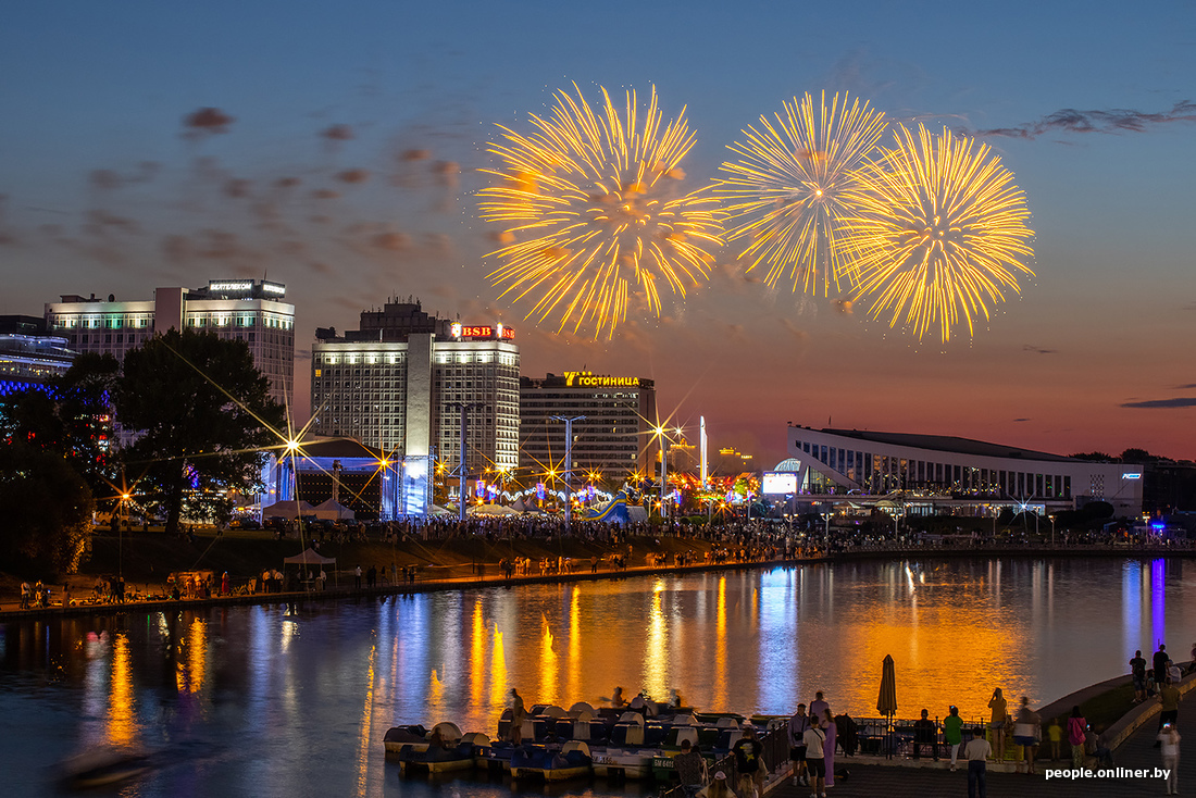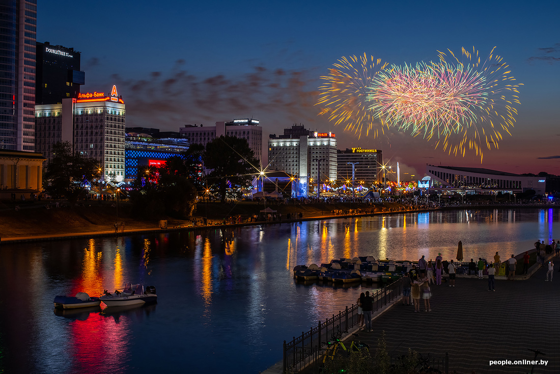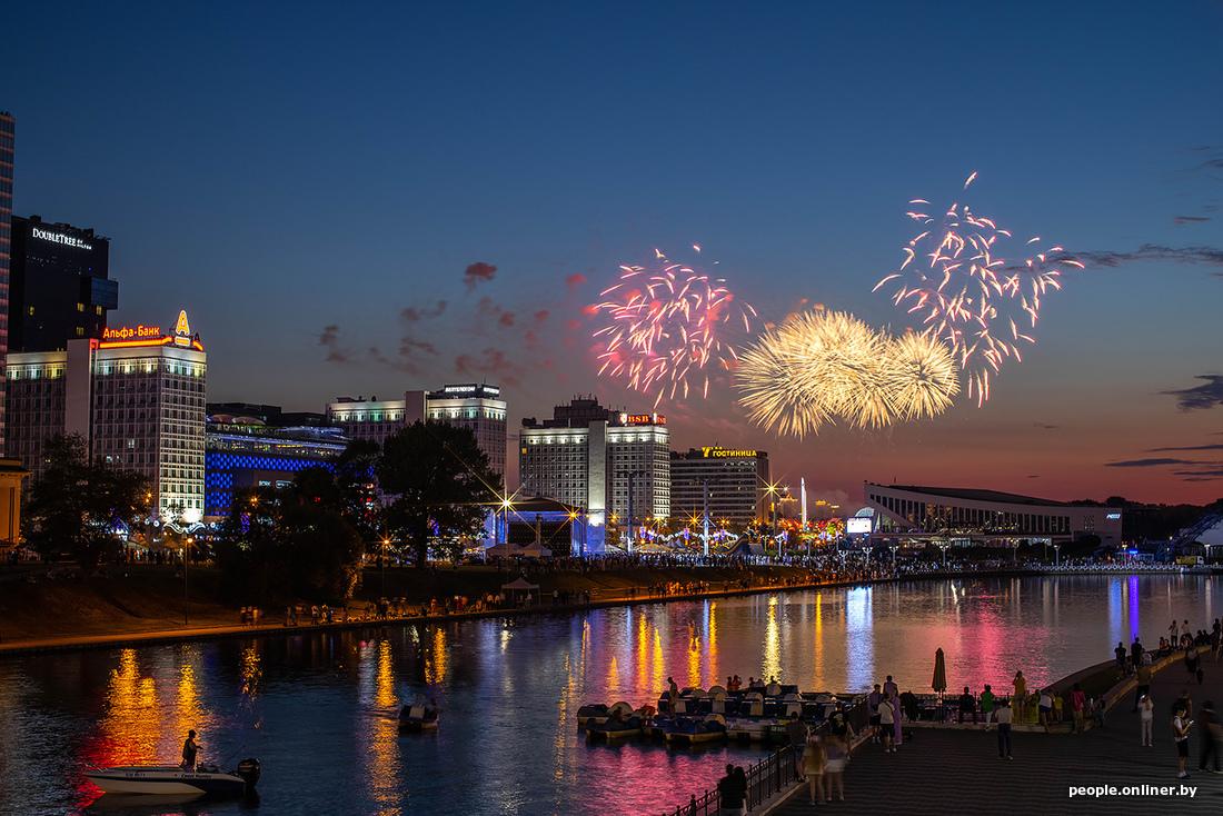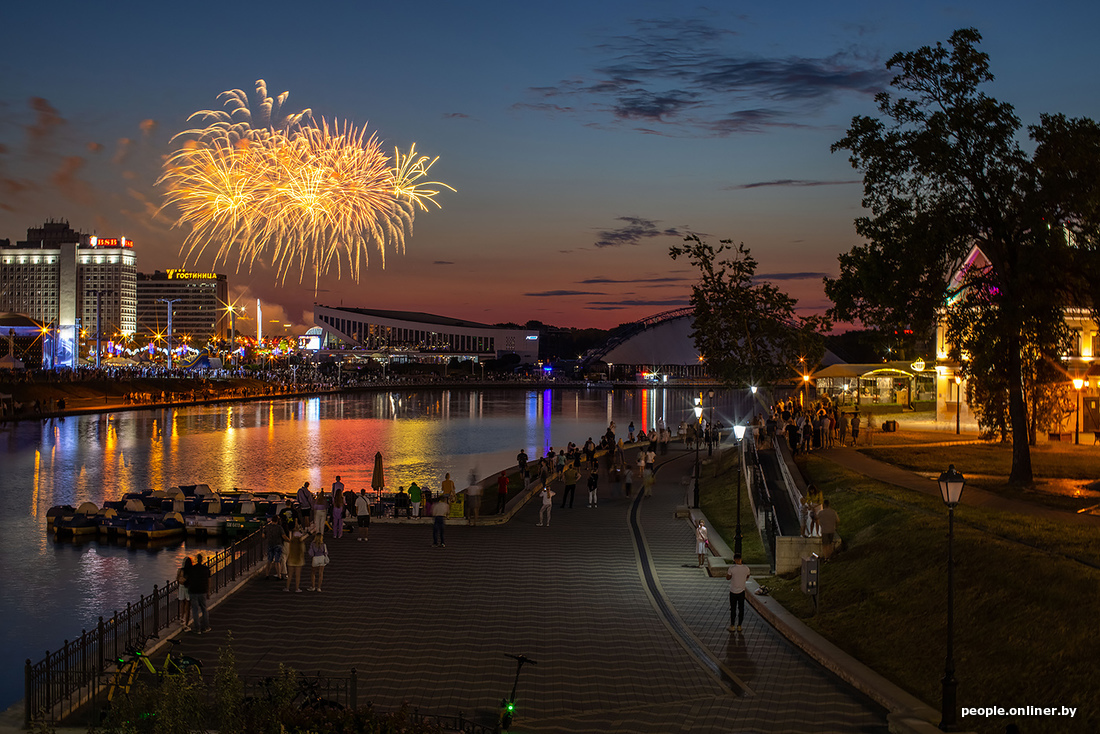 Как и было обещано, фейерверк начался в 23 часа. Залпы пускали в традиционных точках: в парке Победы и парке Павлова, на набережной в Дроздах, в парке Уго Чавеса, а также на площадках у «Чижовка-Арены» и Национальной библиотеки.