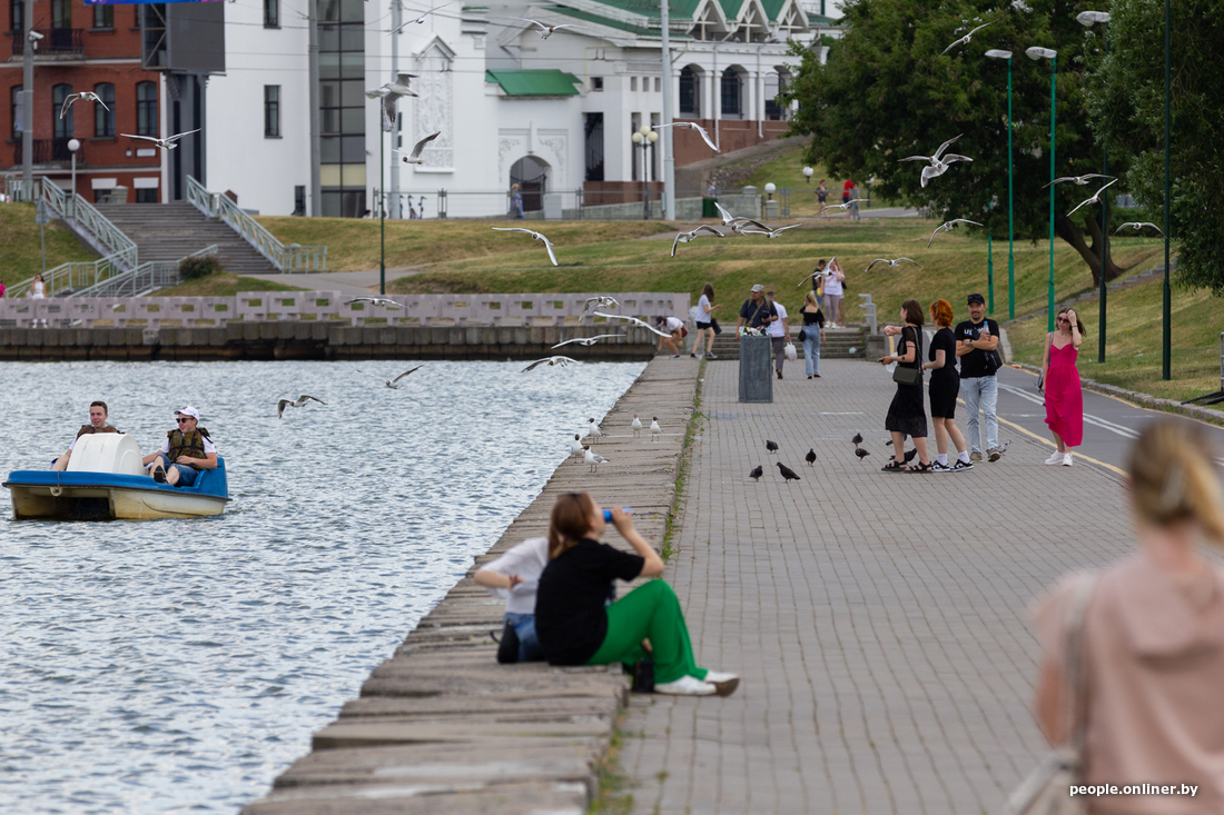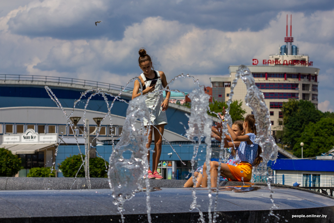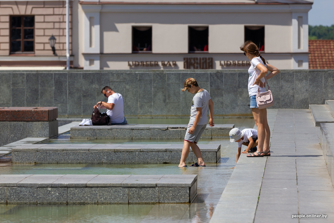 Последним фонтаном, в который мы погрузили полоску, стал тот, что находится на Немиге. И если в других местах люди еще как-то стеснялись и погружали в воду лишь свои конечности, то здесь не пропихнуться. Дети, молодежь, все струится, брызгается, шумит. Это чуть ли не общественное джакузи в центре города.