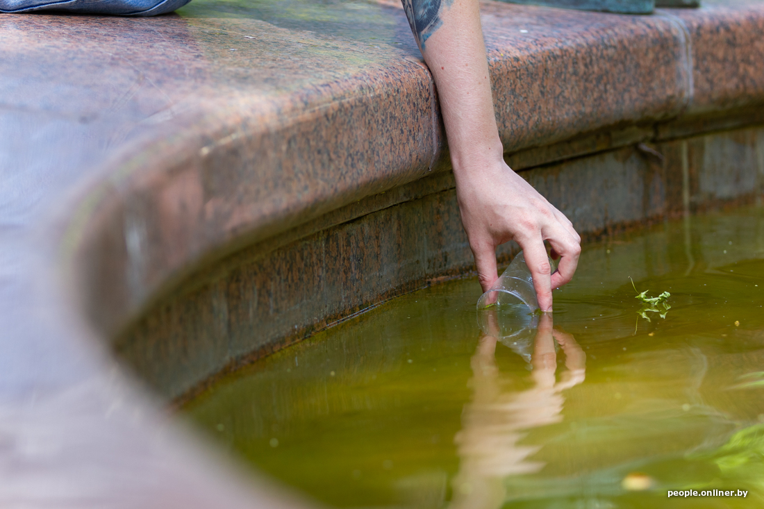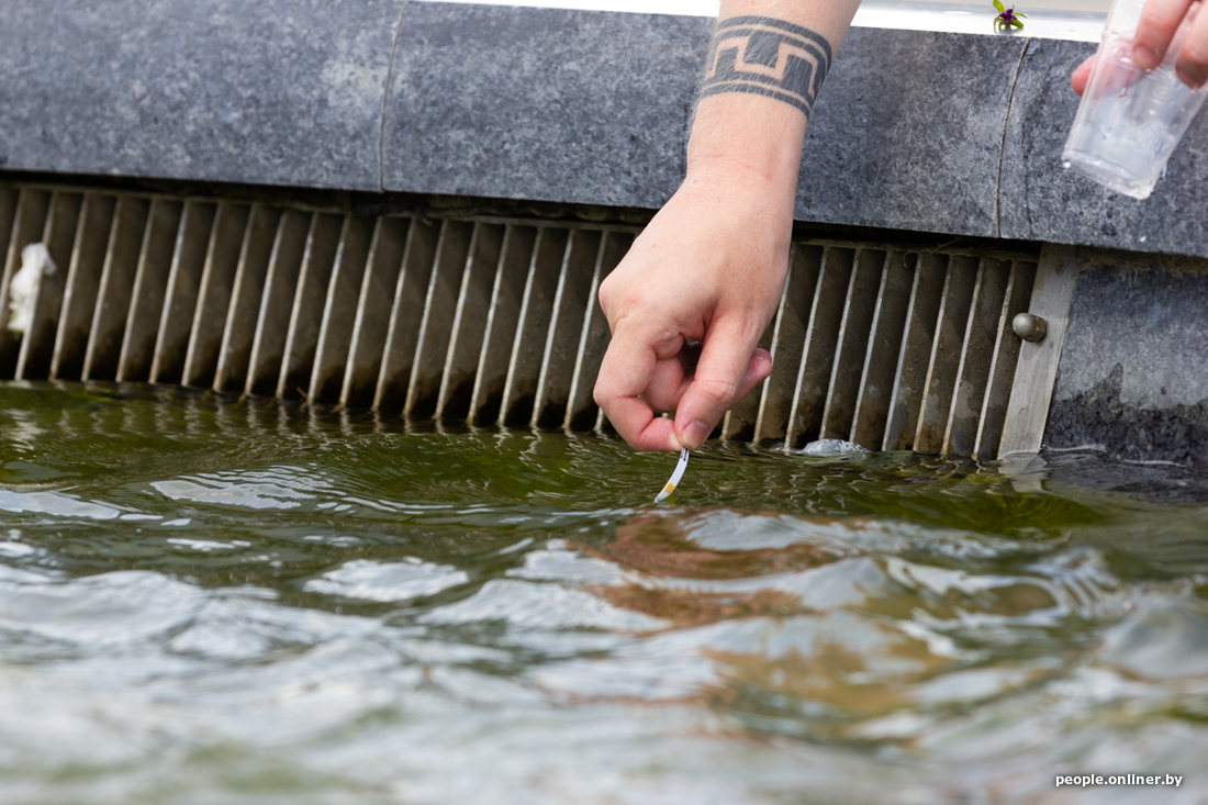 А отличаются ли вообще в плане воды фонтаны от той же реки или домашнего крана? Может, мы зря катим бочку на всех этих мальчиков и лебедей? Вода в Свислочи и без тест-полоски не внушает доверия: зеленая, мутная, почти как гороховый суп, она единственная, которая не улучшилась в пластиковом стакане.