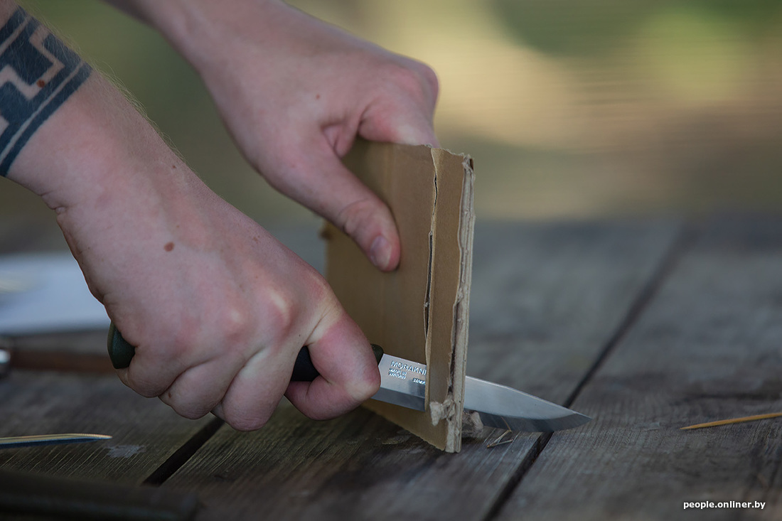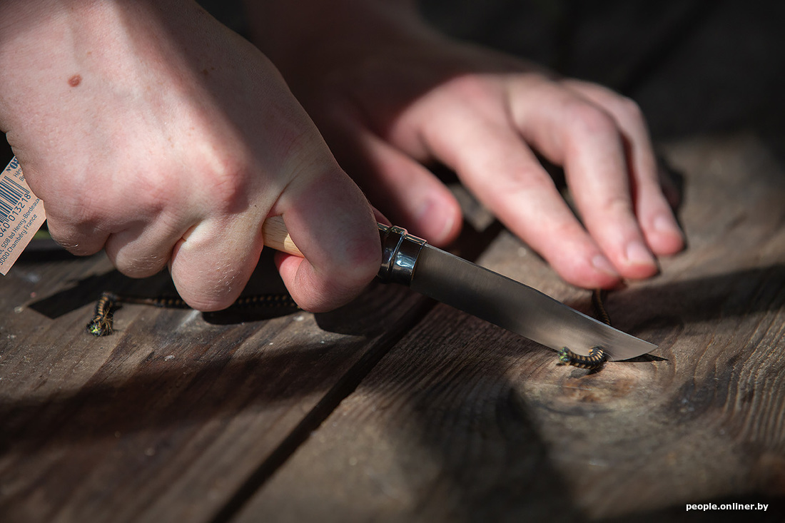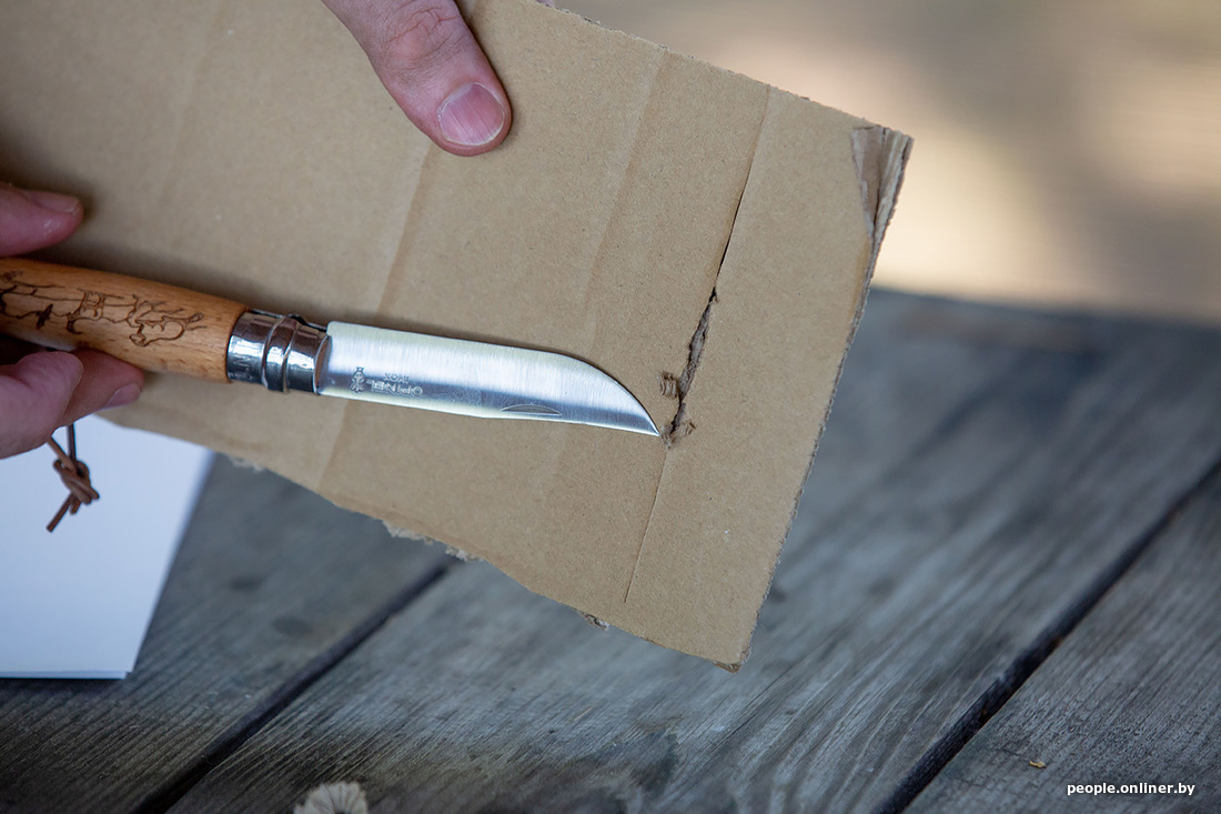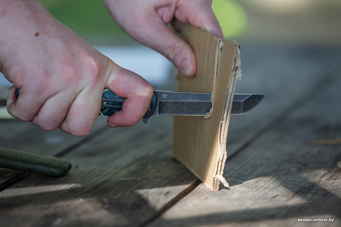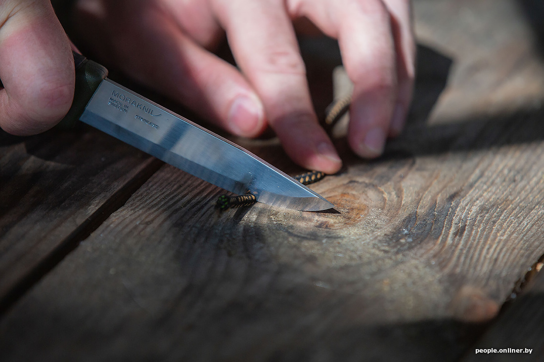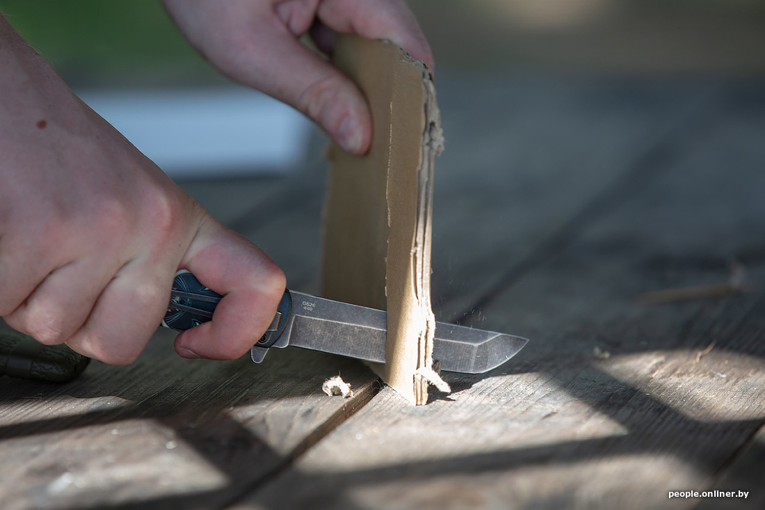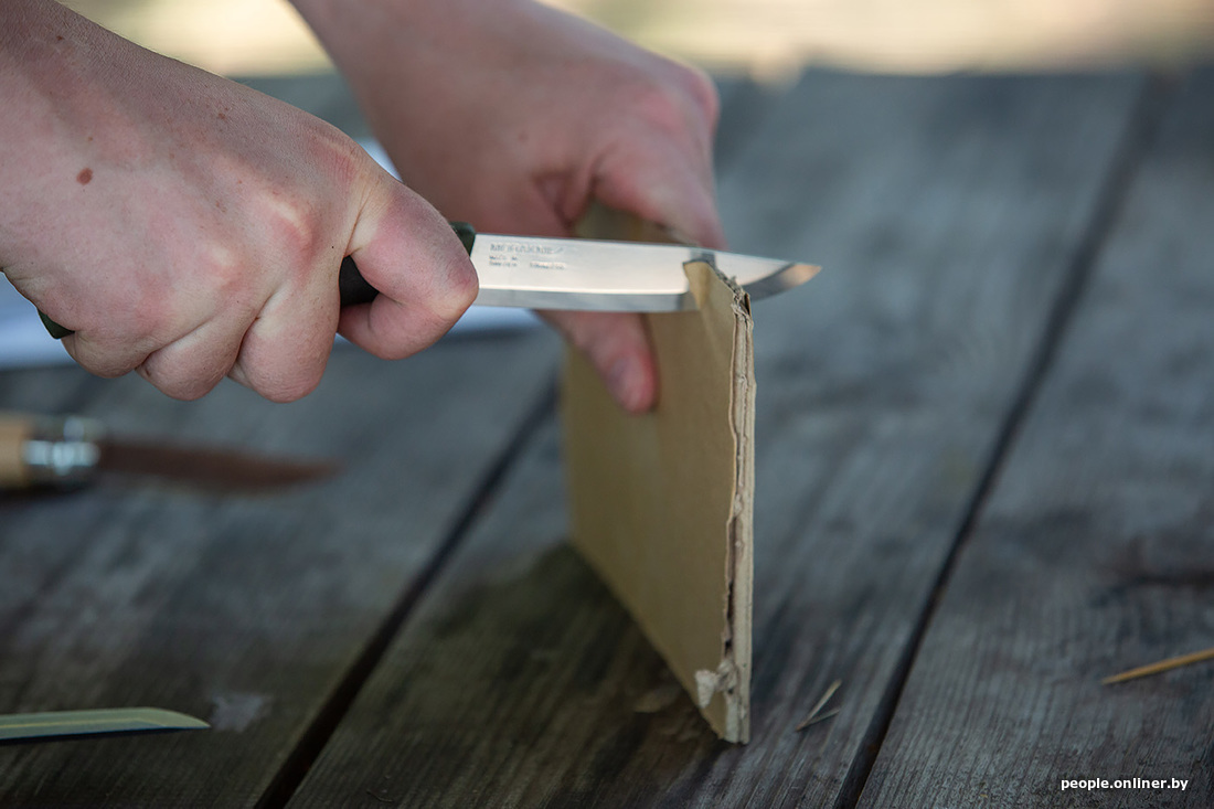 Раз уж мы заговорили про уху, то рыбу нужно как-то разделывать. С собой мы взяли аж пять ножей, проверяли на дереве (конкретно — на картоне) — все справились на ура. Затем был корд — в него все лезвия входили, как в масло. Шнурок расчленили. Консервы открывать ими уже не стали: не для этого их на станке вытачивали.