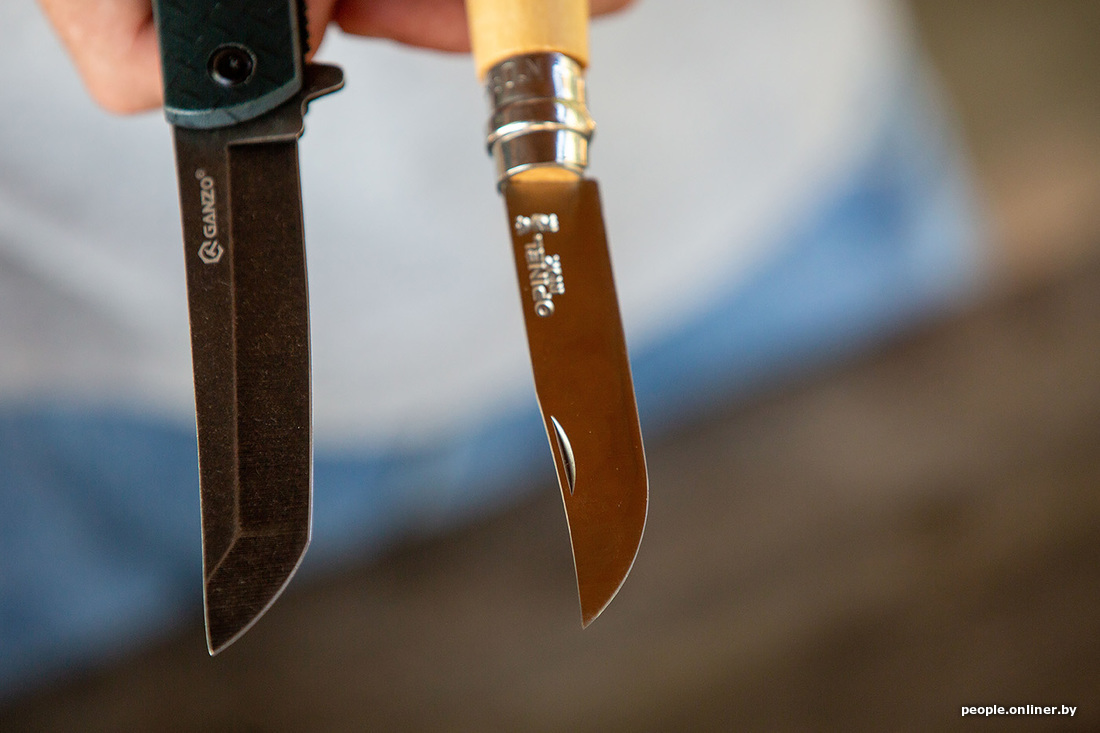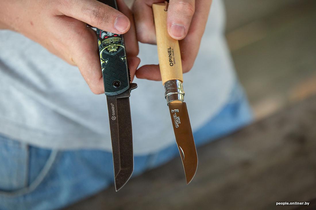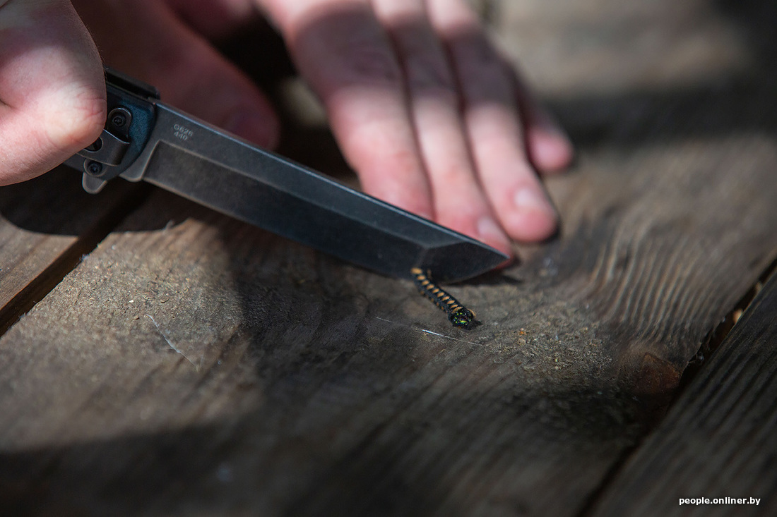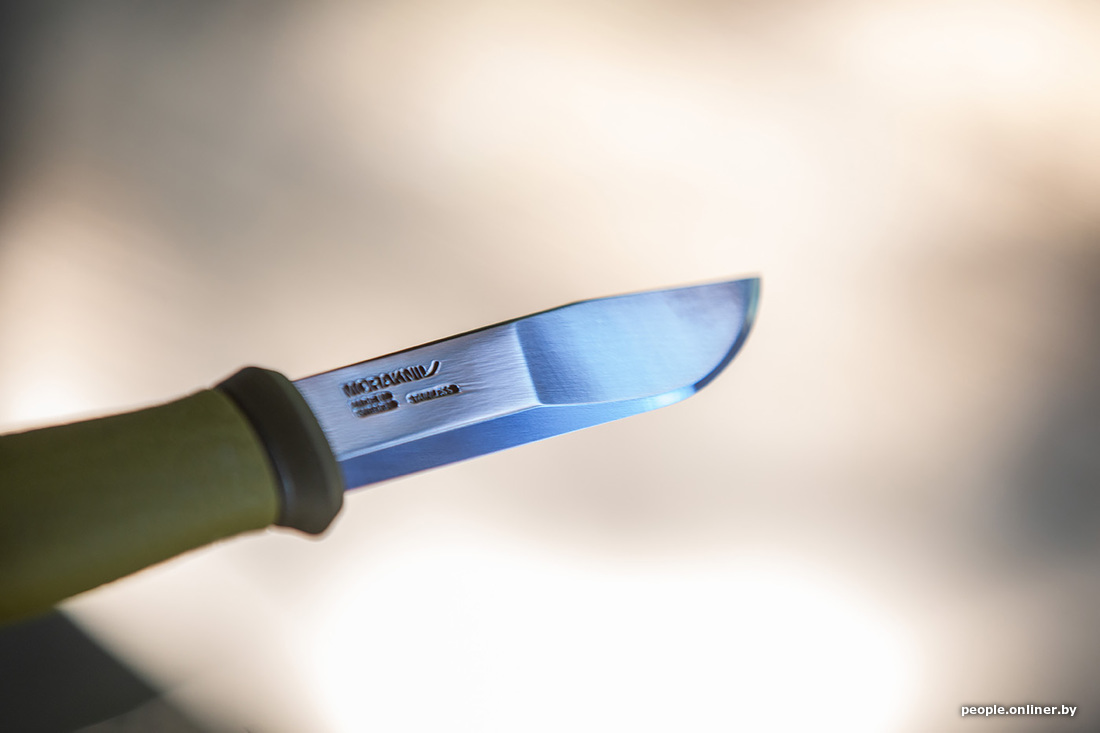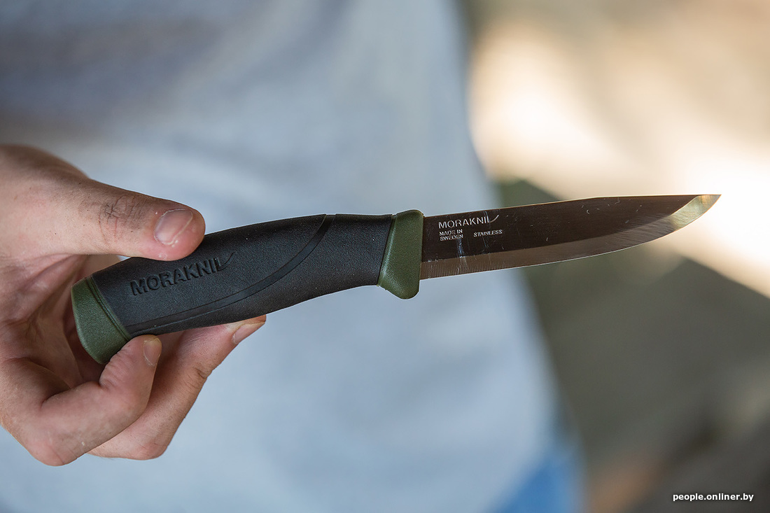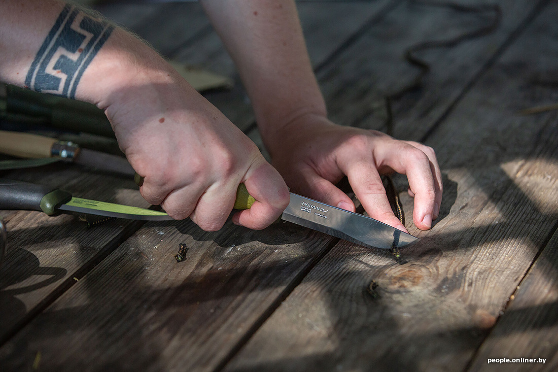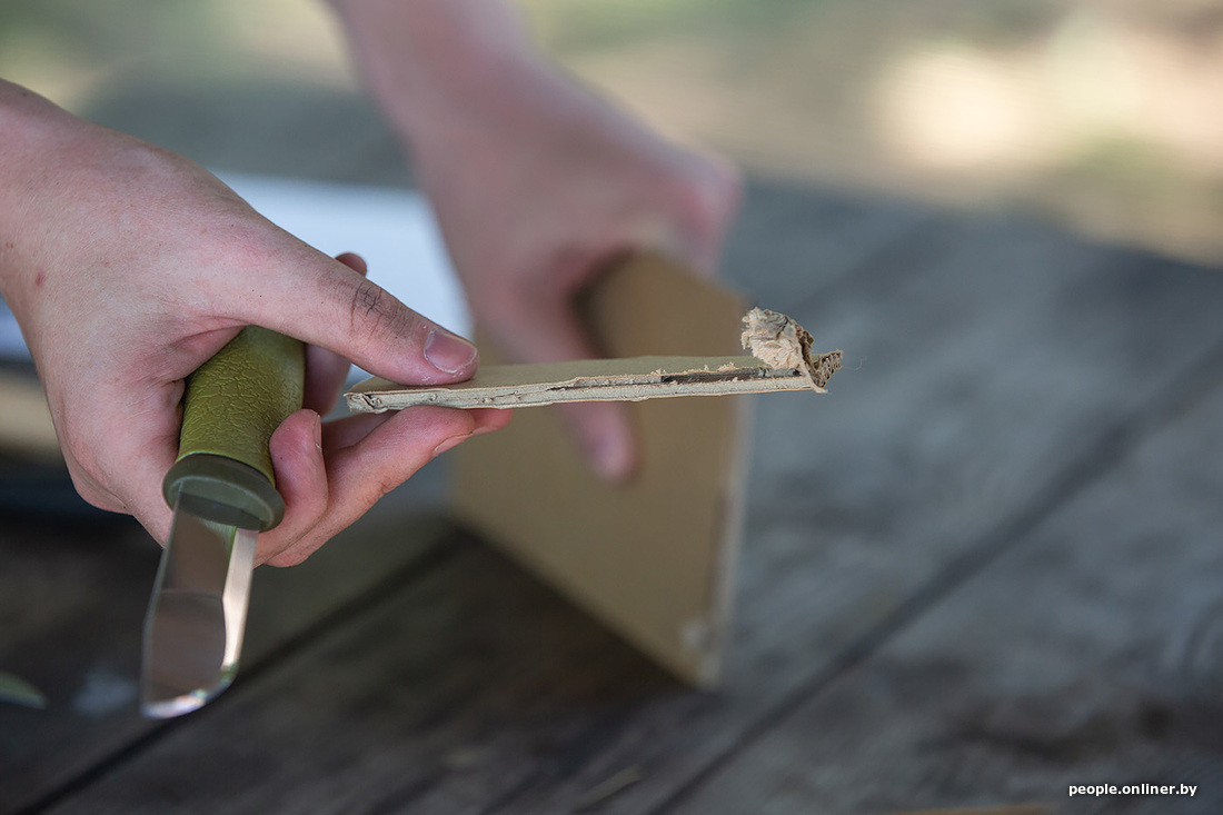 Раз уж мы заговорили про уху, то рыбу нужно как-то разделывать. С собой мы взяли аж пять ножей, проверяли на дереве (конкретно — на картоне) — все справились на ура. Затем был корд — в него все лезвия входили, как в масло. Шнурок расчленили. Консервы открывать ими уже не стали: не для этого их на станке вытачивали.