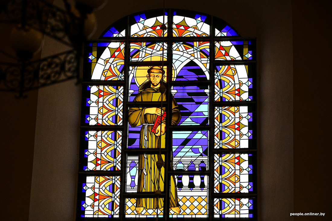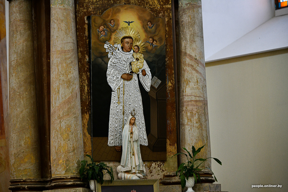 Справіўшыся, айцец Багуслаў Вуйтовіч выйшаў да нас у сваім цёмным габіце, падперазаным белай вяроўкай, — традыцыйным адзенні манахаў-францысканцаў, падобным на балахон. Ва ўсе паданні, якія тут існуюць, ён не верыць. Зараз яго турбуюць больш актуальныя справы: ён шукае стары касцёльны арган і спадзяецца, што з дапамогай грамадскасці інструмент нарэшце вернецца дадому. Святар неўзабаве з'ехаў па справах, а з намі засталася мясцовая верніца Альфрэда Трон. Калі мы выйшлі з касцёла, спыніліся з ёй каля кляштара.