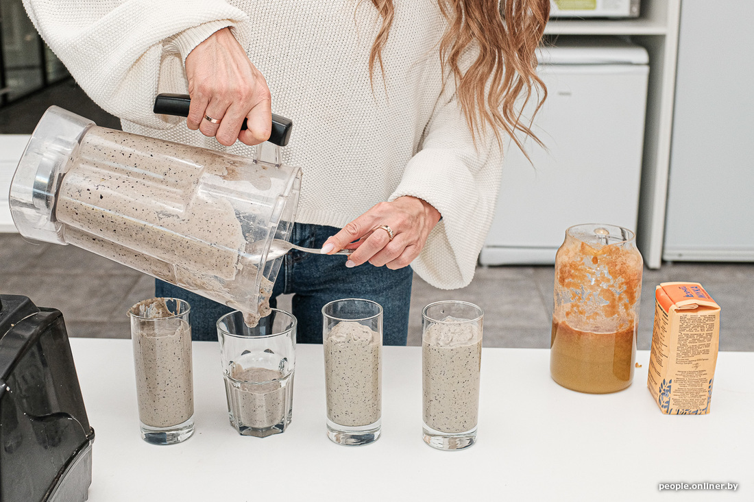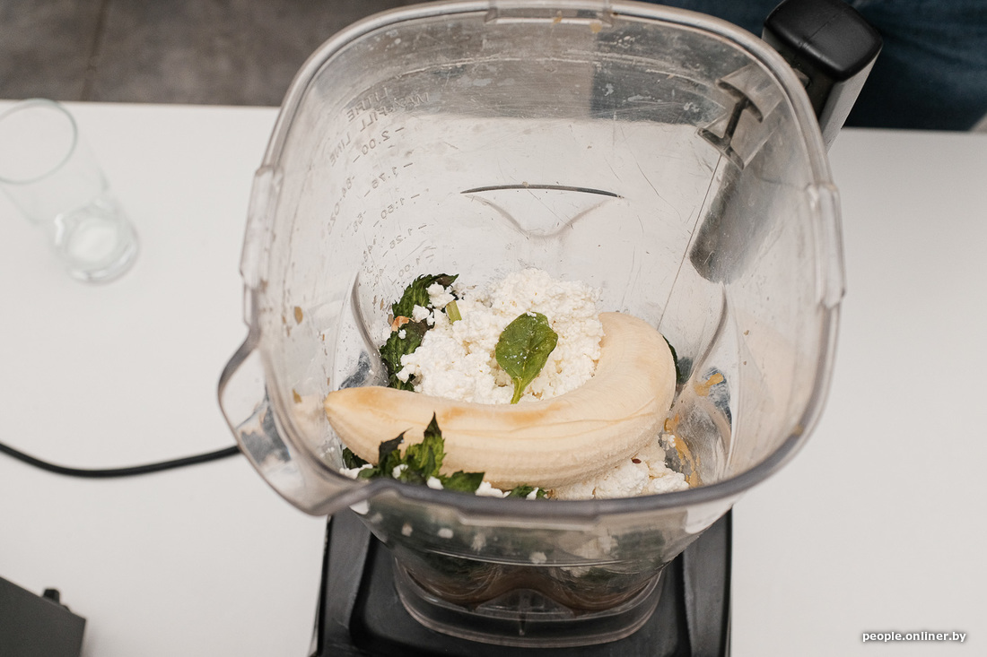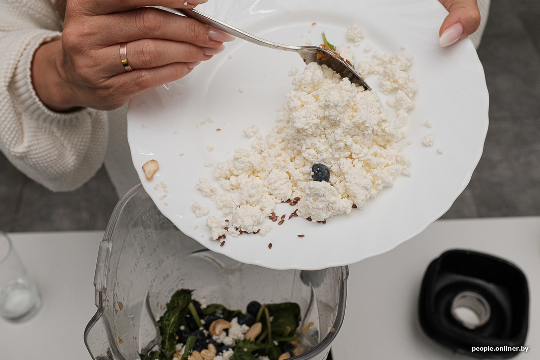 — Тут у нас исключительно полезные компоненты. В листьях шпината содержится много железа, мягкие орешки кешью — источник жиров и углеводов, голубика — это витамин C, кунжут — кальций, семена льна — омега-3, а мяту и банан добавляем для придания вкуса, — объясняет нутрициолог. — И весь этот микс мы разбавляем белком в виде творога. У нас он 5-процентный, и это, на мой взгляд, идеальный вариант. Жирнее я не бы рекомендовала, а 1-процентный тоже так себе: такое ощущение, что при производстве из него изъяли все, что можно и нельзя.