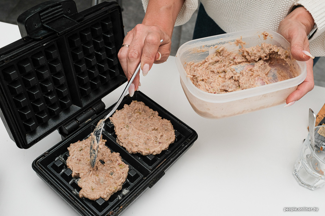 Чтобы блюдо не прилипло к поверхности вафельницы, ее можно немного смазать либо сливочным, либо подсолнечным маслом. После этого кладем тесто в вафельницу, закрываем и включаем прибор на максимальную мощность.