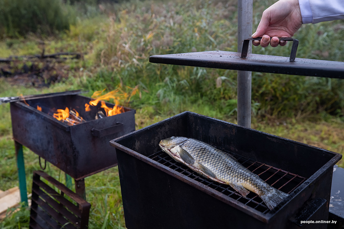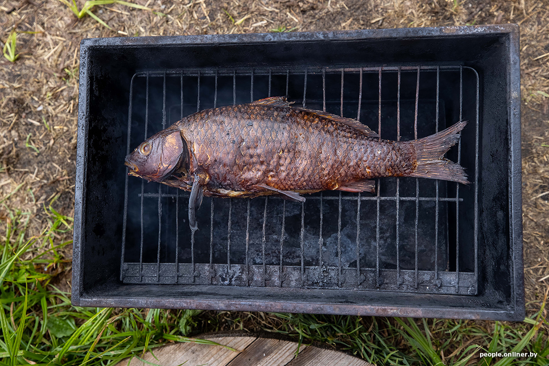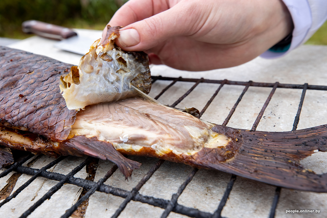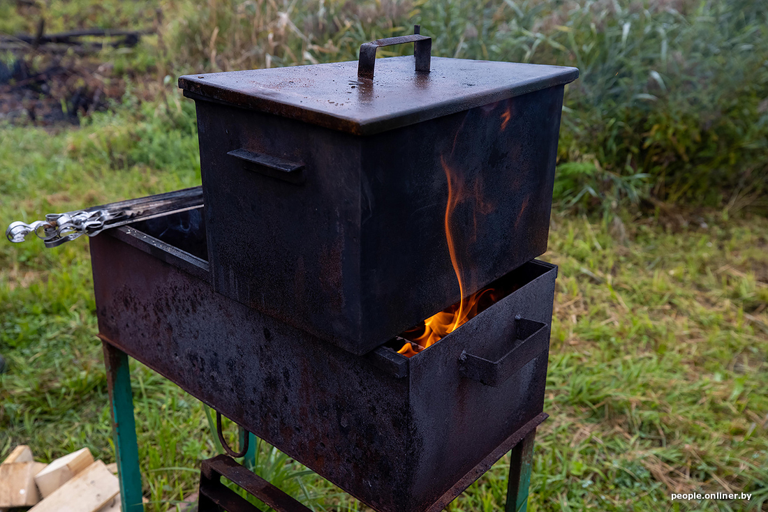 — Дым от щепы даст нужные нотки вкуса. Когда догорят угли, на них ставим коптильню, сверху закрываем крышкой и герметизируем. Коптится рыба минут 20—25 после того, как в специальную трубочку пойдет дым. С рыбой минимум манипуляций: выпотрошить и натереть специями да солью.